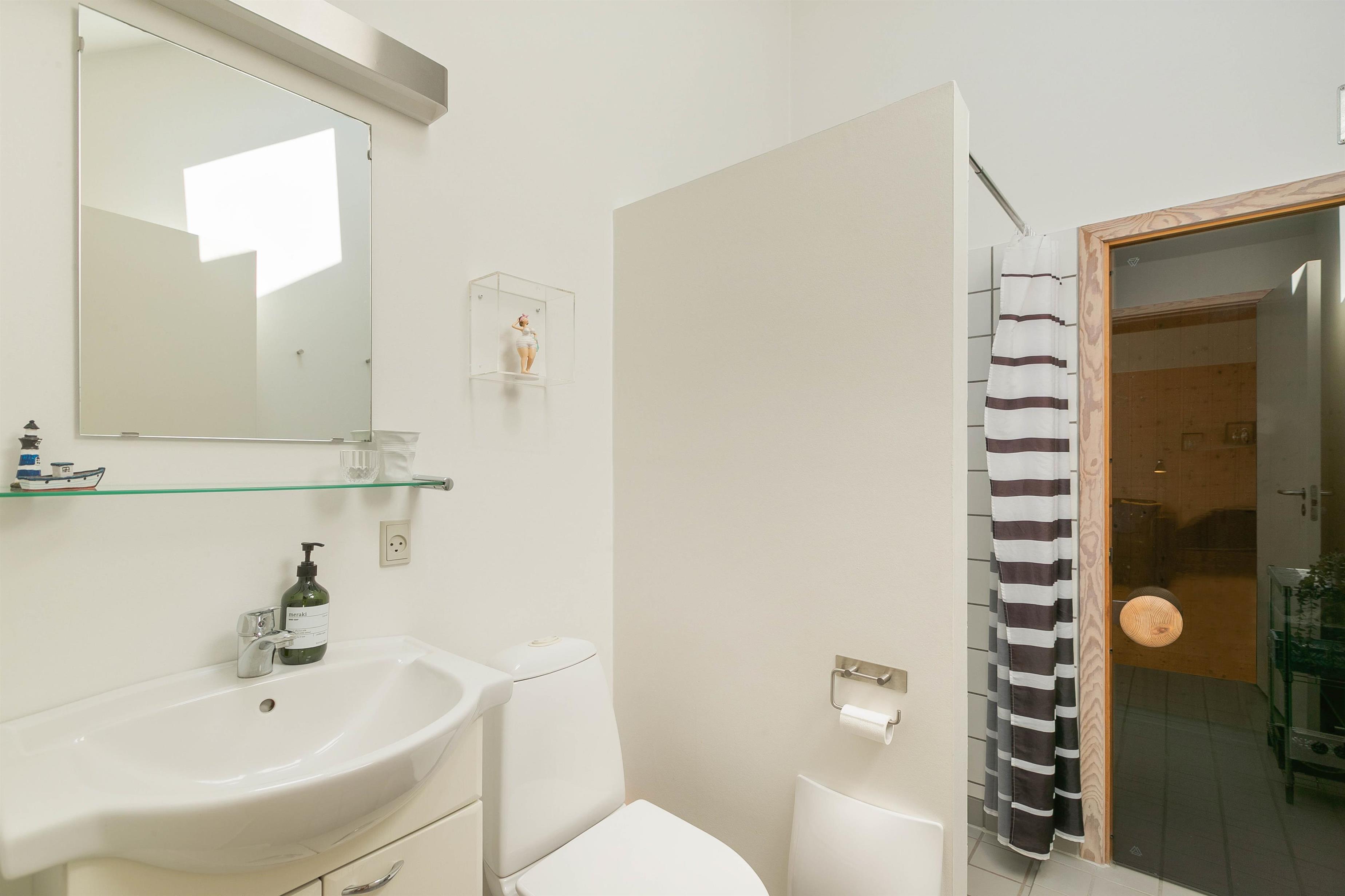 The apartment features terraces on both sides, ensuring you'll always find a sheltered spot for reading and relaxation. Large windows flood the space with natural light and provide beautiful views across the fjord. The utility room, located next to the garage, houses a washing machine and tumble dryer.