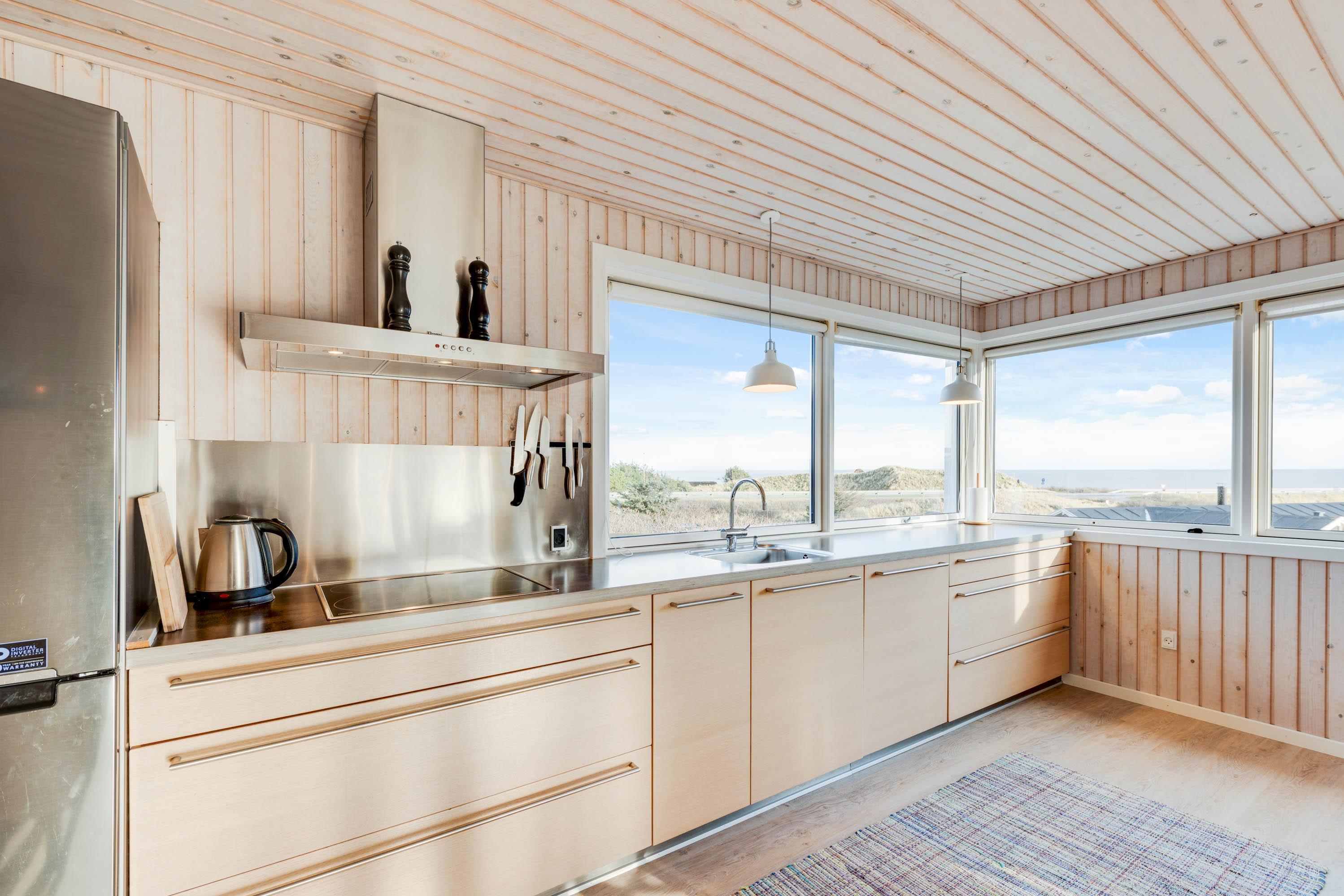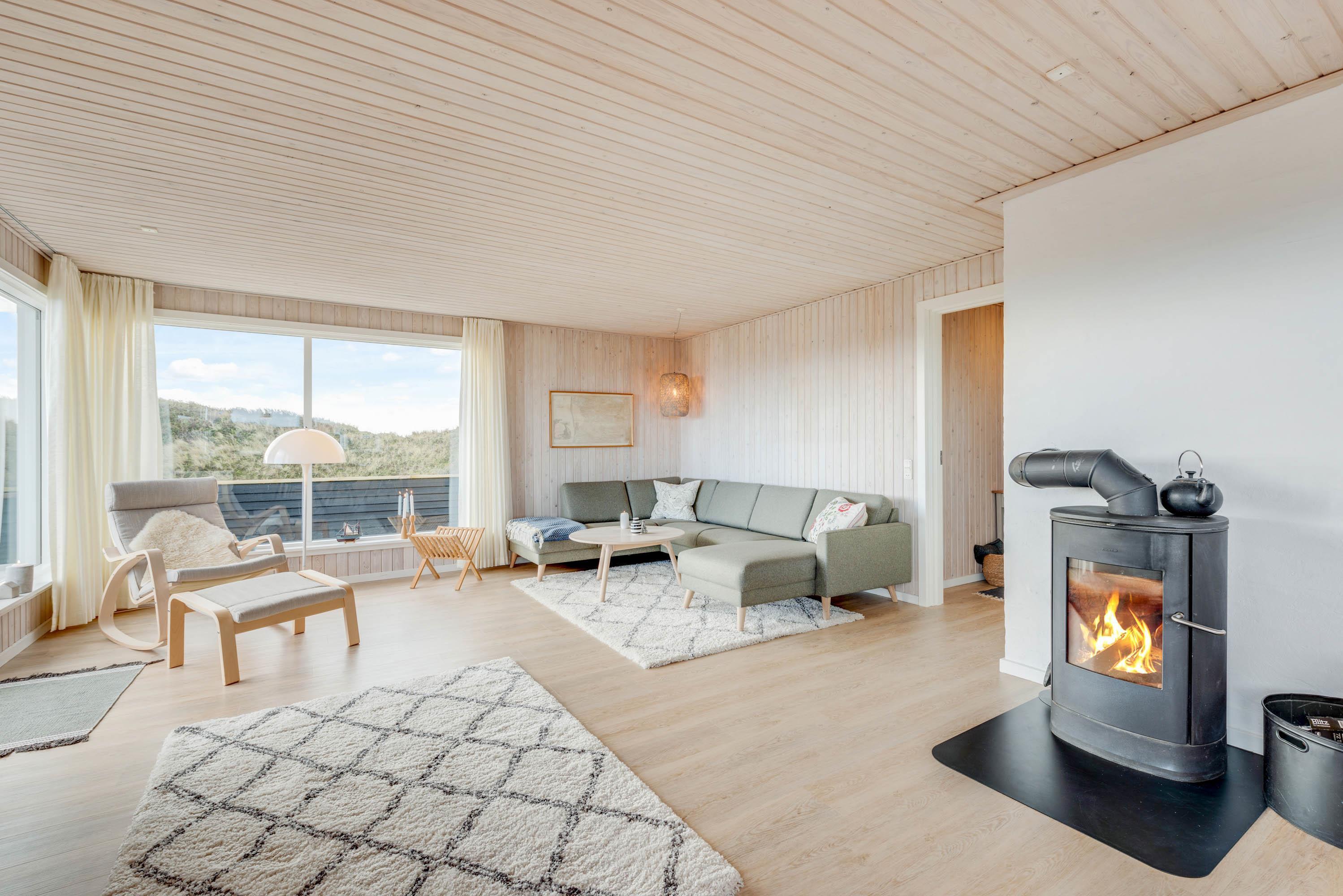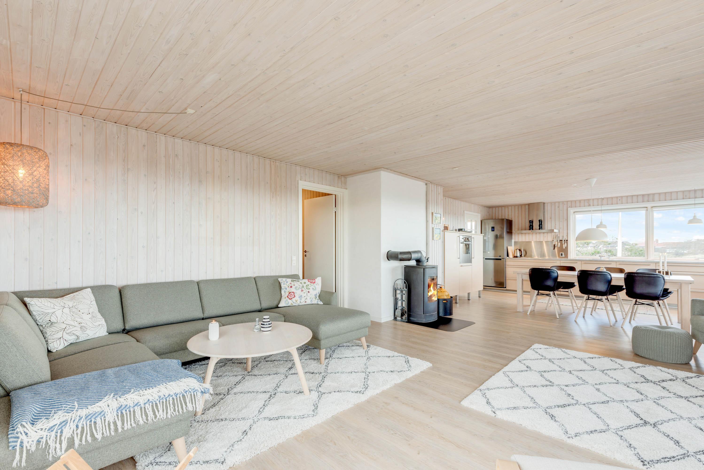 The light-filled living space with its integrated open-plan kitchen invites you to enjoy many wonderful holiday moments. While preparing delicious meals in the well-equipped kitchen, you can enjoy views across Ringkøbing Fjord. On cooler days, the crackling wood-burning stove provides cosy warmth while the wild western winds rustle through the dune grasses outside.