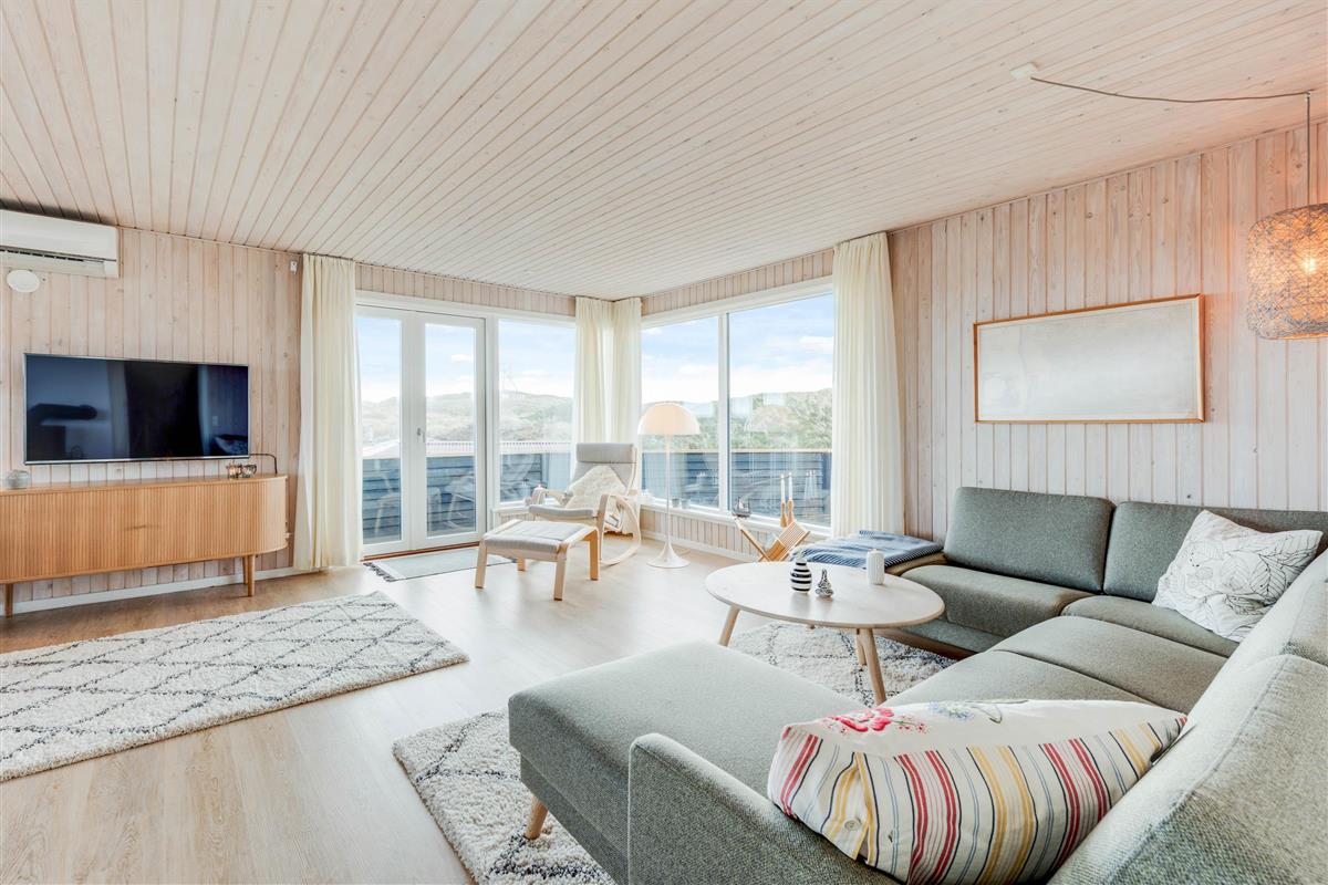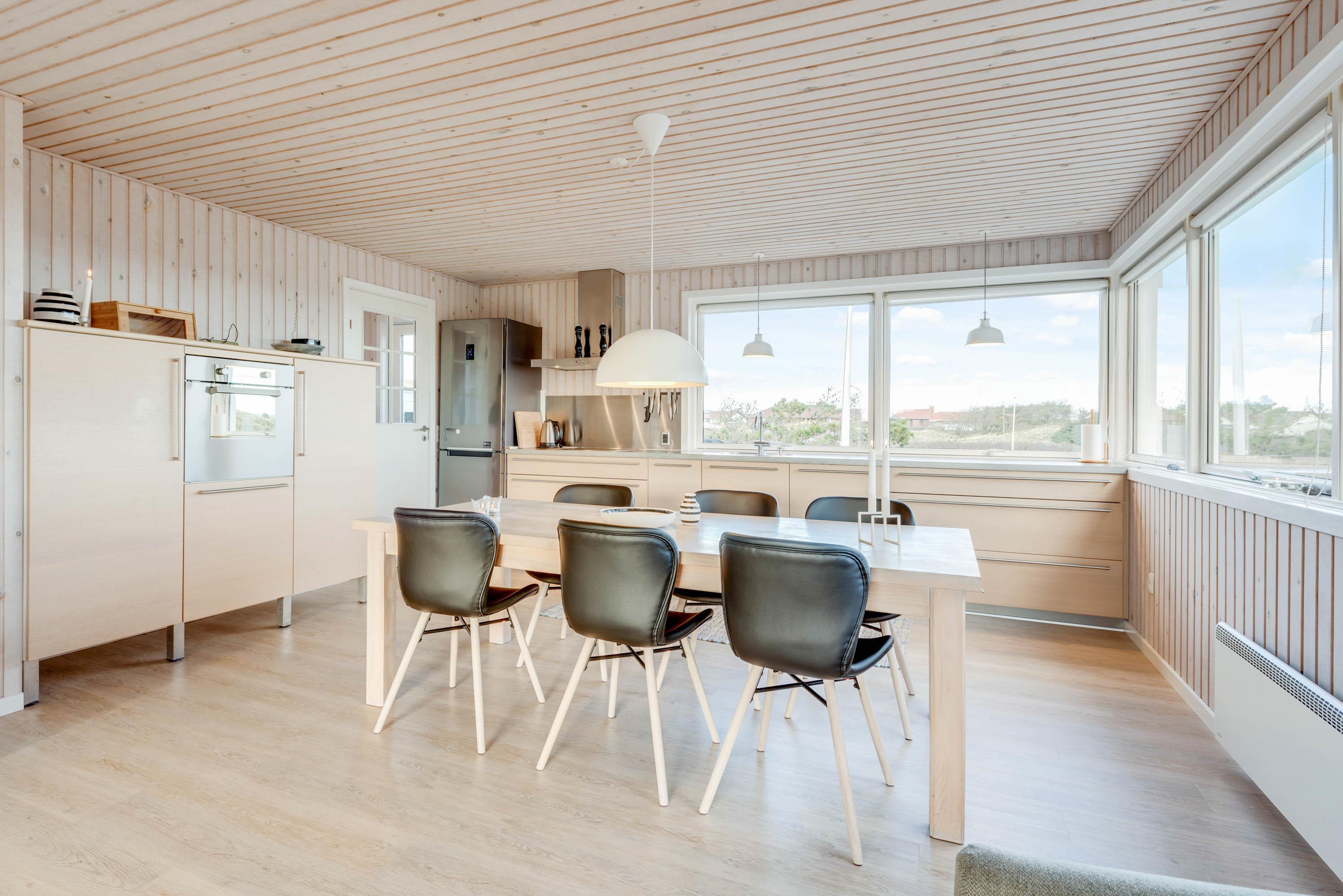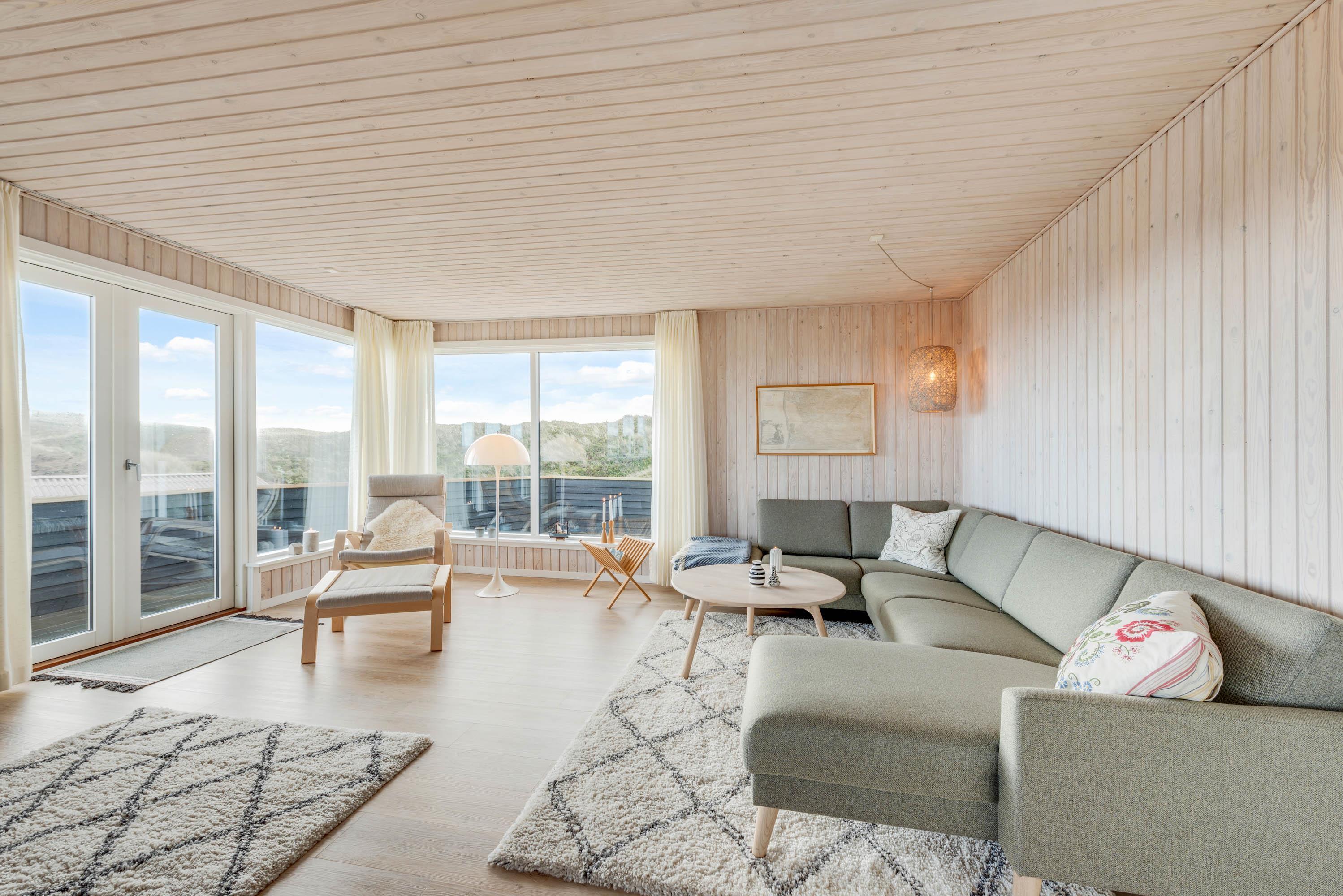 The light-filled living space with its integrated open-plan kitchen invites you to enjoy many wonderful holiday moments. While preparing delicious meals in the well-equipped kitchen, you can enjoy views across Ringkøbing Fjord. On cooler days, the crackling wood-burning stove provides cosy warmth while the wild western winds rustle through the dune grasses outside.