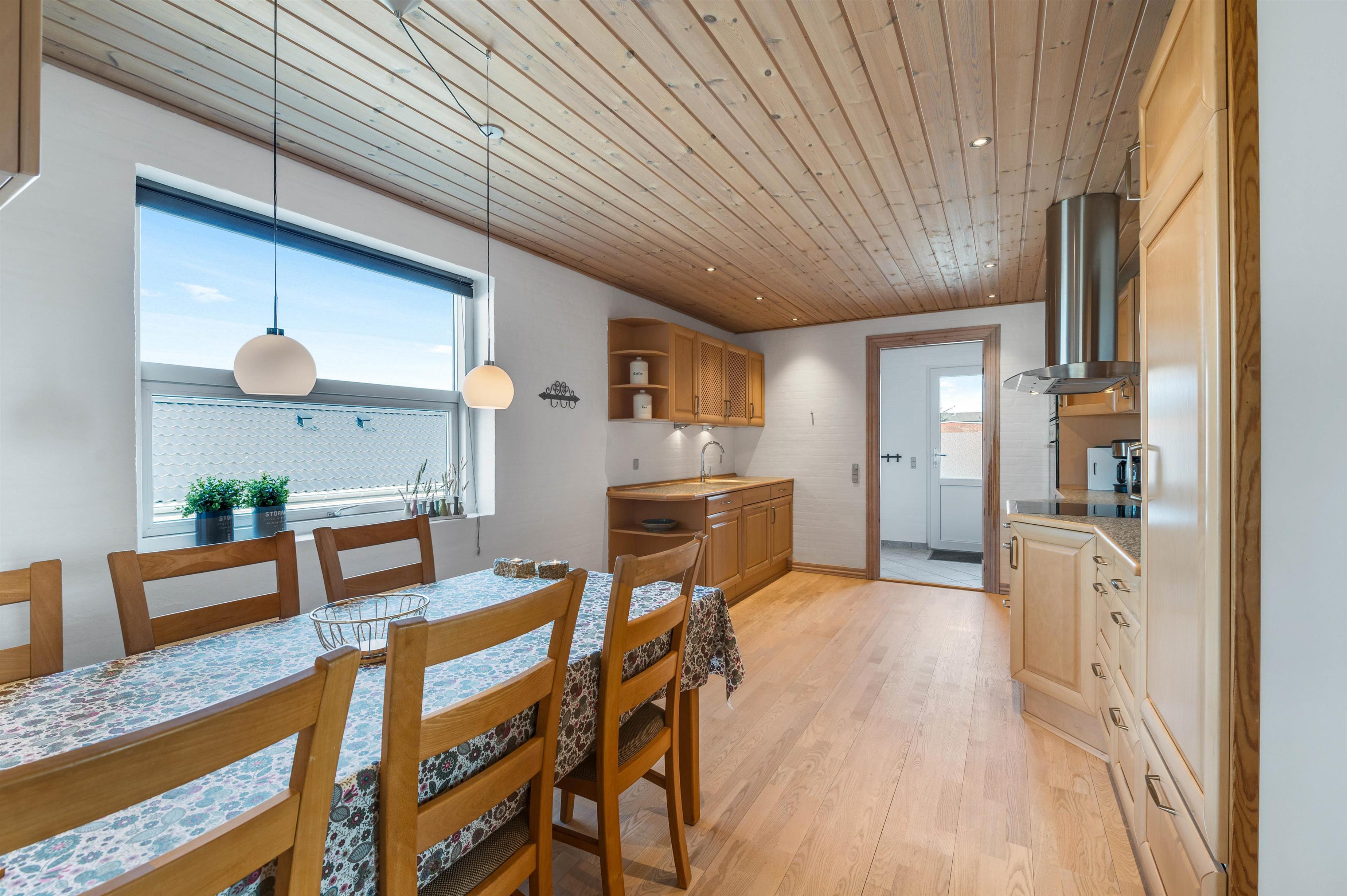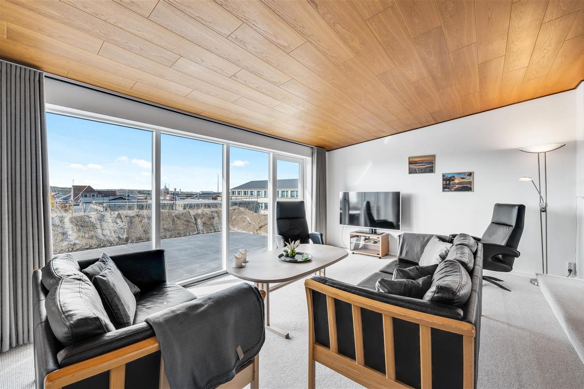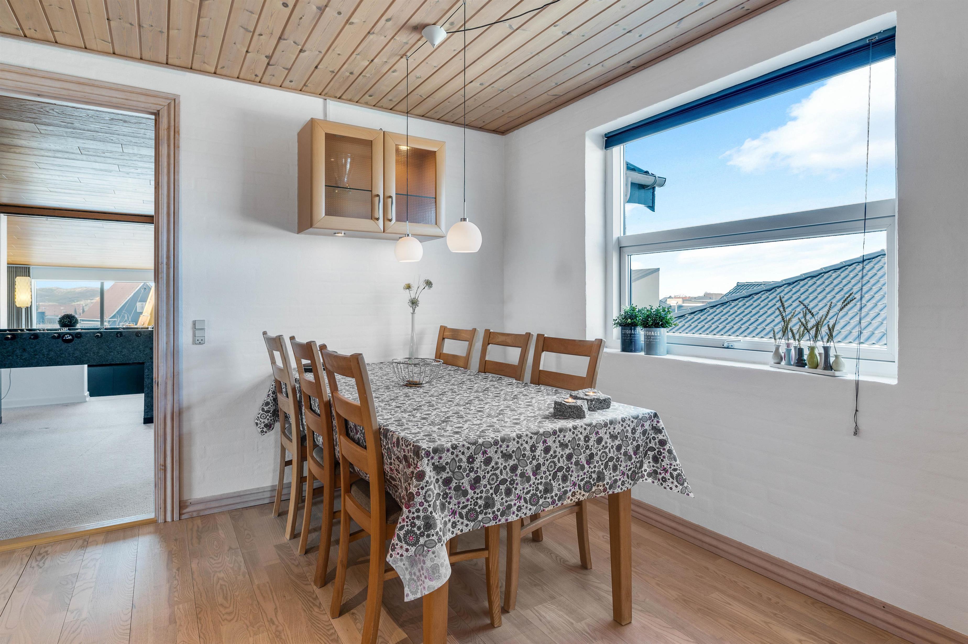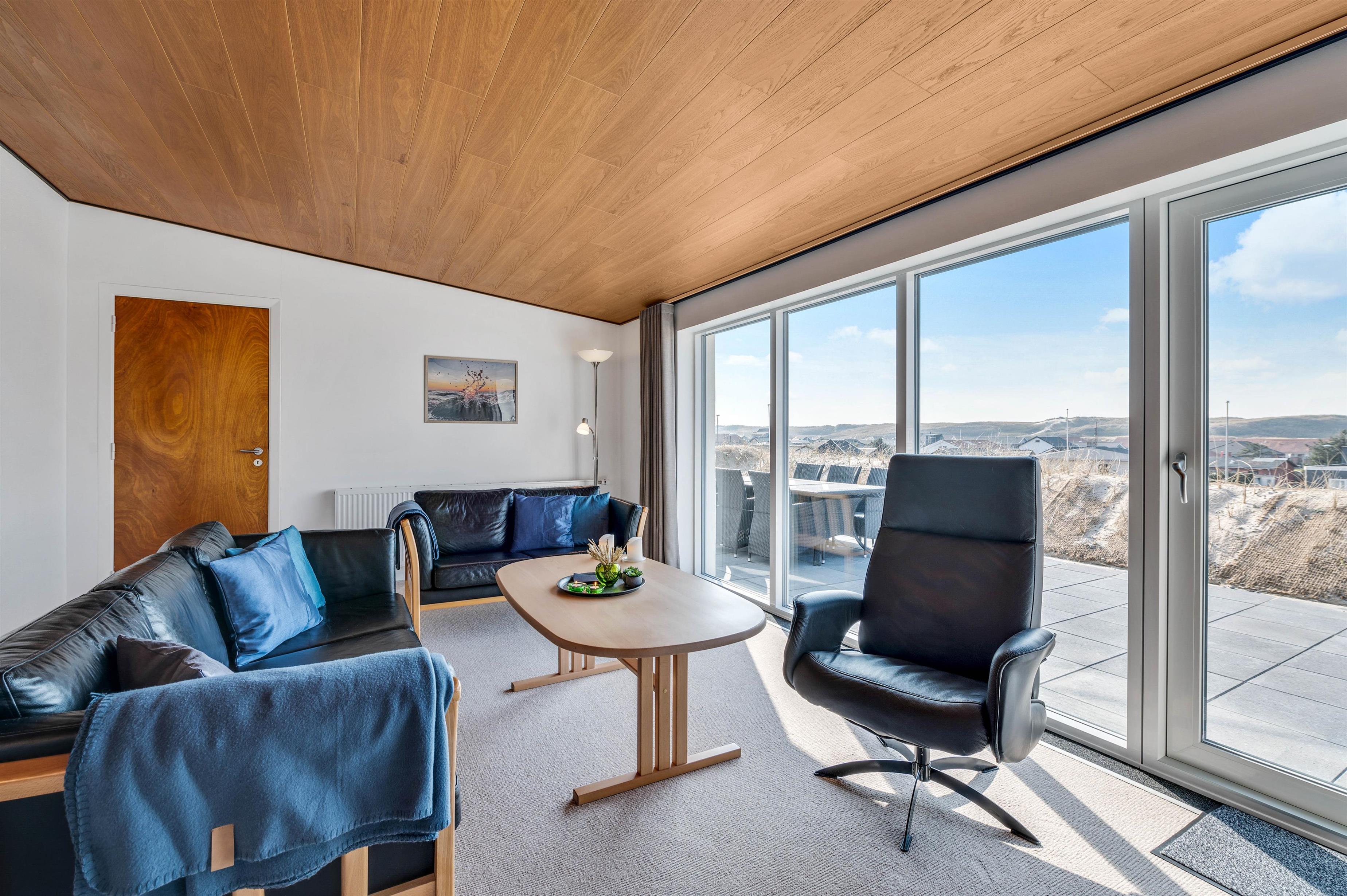 The holiday home in Hvide Sande impresses with its comfortable furnishings and beautiful views through large windows overlooking the surroundings. Natural light creates a pleasant atmosphere in the living area, reached by a few steps, where you can settle in on the sofa for a relaxing evening watching television.