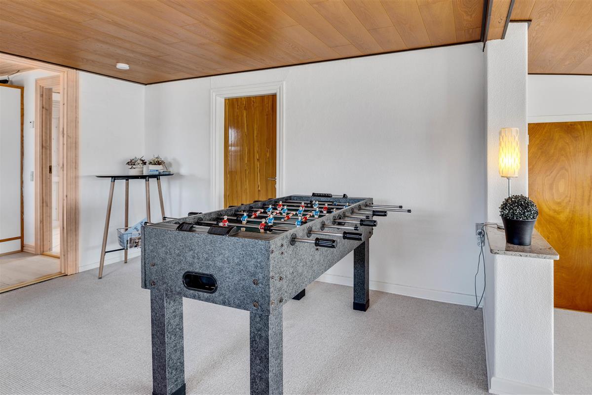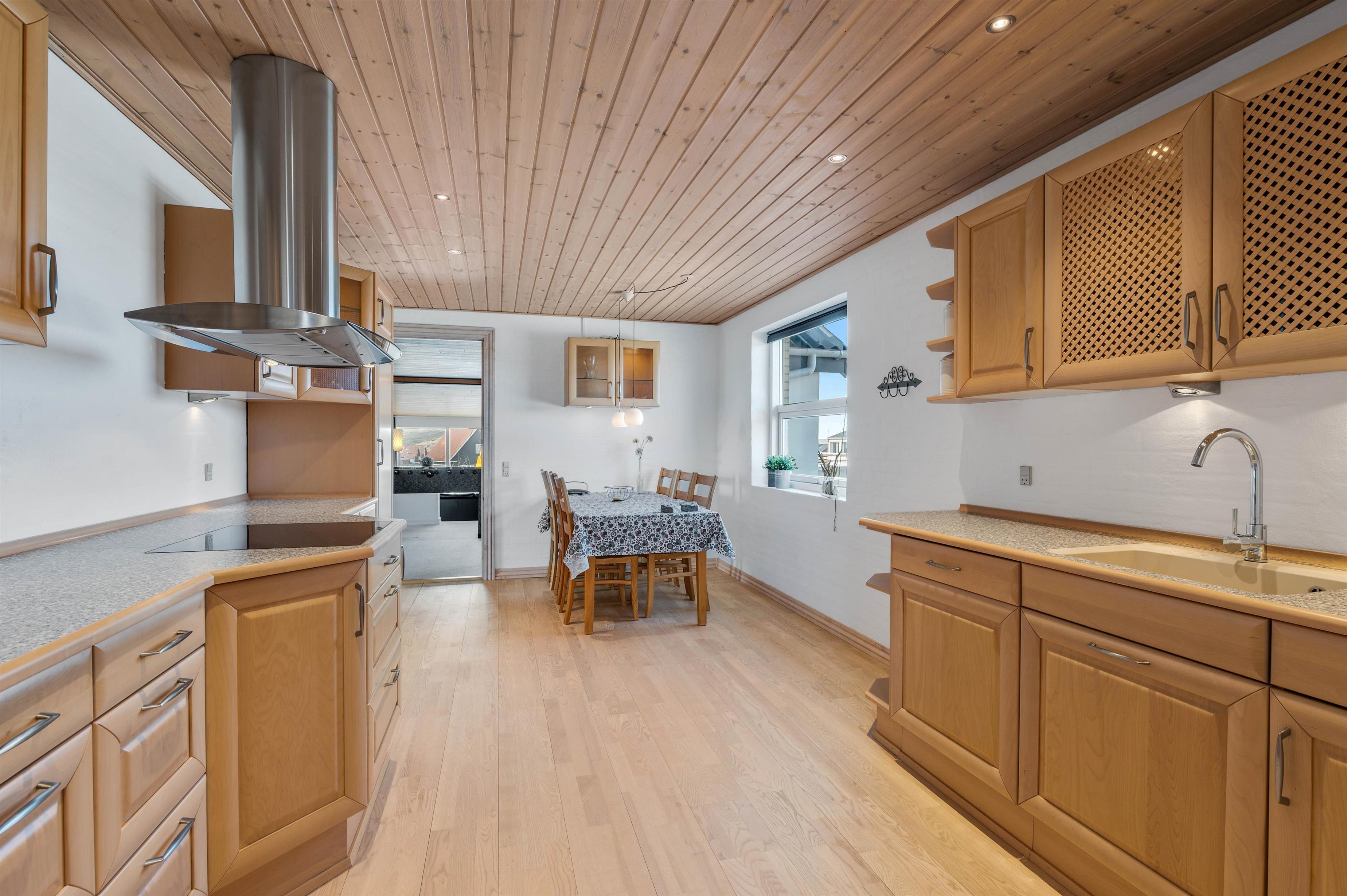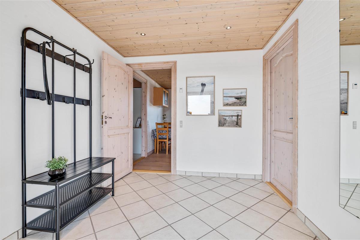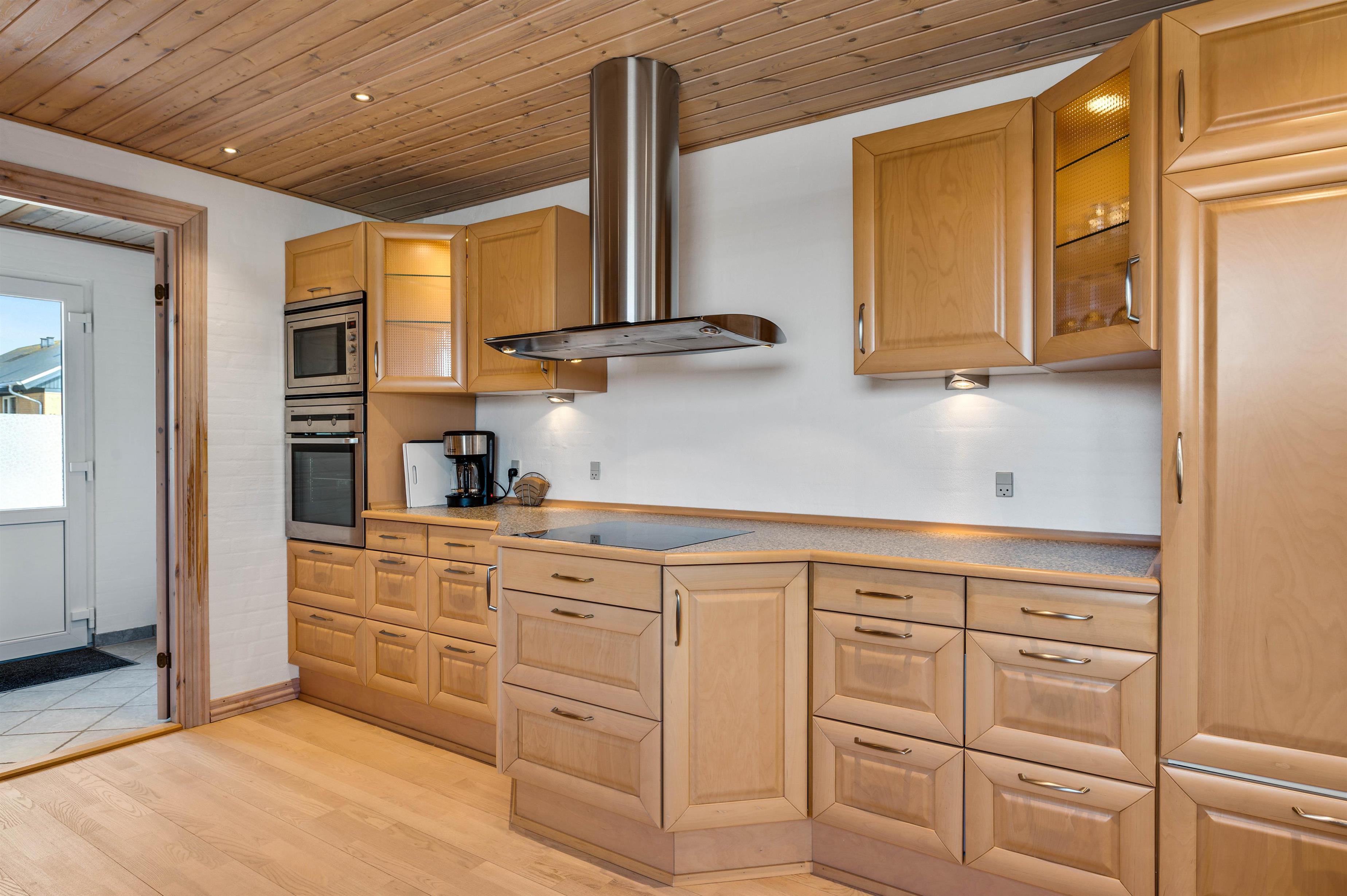 The holiday home in Hvide Sande impresses with its comfortable furnishings and beautiful views through large windows overlooking the surroundings. Natural light creates a pleasant atmosphere in the living area, reached by a few steps, where you can settle in on the sofa for a relaxing evening watching television.