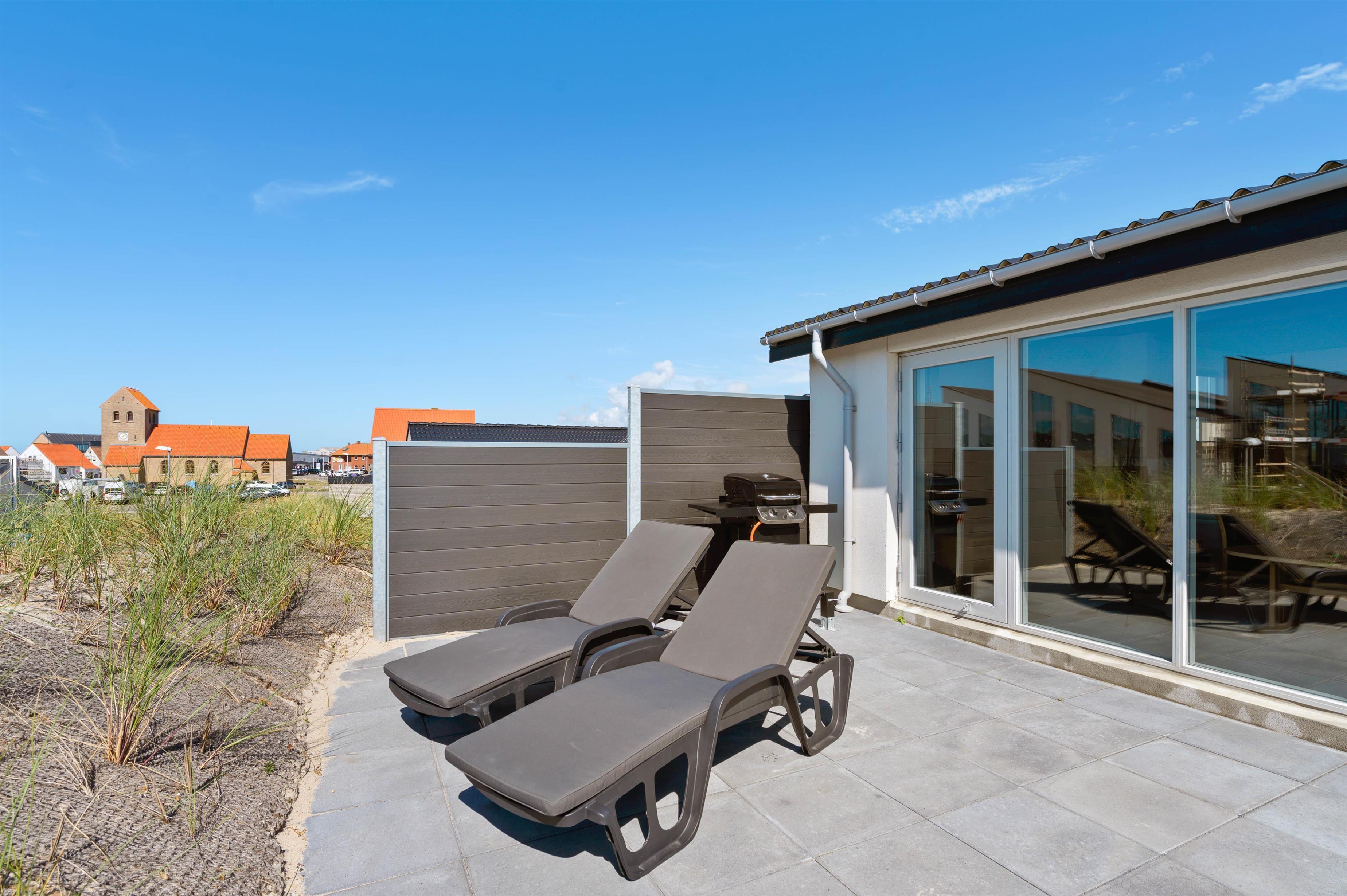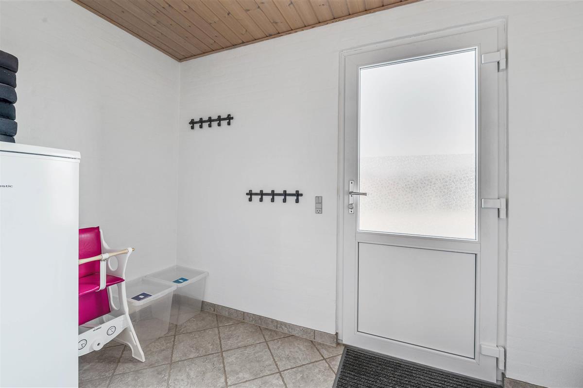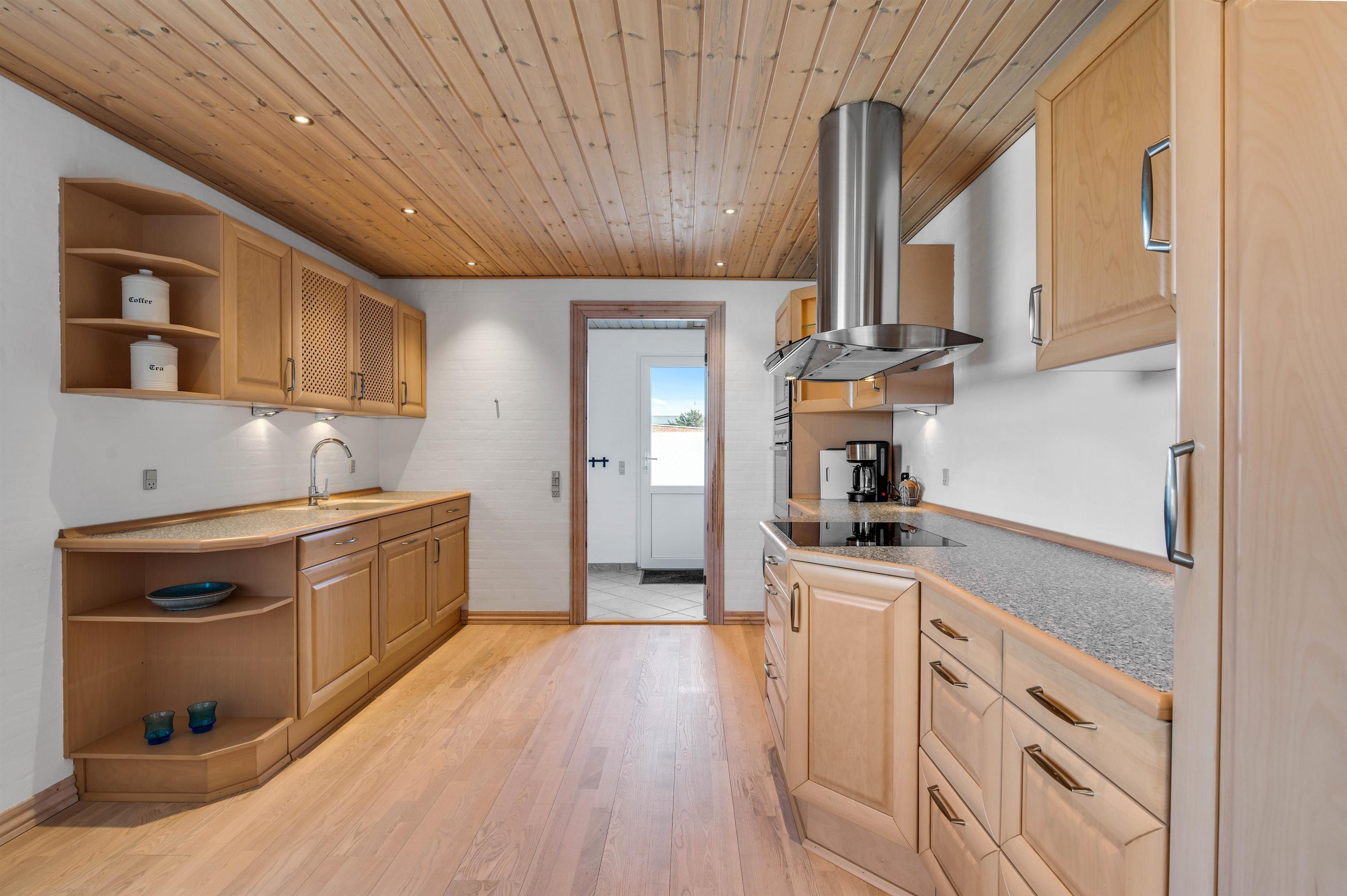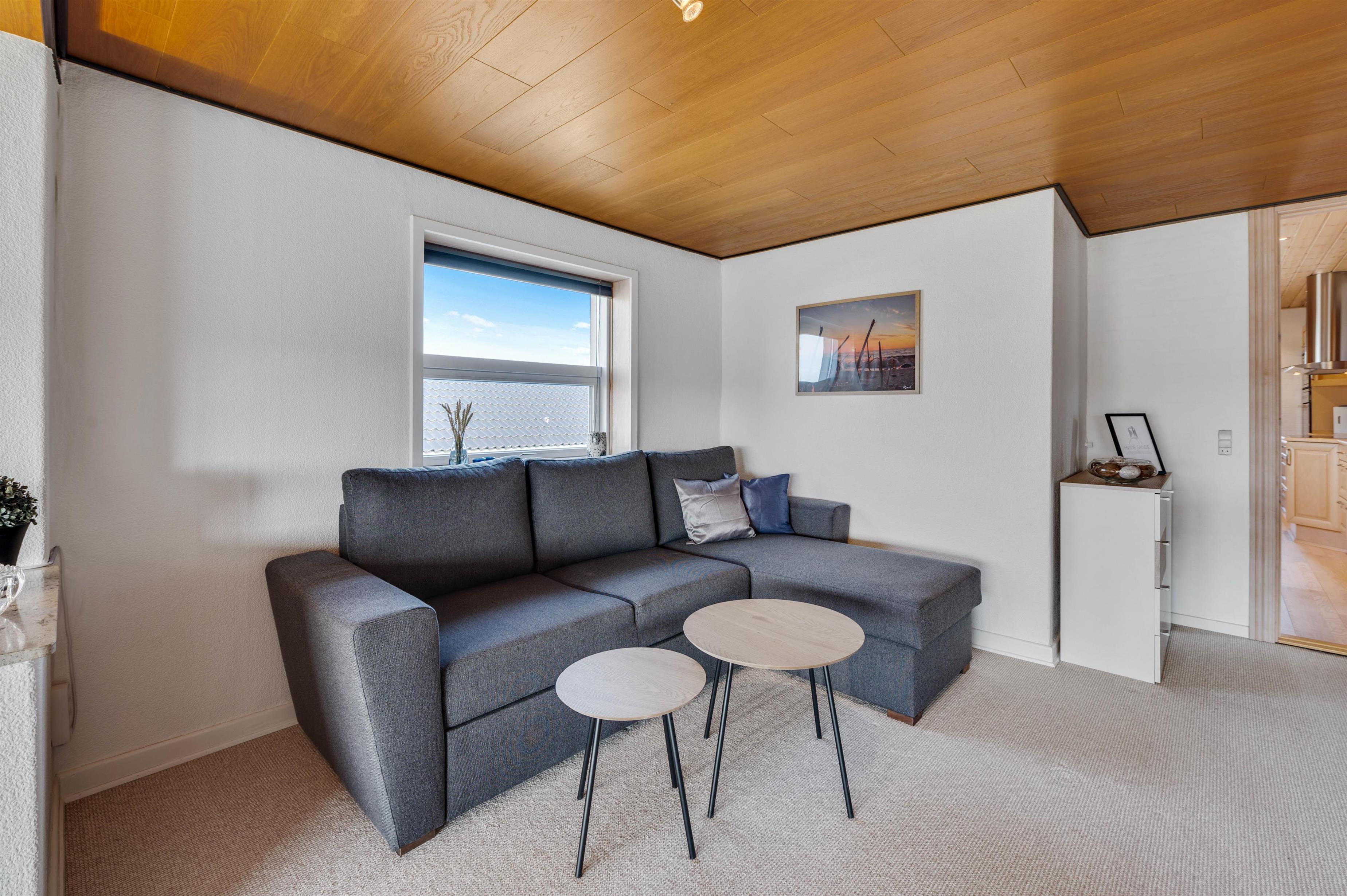 The holiday home in Hvide Sande impresses with its comfortable furnishings and beautiful views through large windows overlooking the surroundings. Natural light creates a pleasant atmosphere in the living area, reached by a few steps, where you can settle in on the sofa for a relaxing evening watching television.