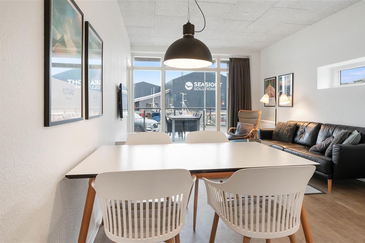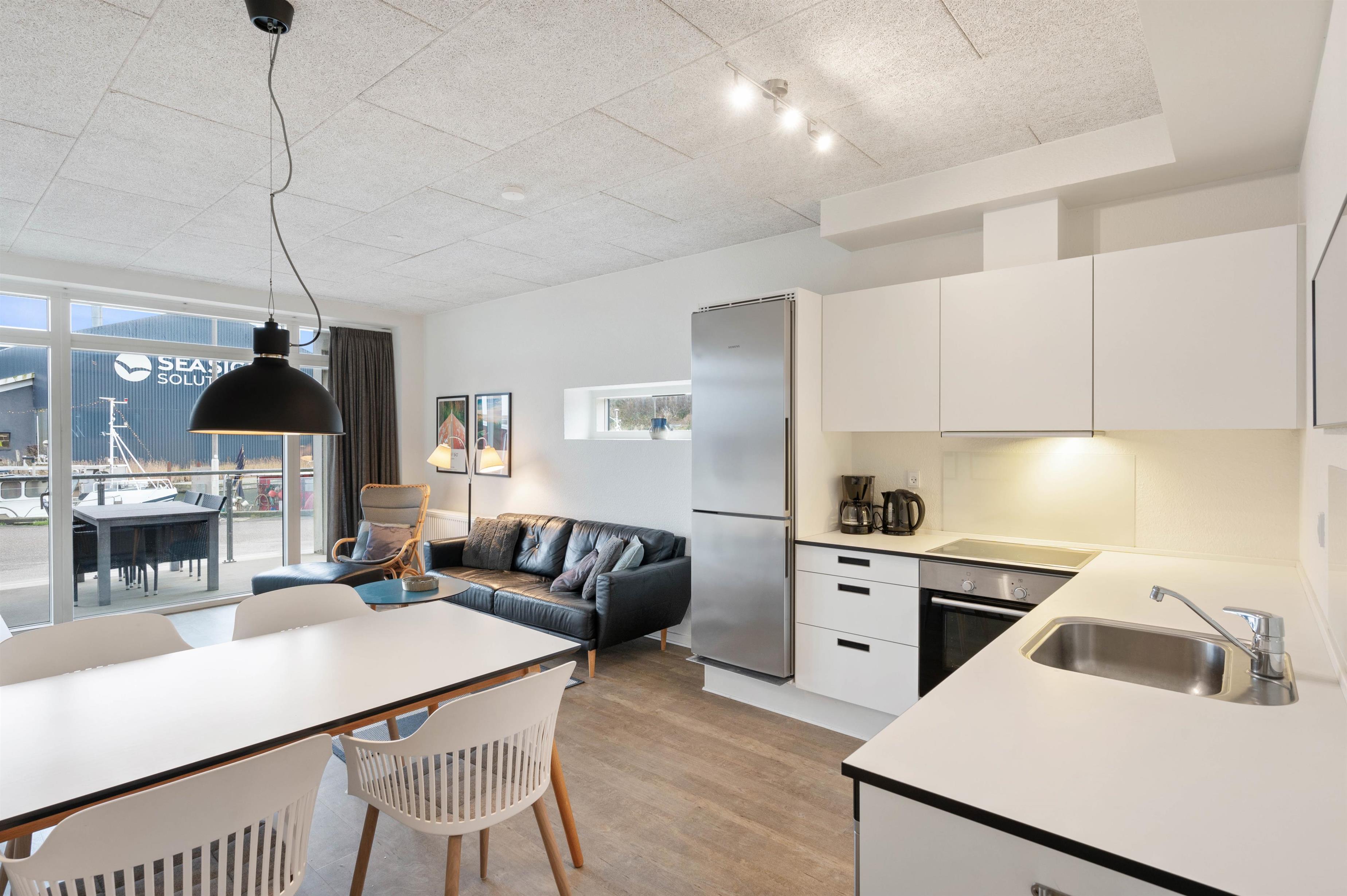 The living room, dining area and kitchen form one large open-plan space, and the large windows offer splendid views of the small harbour. Even on rainy days, you can enjoy the surroundings from the comfort of your sofa with a cup of tea or coffee.