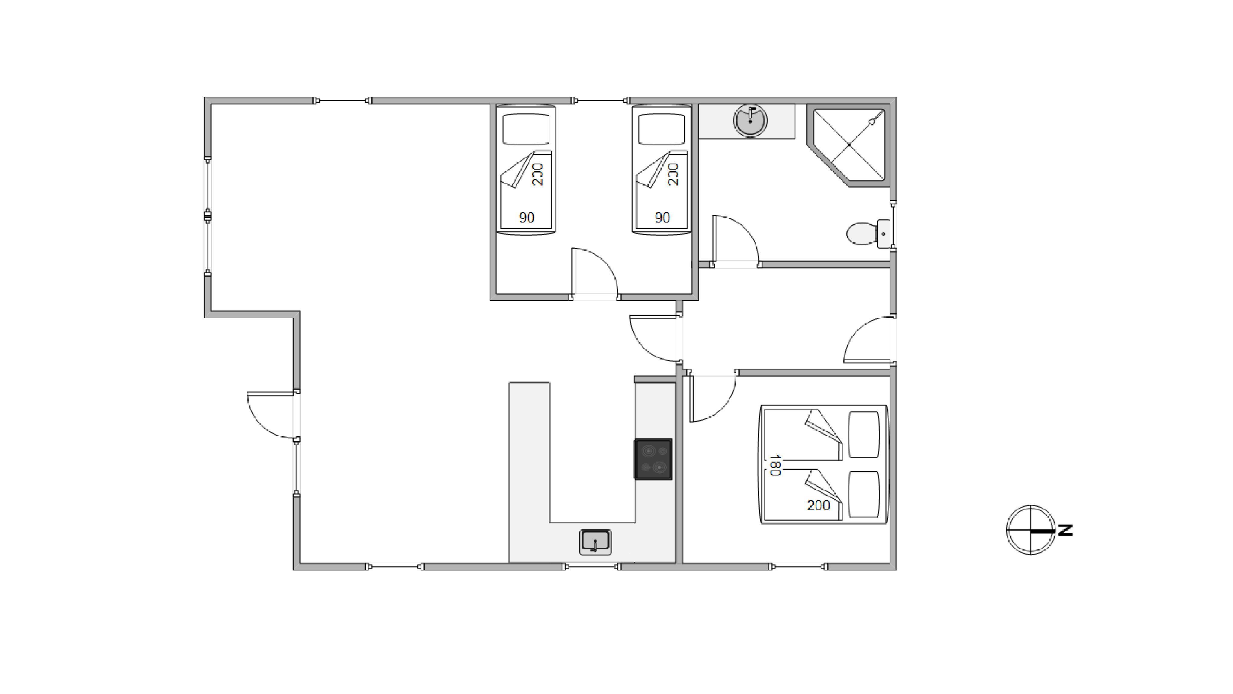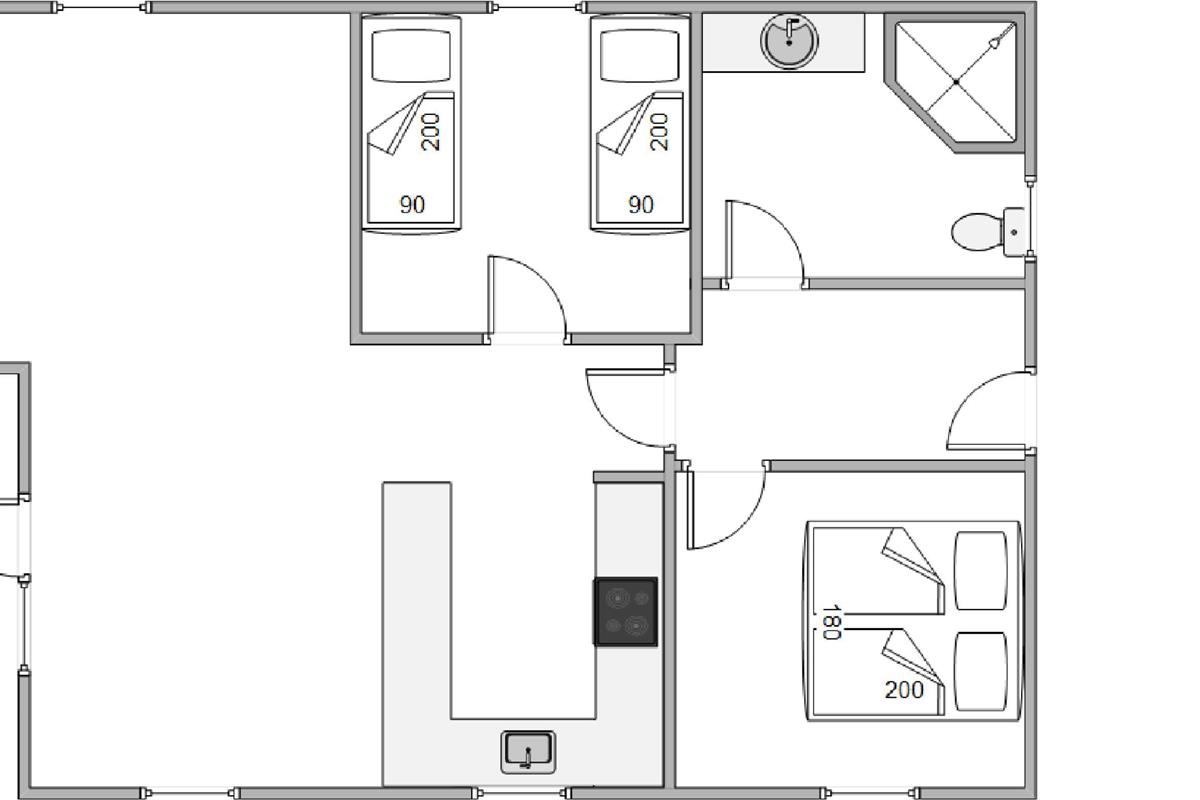 For a peaceful night's sleep, there are two bedrooms. The first bedroom features a large double bed (180 x 200 cm), while the second bedroom has two single beds (90 x 200 cm). The bathroom ensures total comfort with underfloor heating and a modern shower. For added convenience, a washing machine is available in the entrance area of the holiday home.