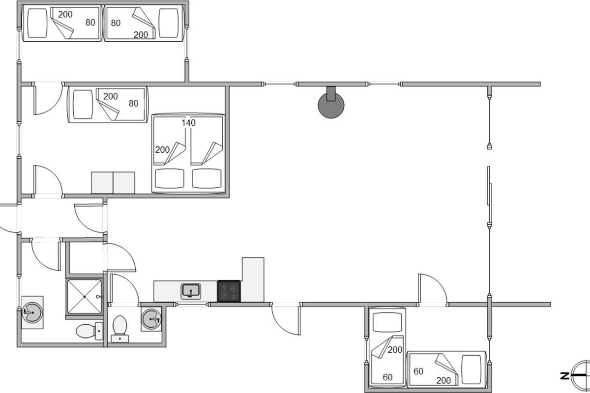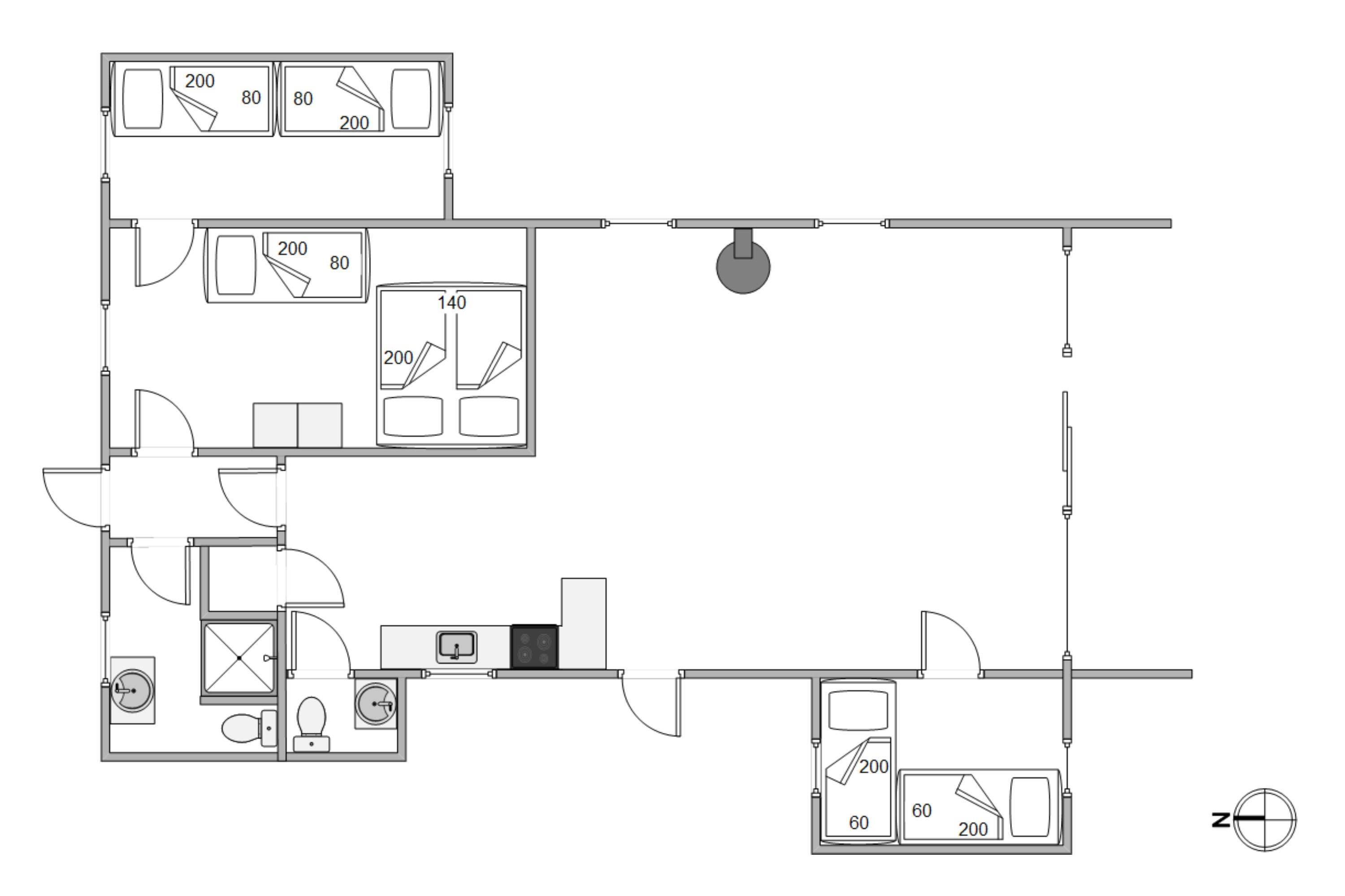 The holiday home offers three bedrooms for peaceful rest. One features a double bed (140 x 200 cm) and a single bed (80 x 200 cm). A second bedroom has two single beds (80 x 200 cm), while the third bedroom, particularly suitable as a children's retreat, has two single beds (60 x 200 cm).