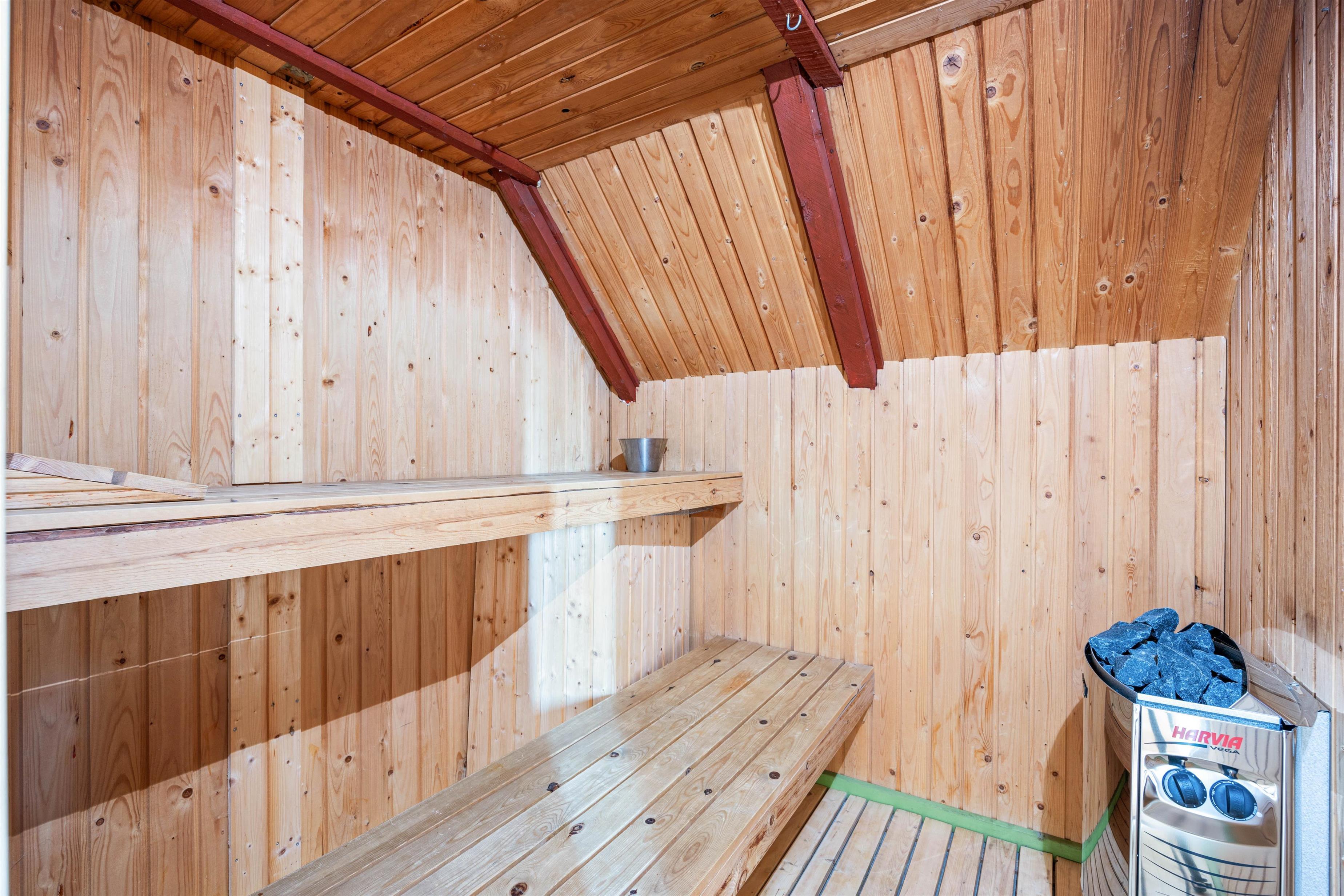 The holiday home features a sauna where you can properly unwind with a refreshing drink.