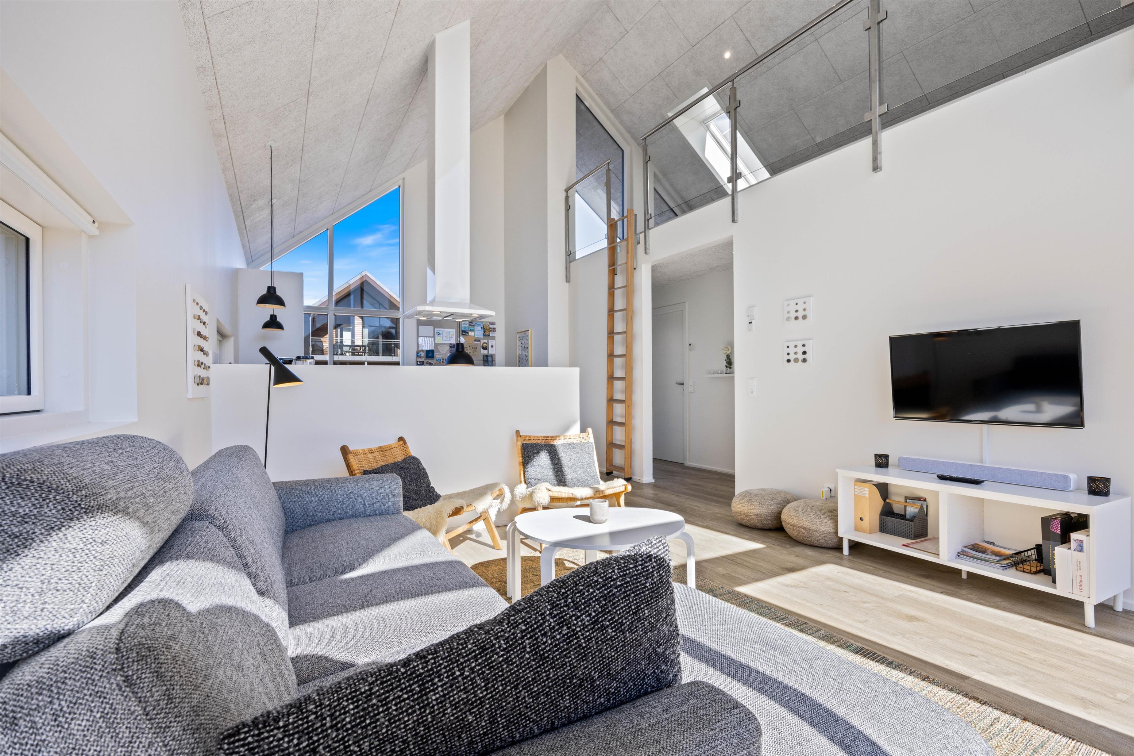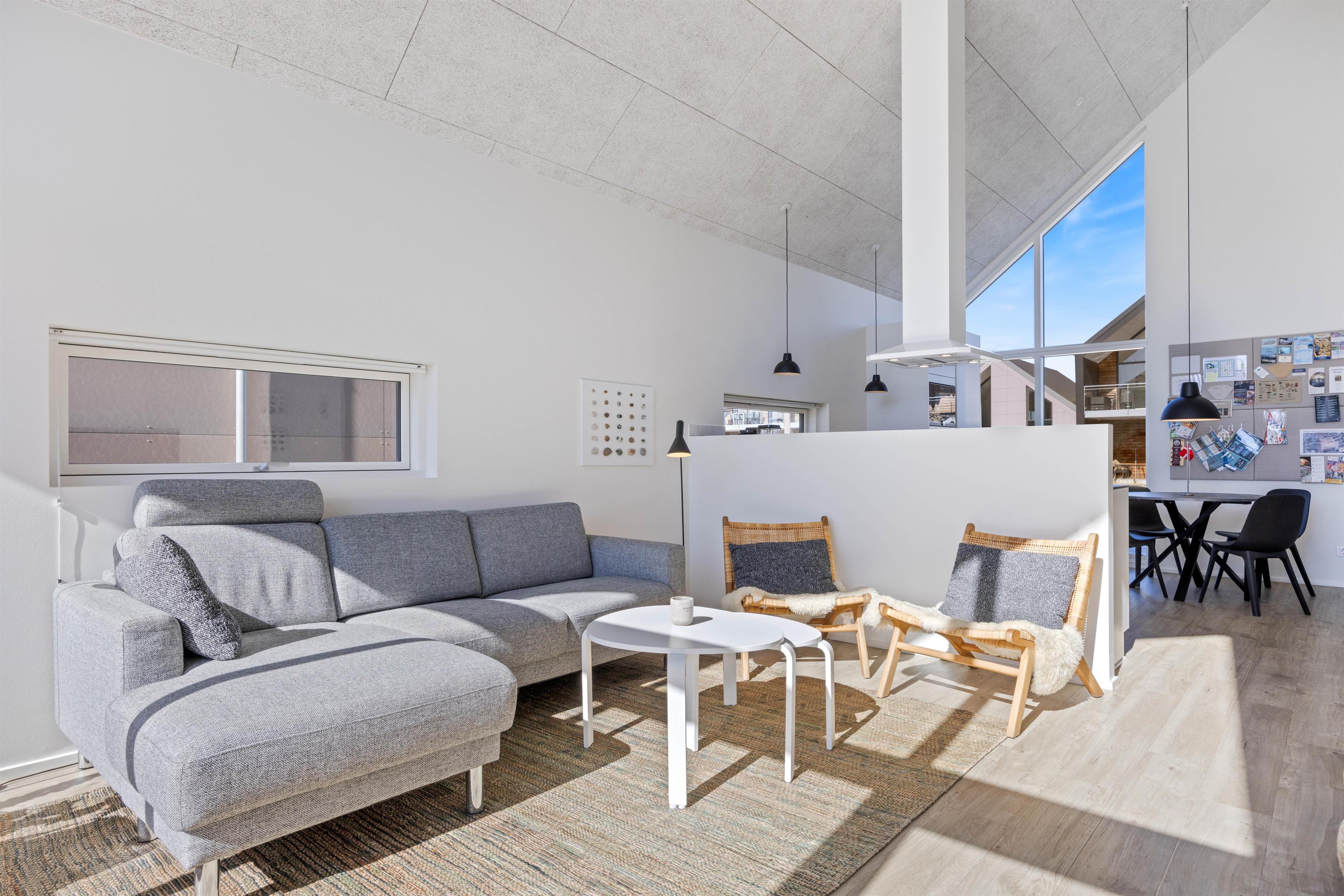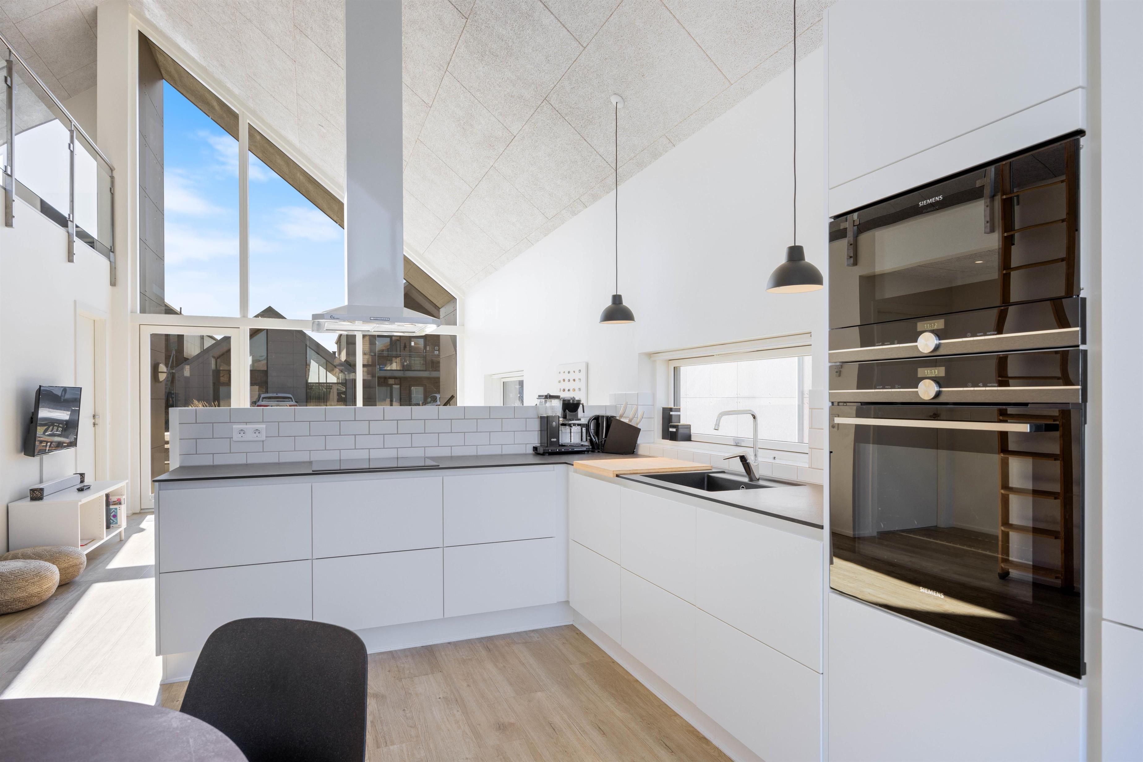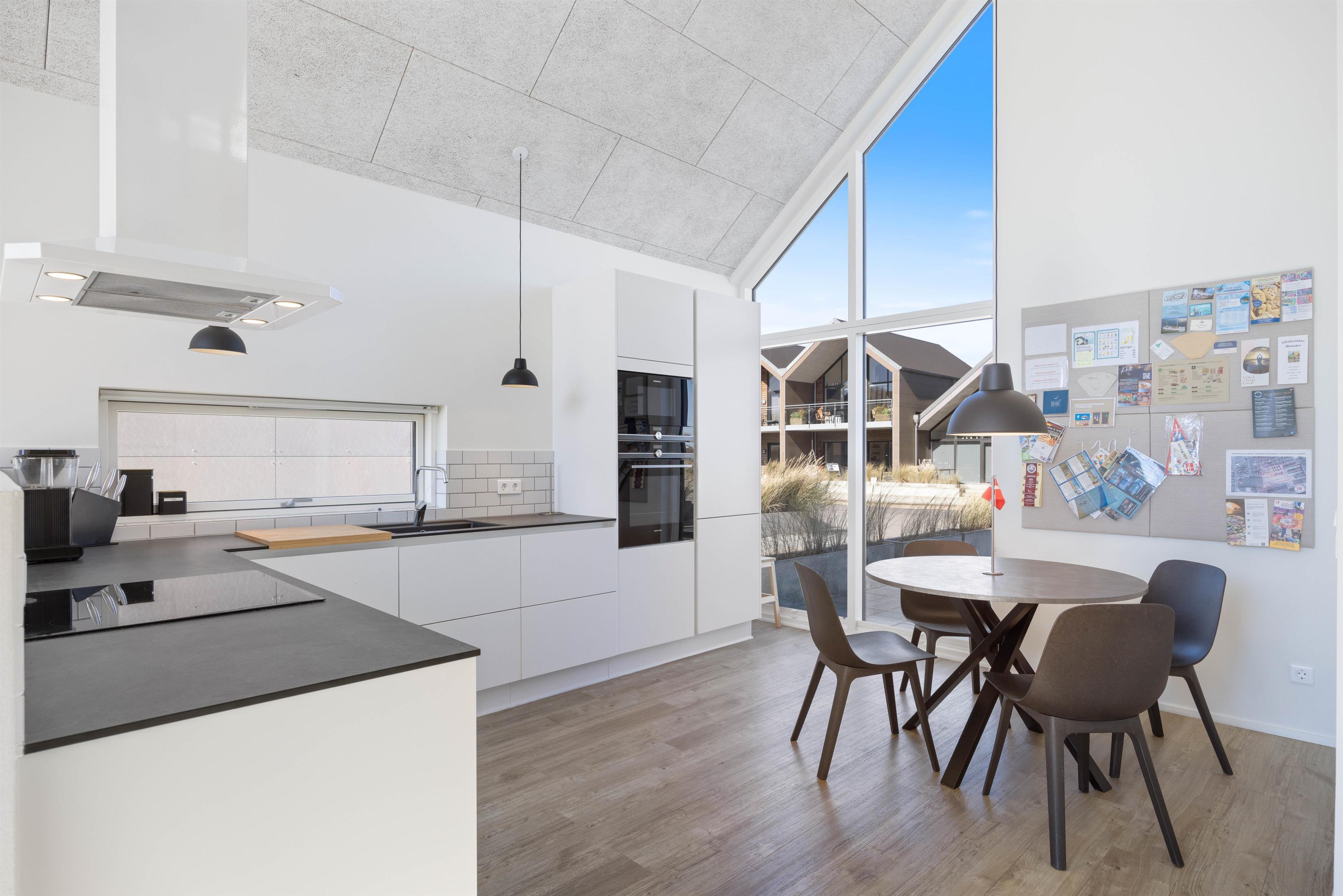 This 73-square-metre terraced holiday home at Langsand 192 is situated in the architect-designed canal village of Langsand Langs Vand. The holiday home feels spacious thanks to its neutral colours, large windows and high ceilings. The living room and kitchen feature an open-plan design, forming the heart of this home. After preparing dinner in the kitchen, you can relax in the living room and stream your favourite films via Chromecast. The dishwasher takes care of the washing up while you unwind. The kitchen also features a ladder leading to a cosy loft space - children will love relaxing in the bean bags here. The two bedrooms are equipped with adjustable cabin beds that can be configured to your preferences, offering one double bed and two single beds. The bathroom, like the living area, features underfloor heating and includes a WC, shower, and a washer-dryer combination for all your laundry needs.