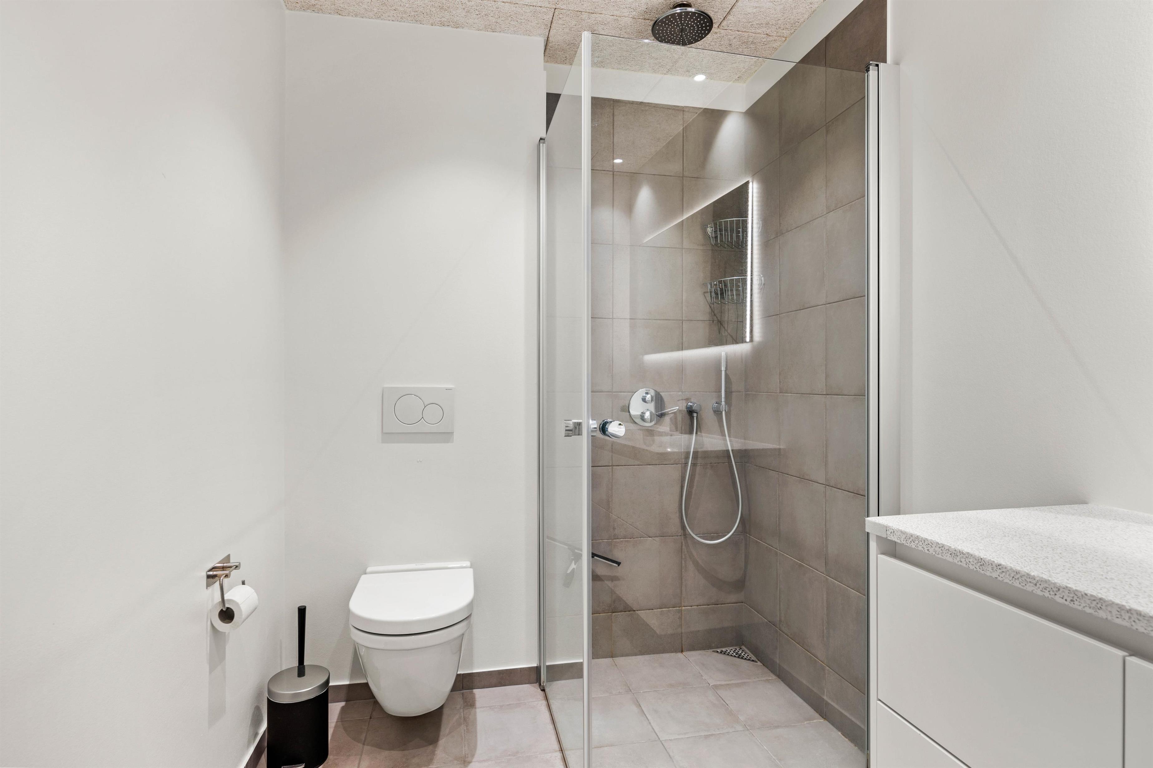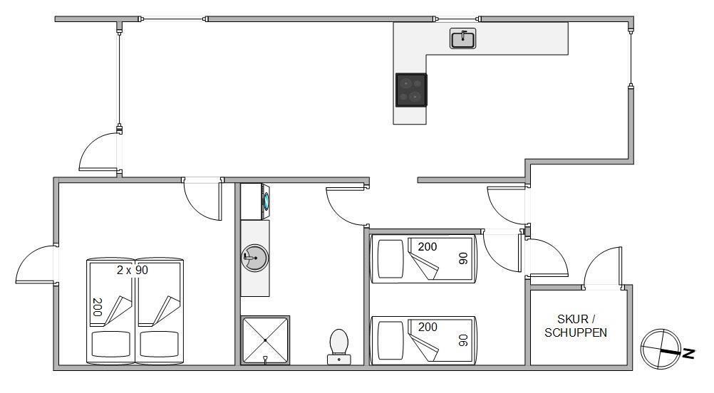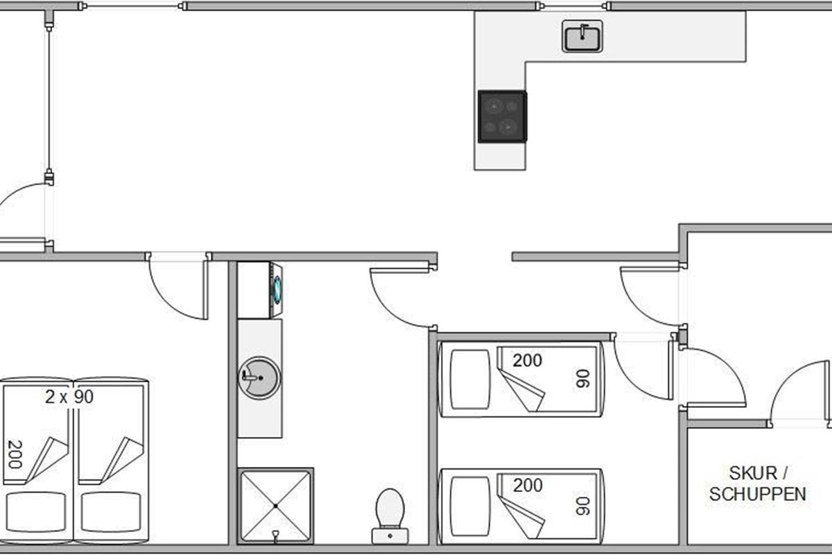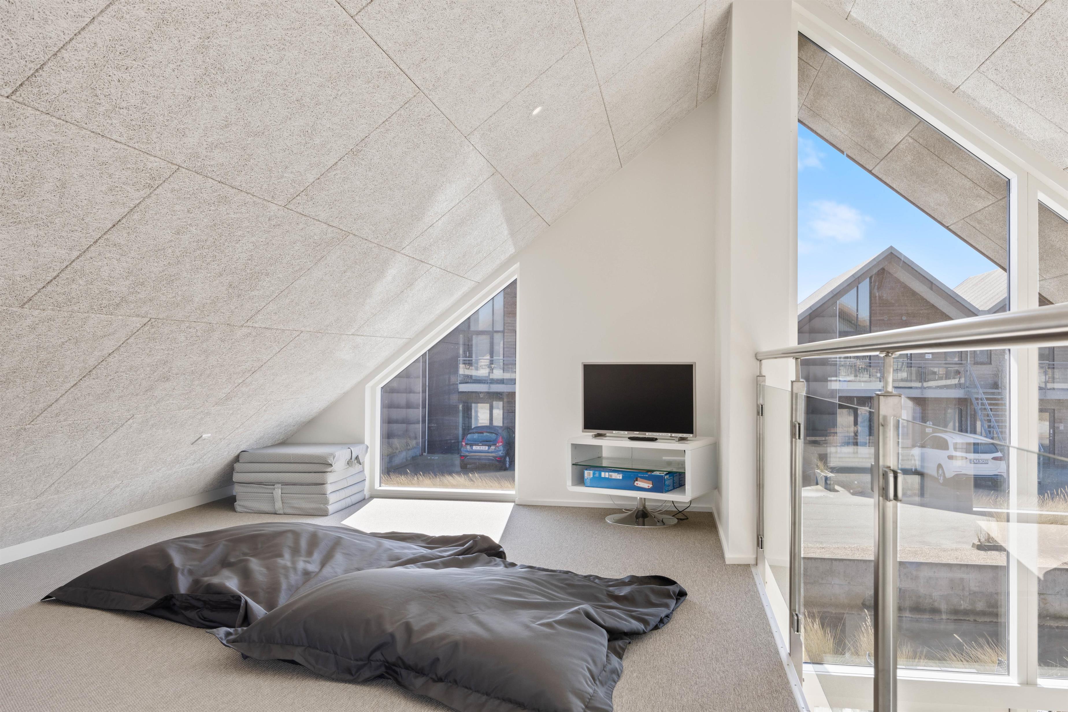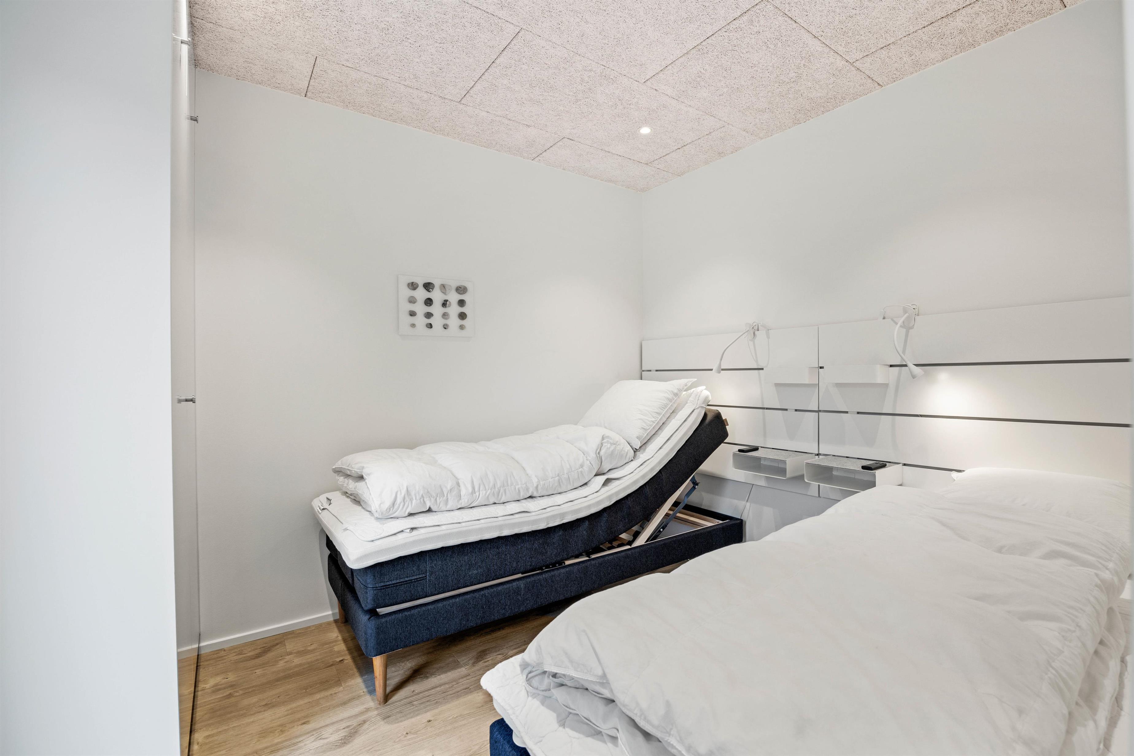 This 73-square-metre terraced holiday home at Langsand 192 is situated in the architect-designed canal village of Langsand Langs Vand. The holiday home feels spacious thanks to its neutral colours, large windows and high ceilings. The living room and kitchen feature an open-plan design, forming the heart of this home. After preparing dinner in the kitchen, you can relax in the living room and stream your favourite films via Chromecast. The dishwasher takes care of the washing up while you unwind. The kitchen also features a ladder leading to a cosy loft space - children will love relaxing in the bean bags here. The two bedrooms are equipped with adjustable cabin beds that can be configured to your preferences, offering one double bed and two single beds. The bathroom, like the living area, features underfloor heating and includes a WC, shower, and a washer-dryer combination for all your laundry needs.