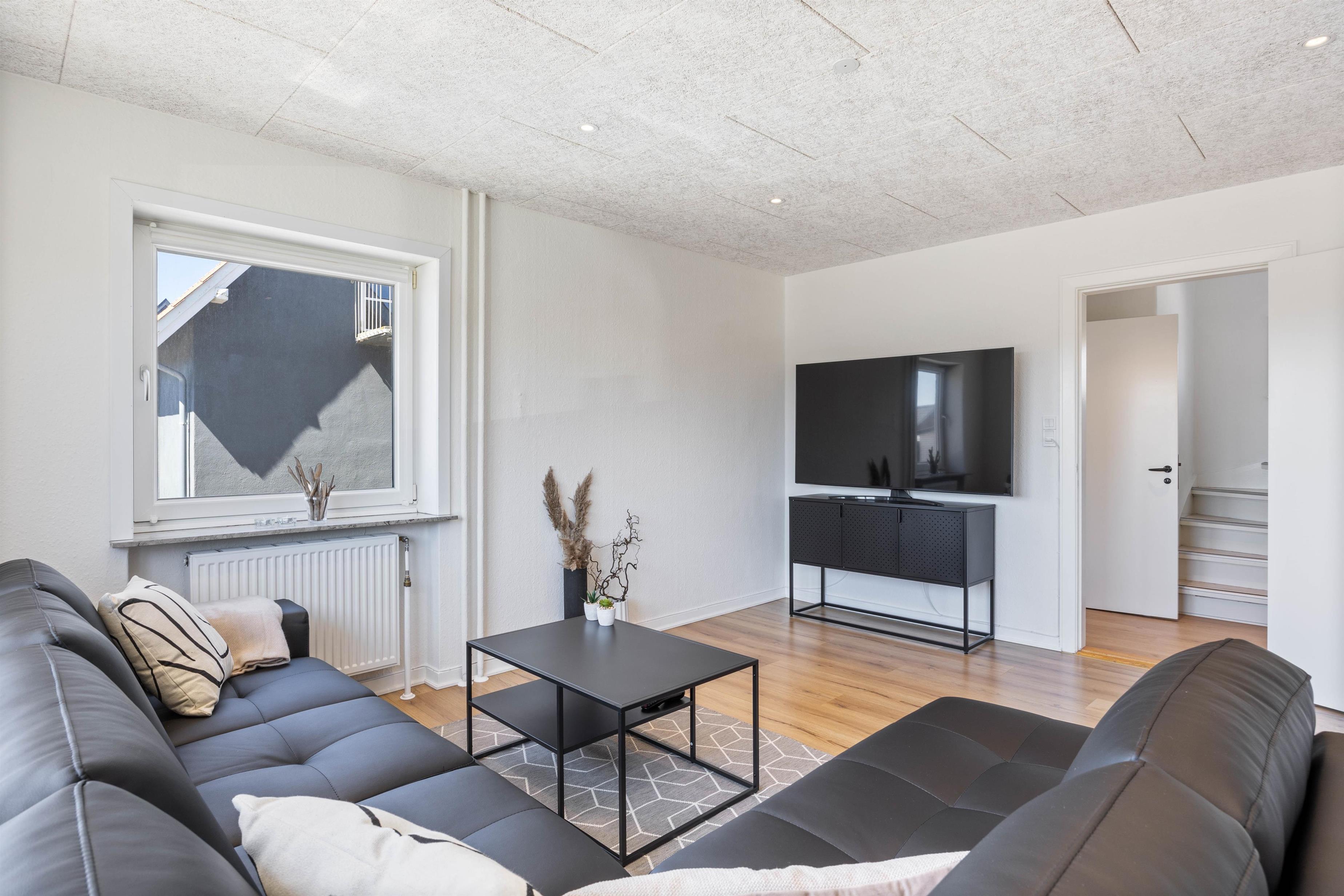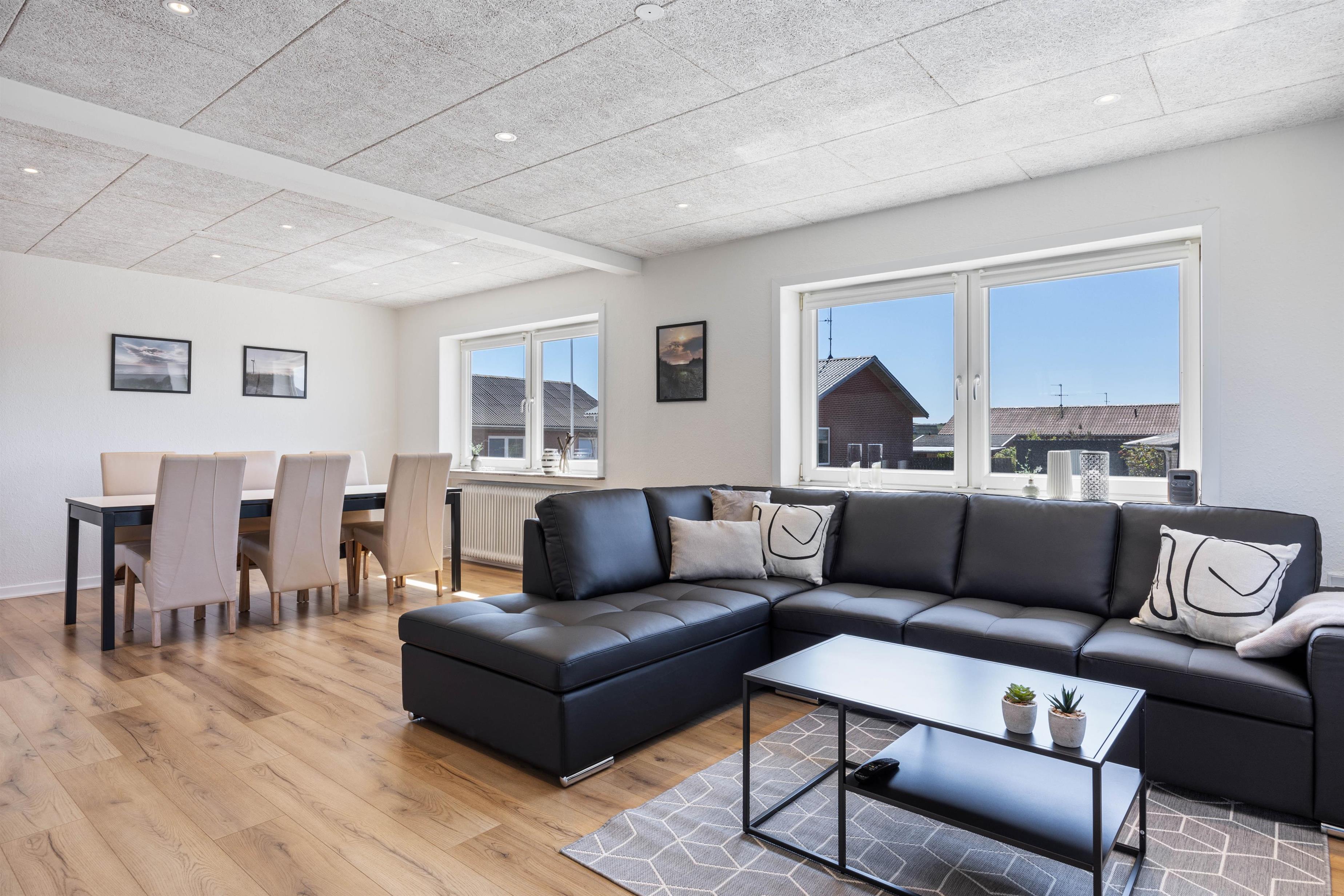 This 90-square-metre holiday home on Vestergade offers a cosy living room with wooden flooring and a comfortable corner sofa, complete with a flat-screen TV featuring German channels. The living area is perfect for shared meals or playing board games at the dining table.