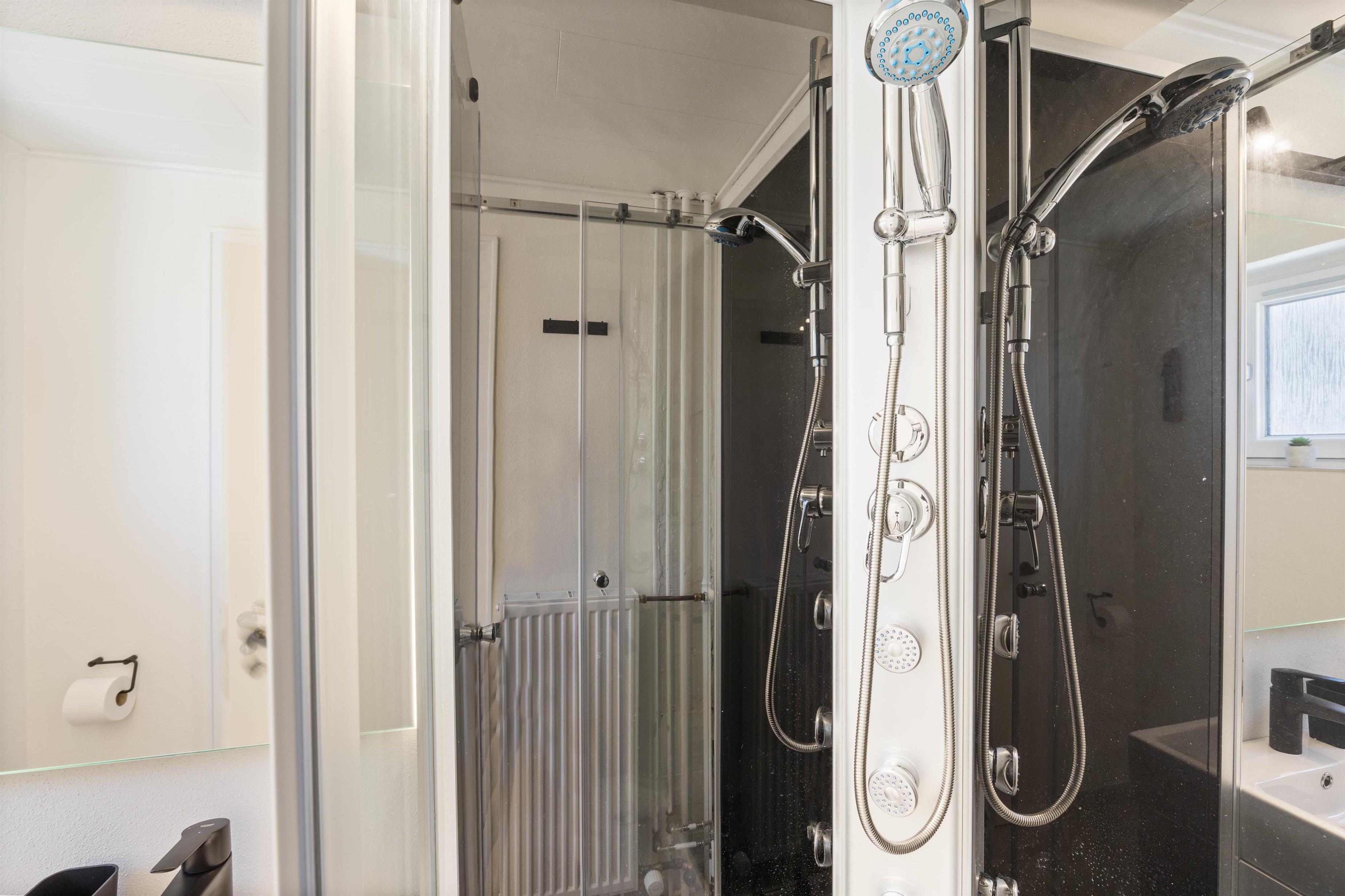 The kitchen provides all the amenities a cooking enthusiast needs to create the perfect meal. Along with a microwave, there's an induction hob, a separate freezer and a dishwasher. The spacious holiday home features three comfortable bedrooms with laminate flooring, all equipped with double beds, ensuring a restful night's sleep.