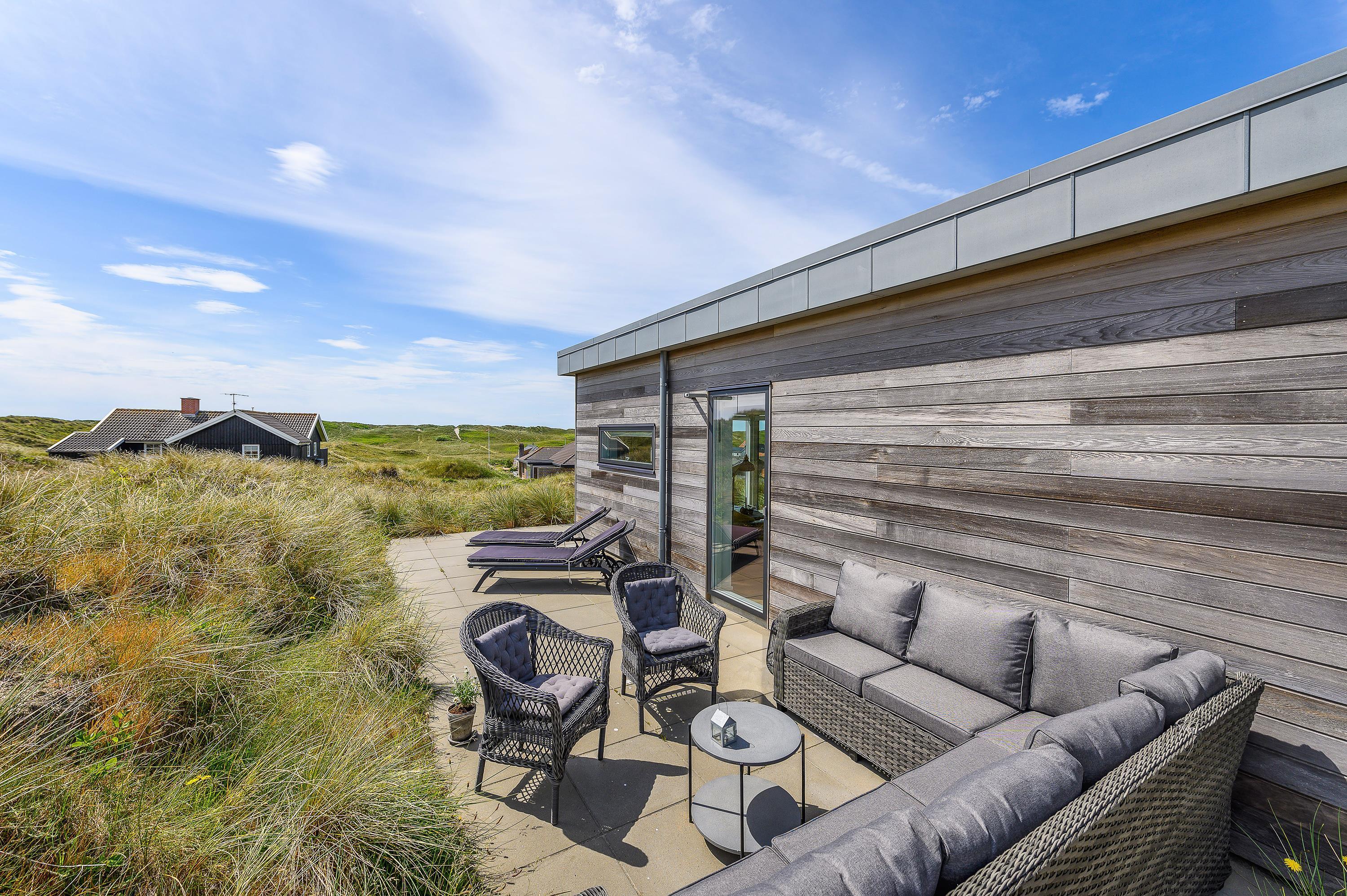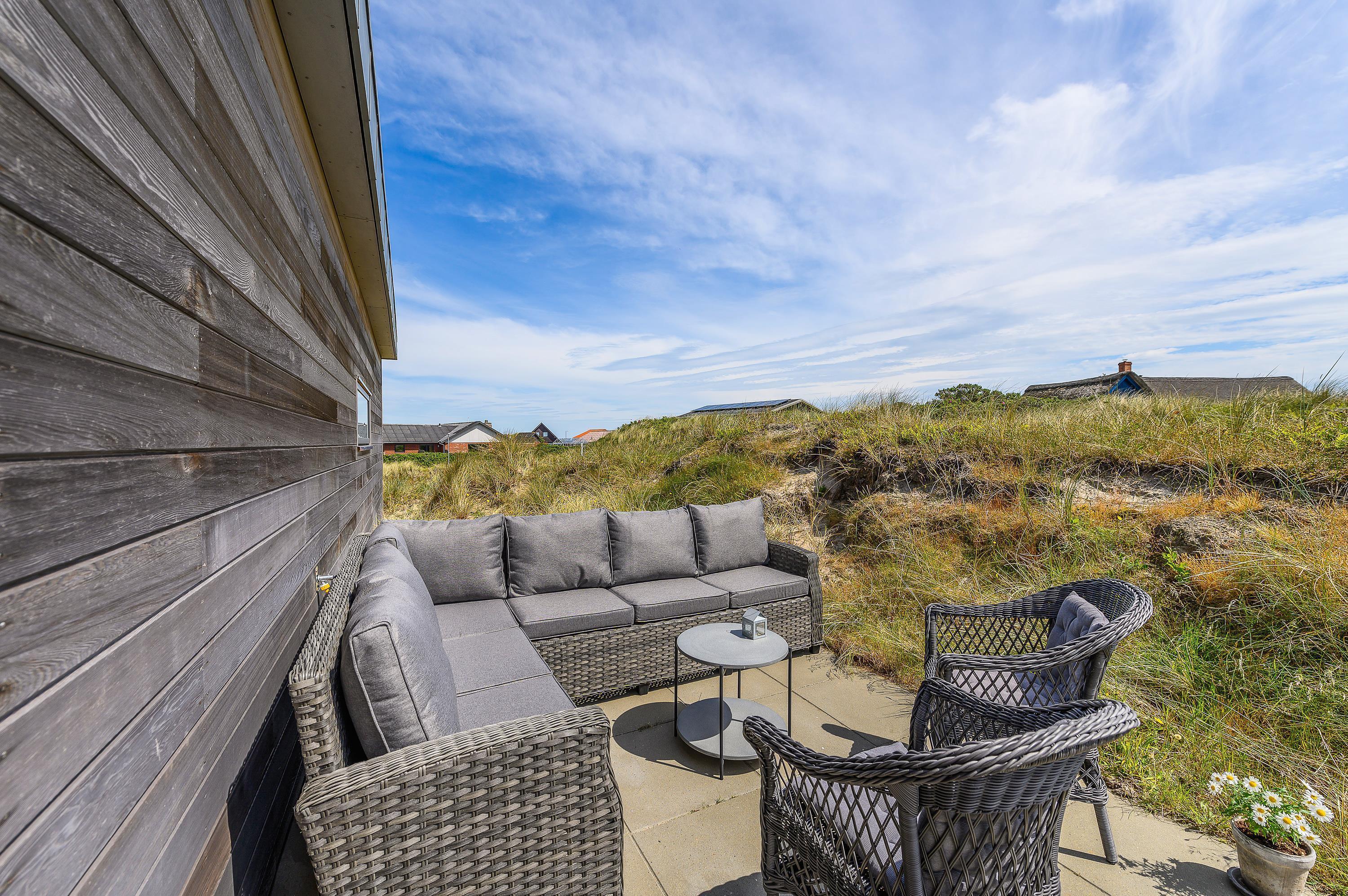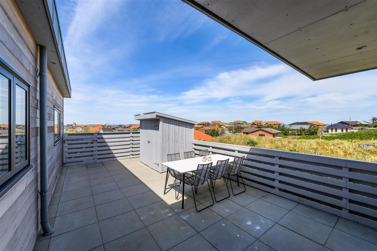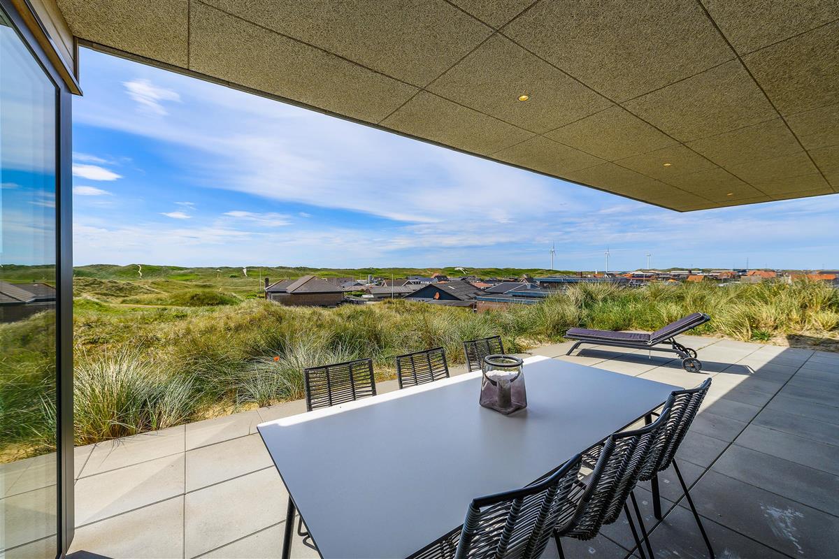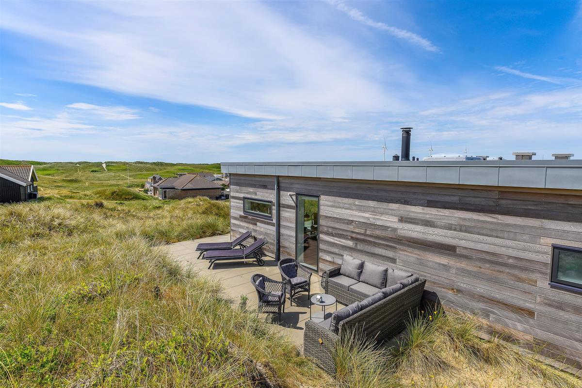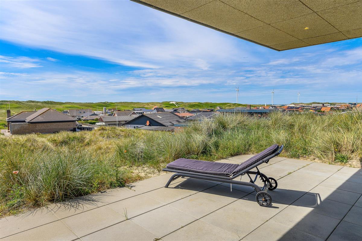 Start your day with a delicious breakfast on the east terrace, watching the sun rise over the fjord. In the evening, observe the sunset over the dunes and sea from the south-west terrace. The east terrace is enclosed and includes a storage room. The second terrace is spacious, partially covered and faces the sea.