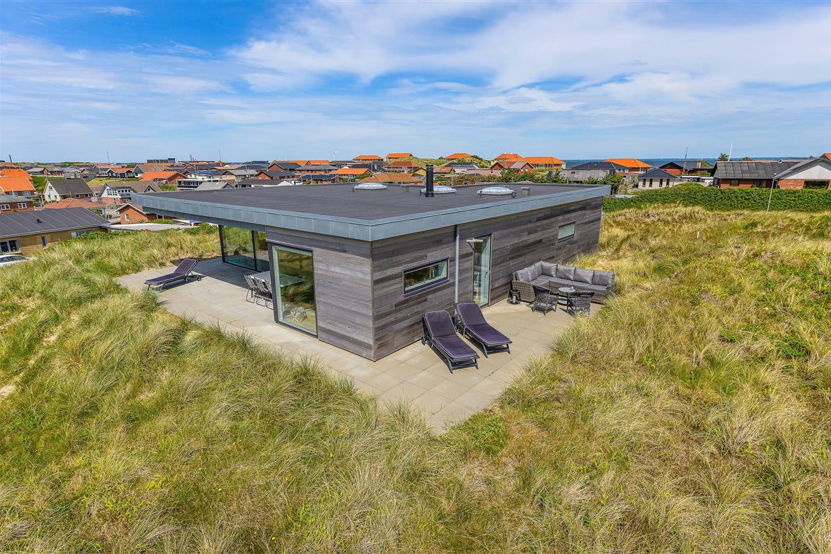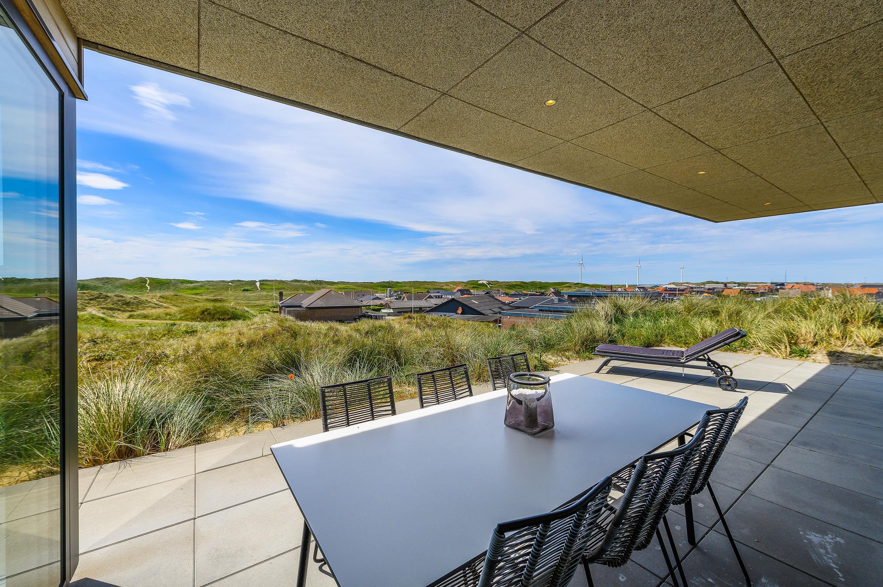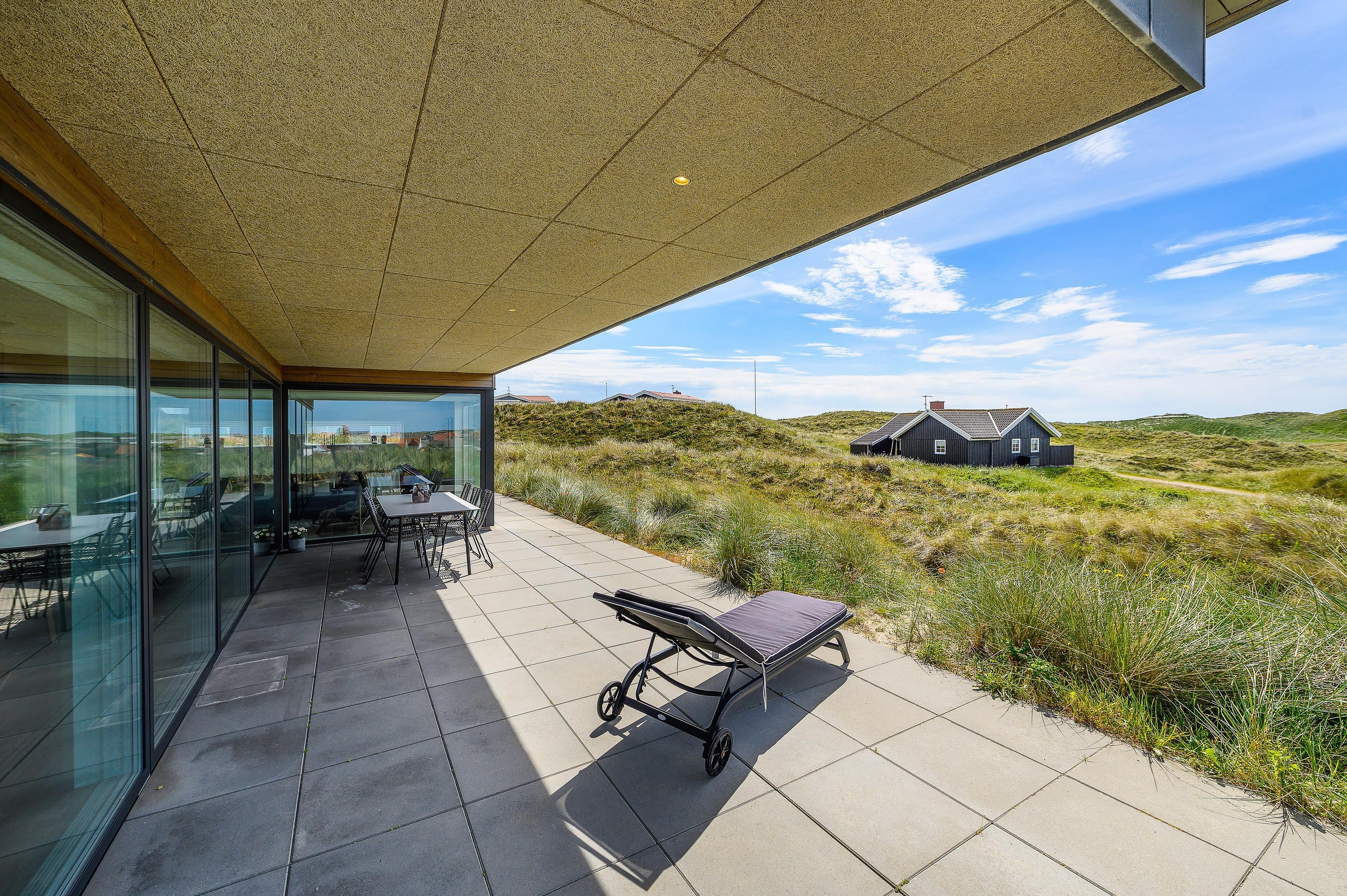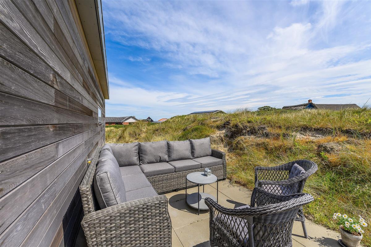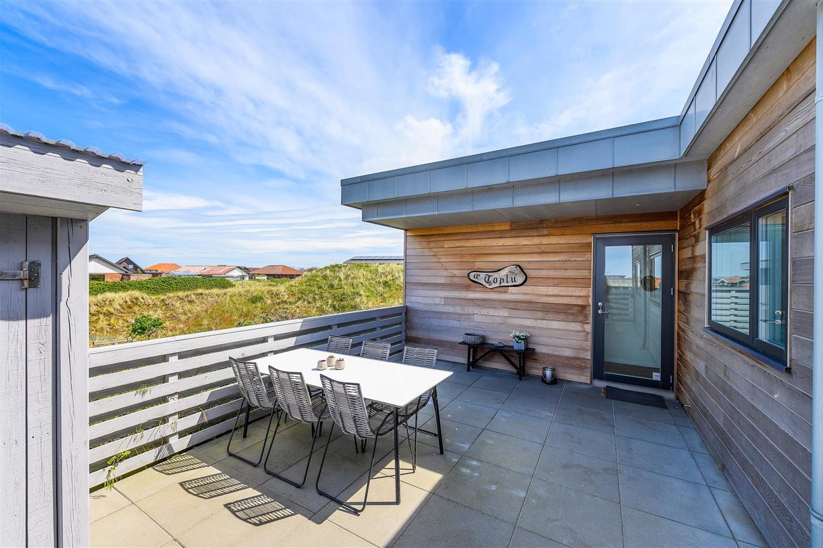 Start your day with a delicious breakfast on the east terrace, watching the sun rise over the fjord. In the evening, observe the sunset over the dunes and sea from the south-west terrace. The east terrace is enclosed and includes a storage room. The second terrace is spacious, partially covered and faces the sea.