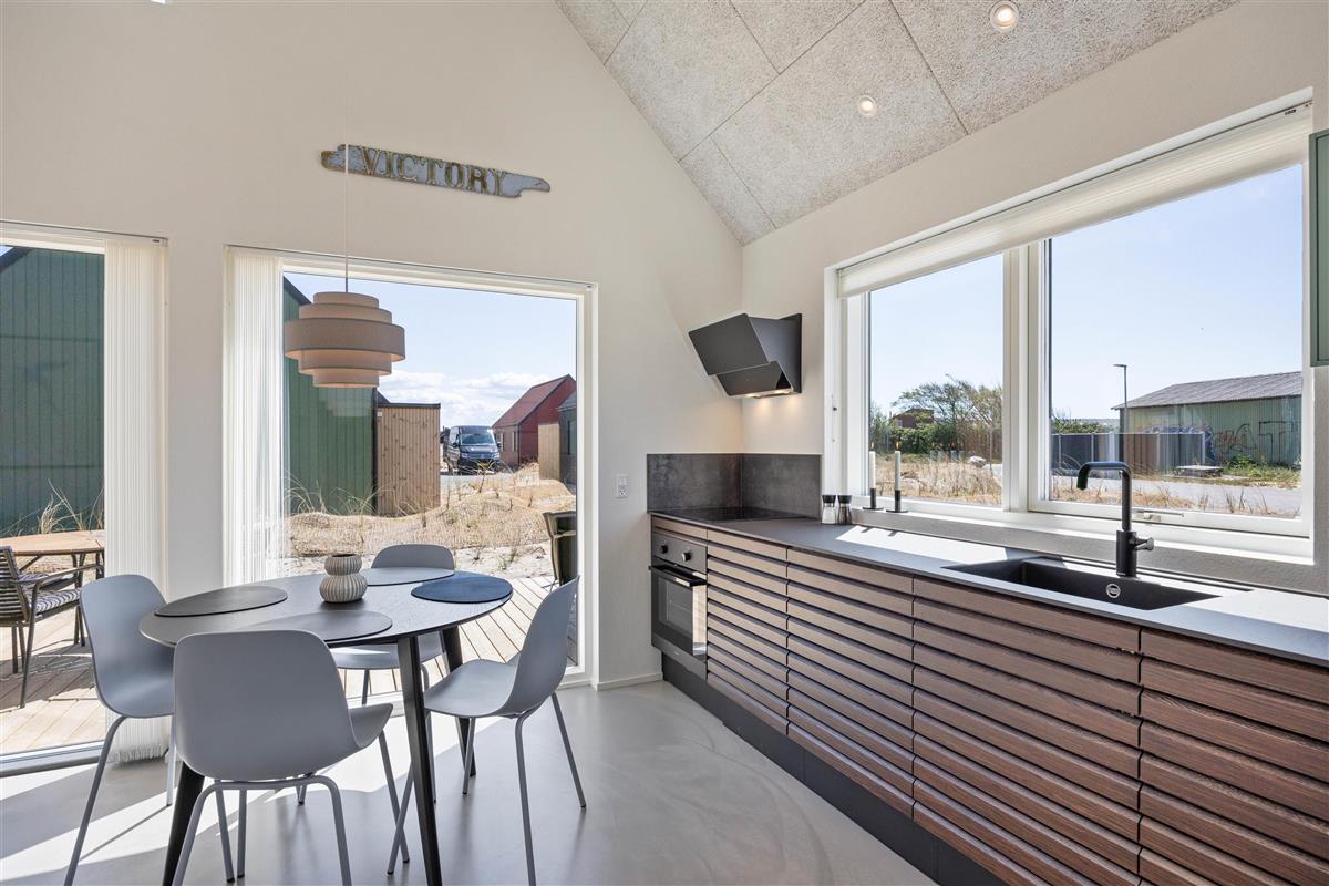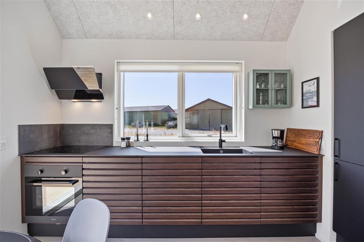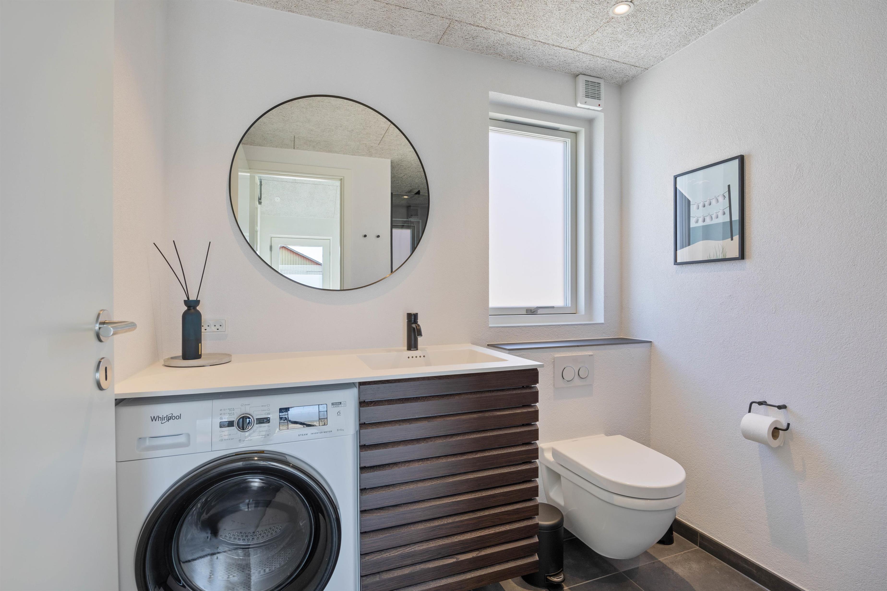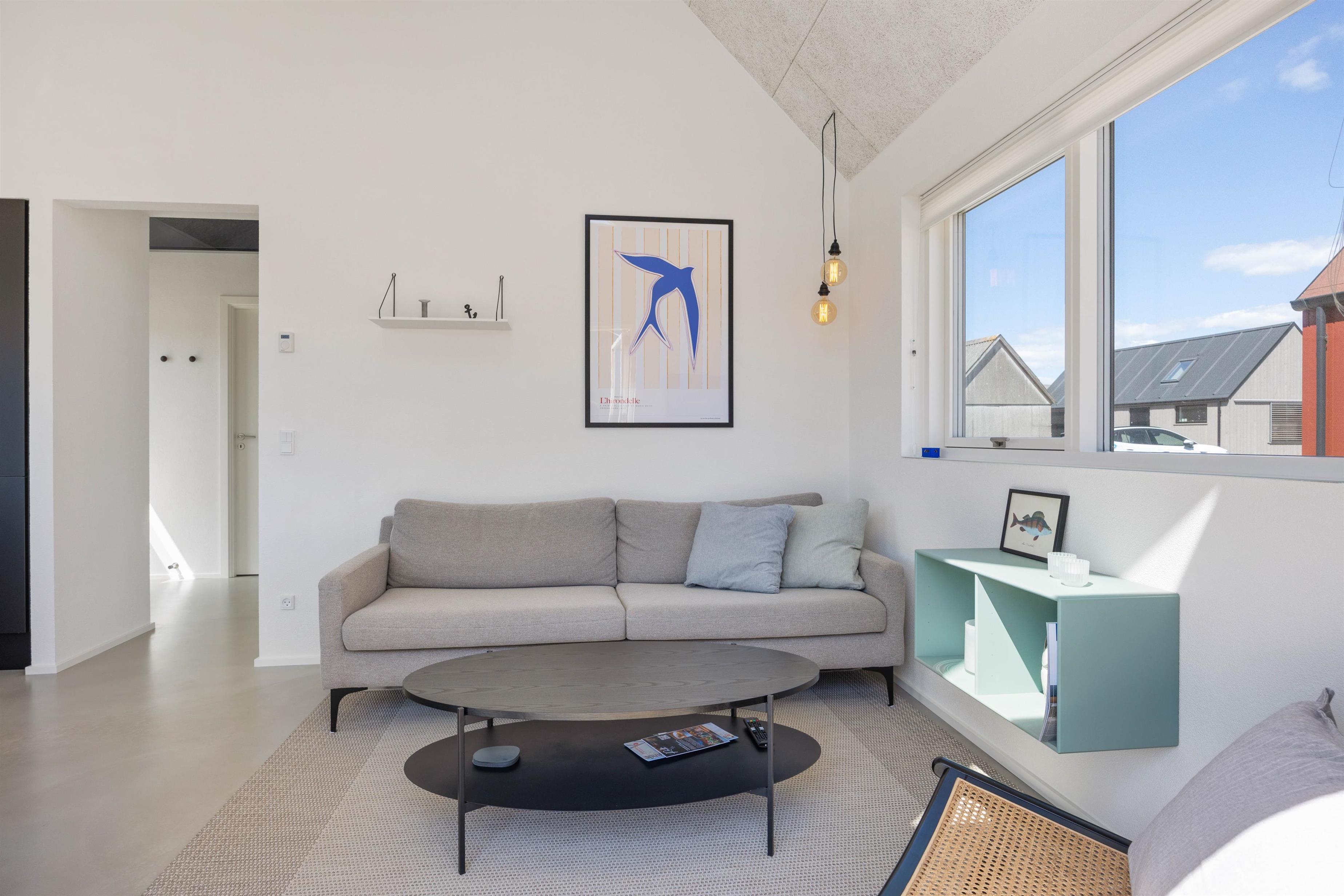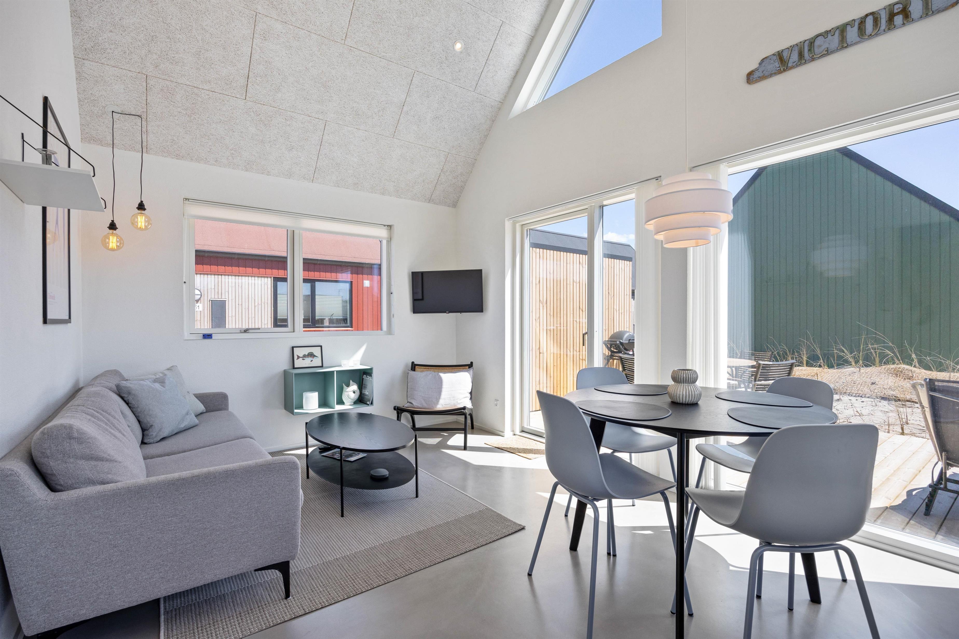 This modern holiday home is bright and inviting, furnished with comfortable furniture. The living area with open-plan kitchen is perfect for cooking together and having fun. Large windows offer views over Langsand, which you can enjoy from the comfortable sofa and dining table. In the evening, why not settle in for a film marathon? Thanks to Chromecast, you can stream various films directly to the TV.