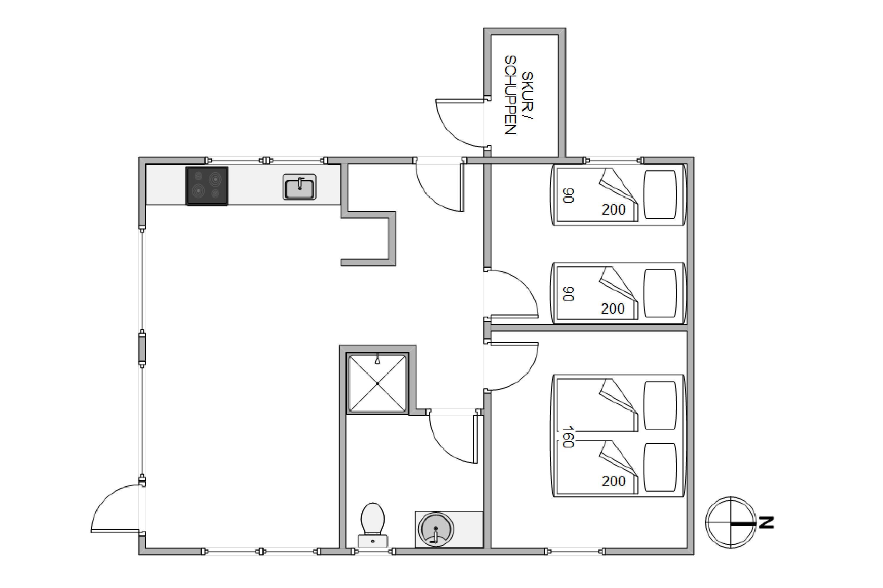 The open-plan living room with integrated kitchen and dining area is bright and welcoming. Here you'll find comfortable, modern furnishings in a light, contemporary style. The small but well-equipped kitchen includes a dishwasher. This modern 50-square-metre holiday home features two bedrooms, furnished with one double bed and two single beds.