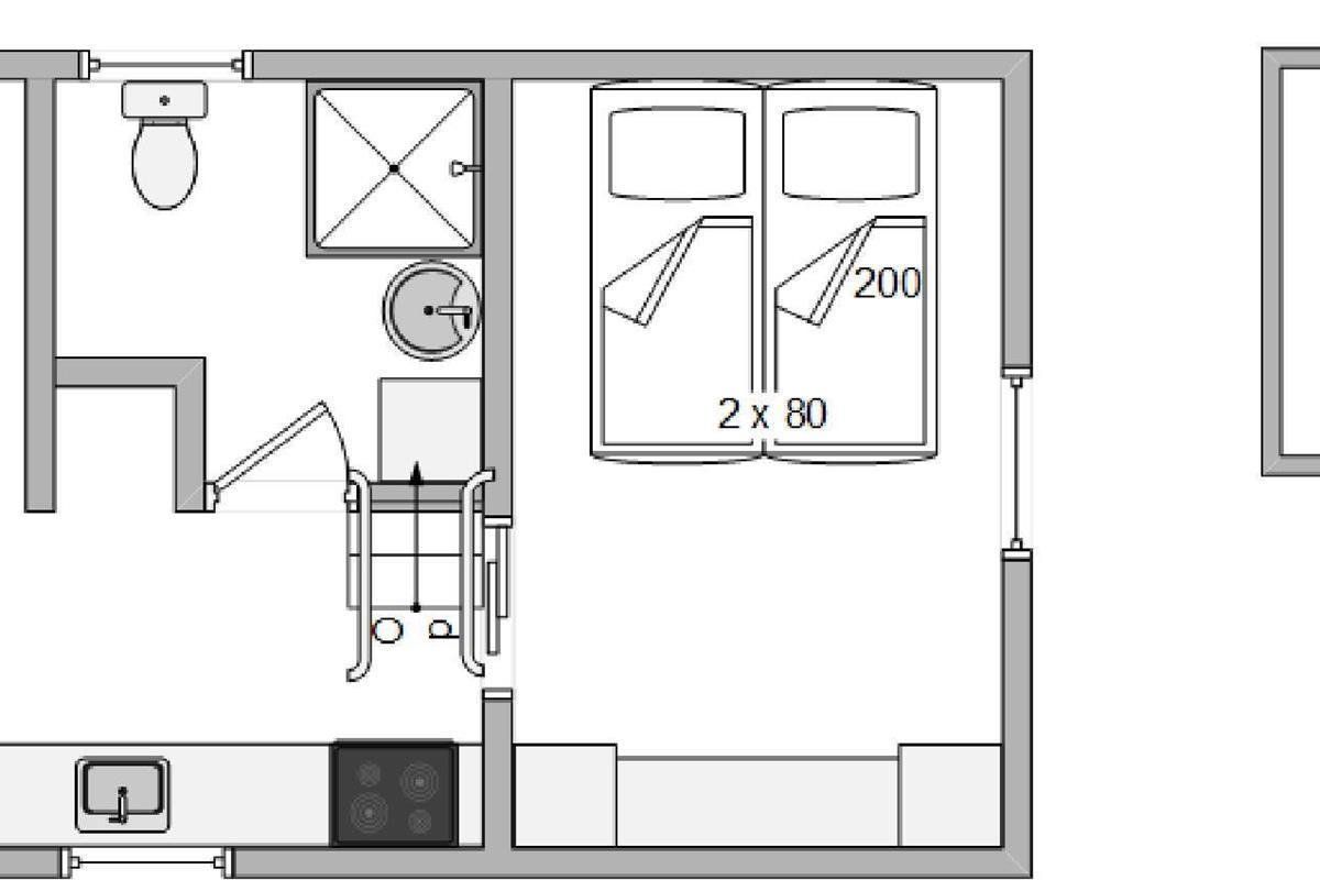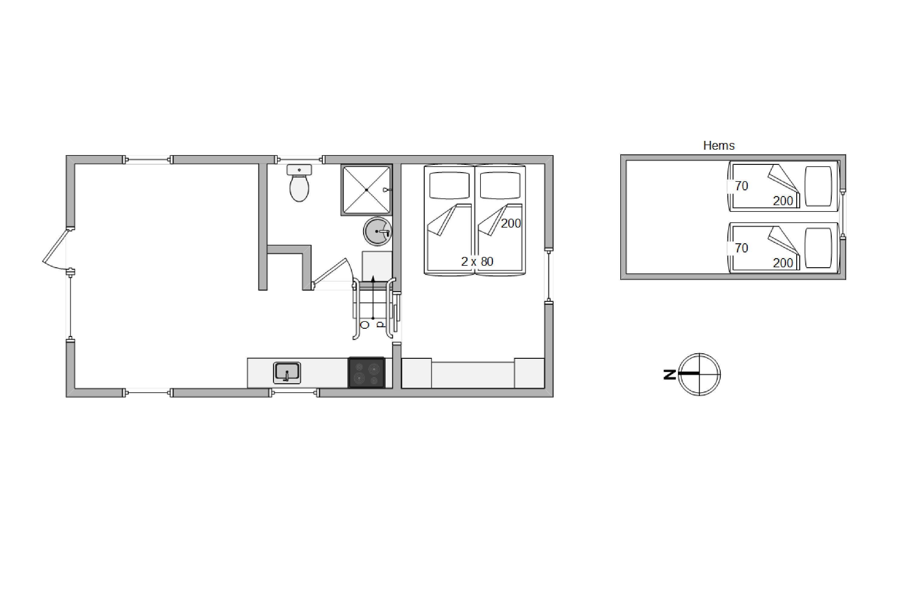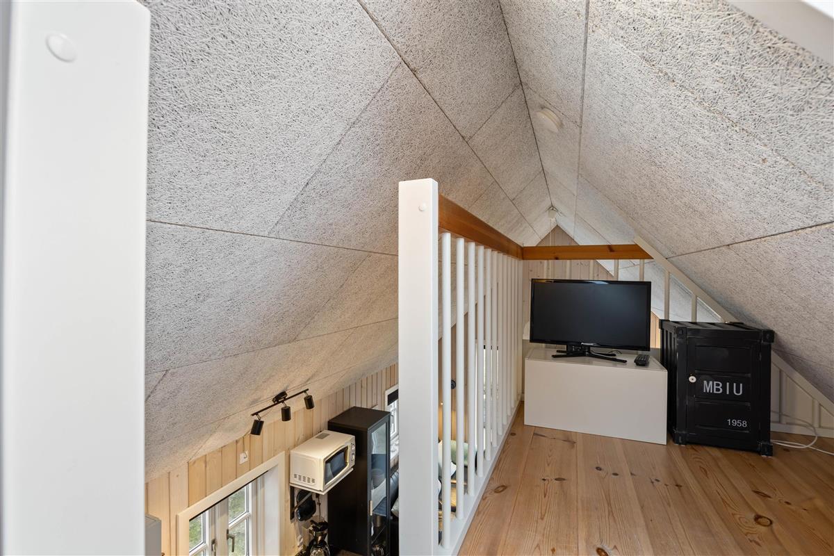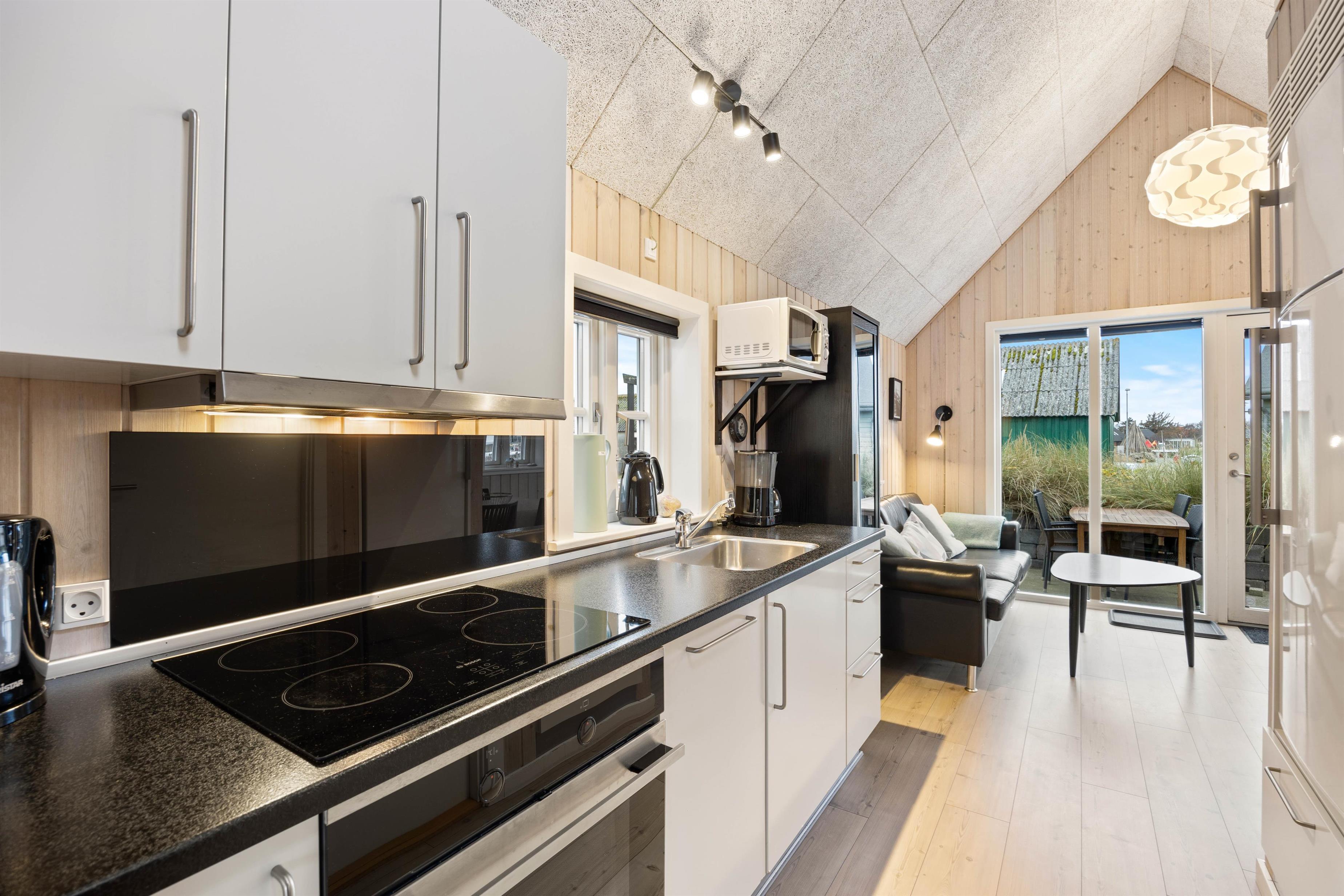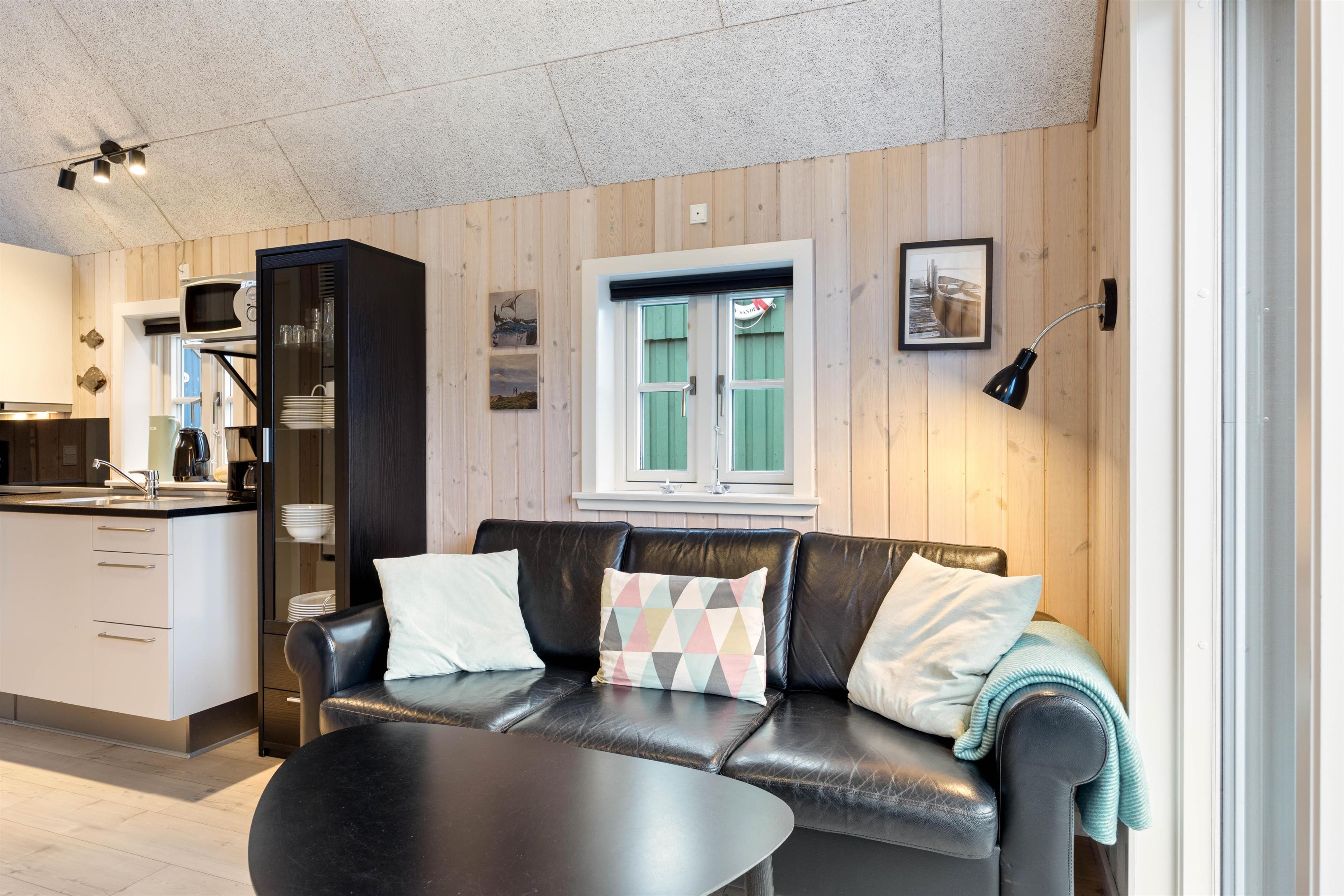 The welcoming living room opens onto the kitchen, from here you have access to the mezzanine sleeping area with 2 beds and TV connection for your own DVD player, PlayStation or similar devices. The living room features a flat-screen TV, and free Wi-Fi is available. The cabin is heated by an energy-efficient heat pump.