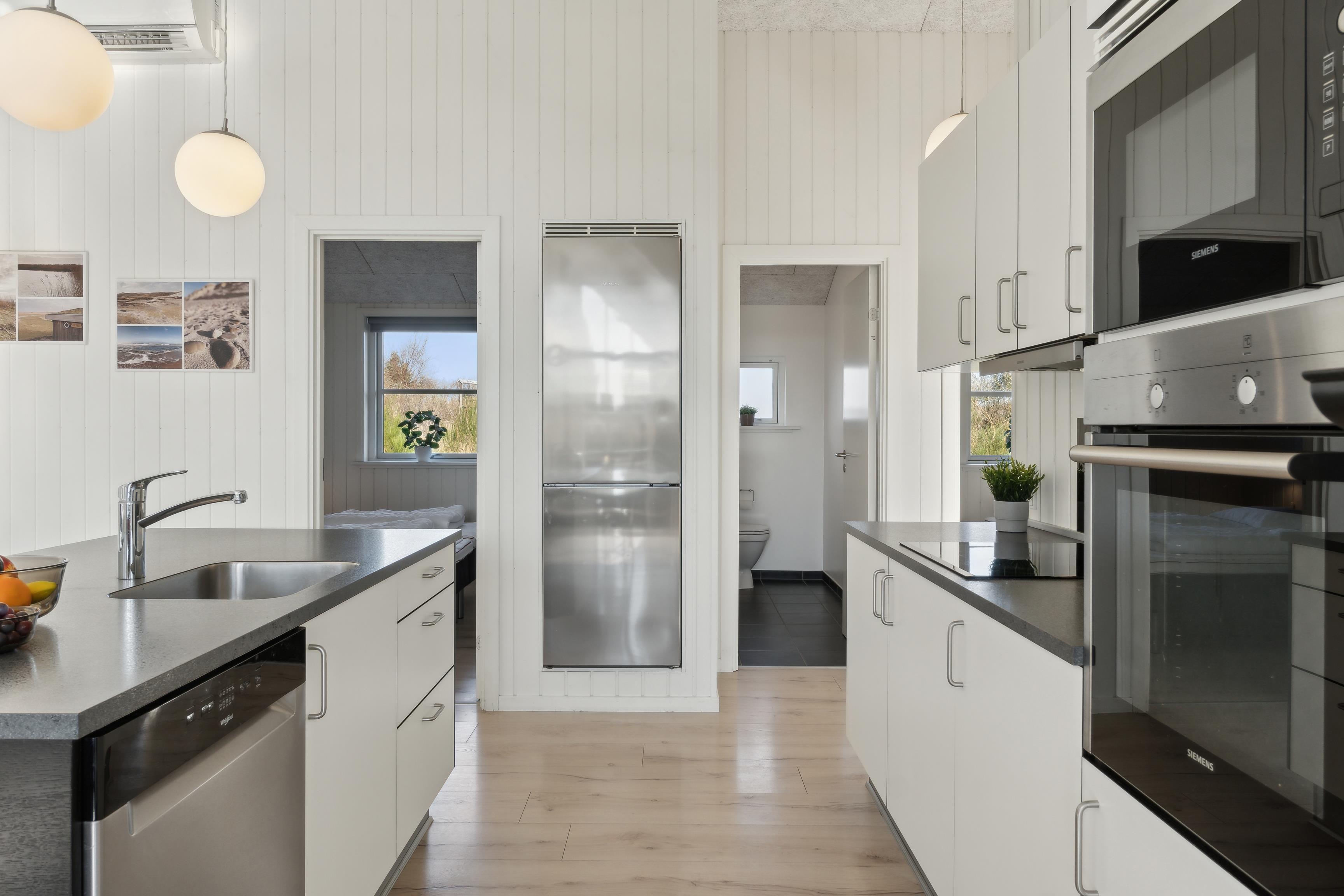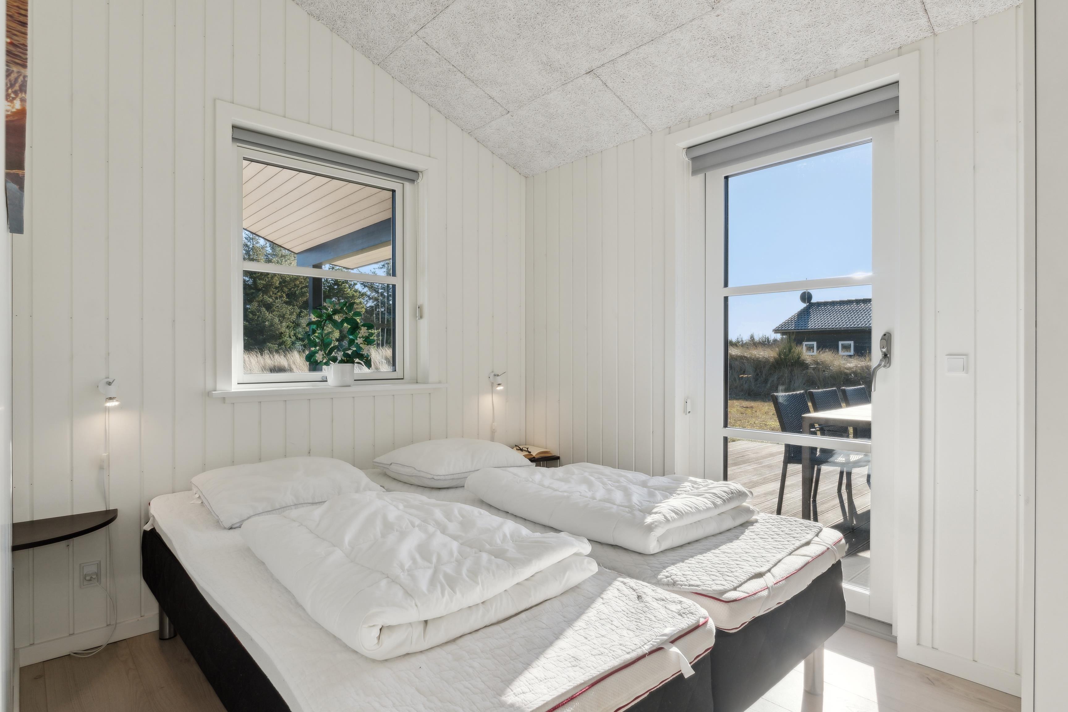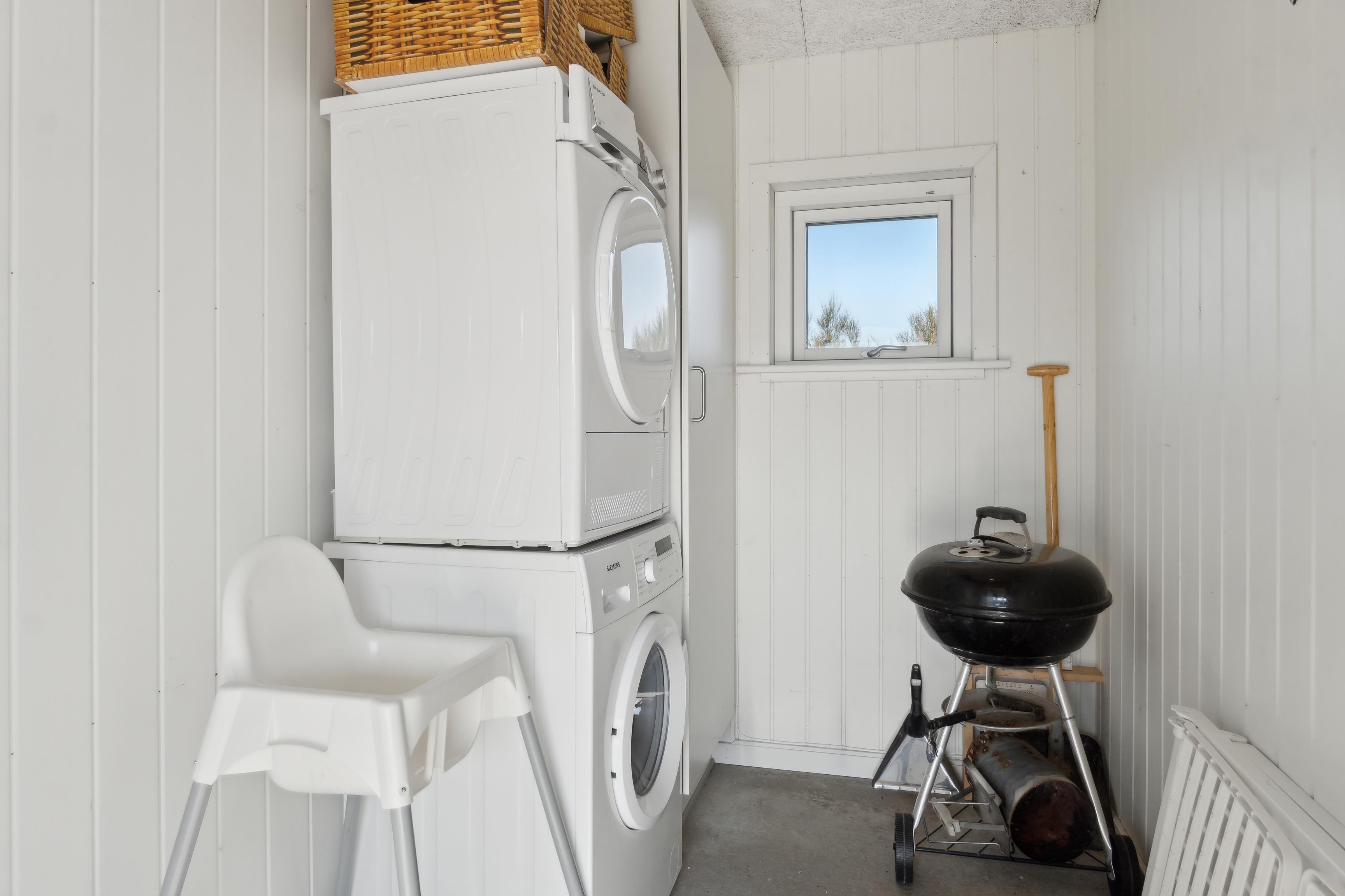 The summer house has three bedrooms, each furnished with two comfortable single beds that are pushed together to form double beds. Here, you can sleep soundly and wake up to the fresh sea air. The house is also equipped with an energy-efficient heat pump, a washing machine, and a dryer—providing everything you need for a comfortable stay.