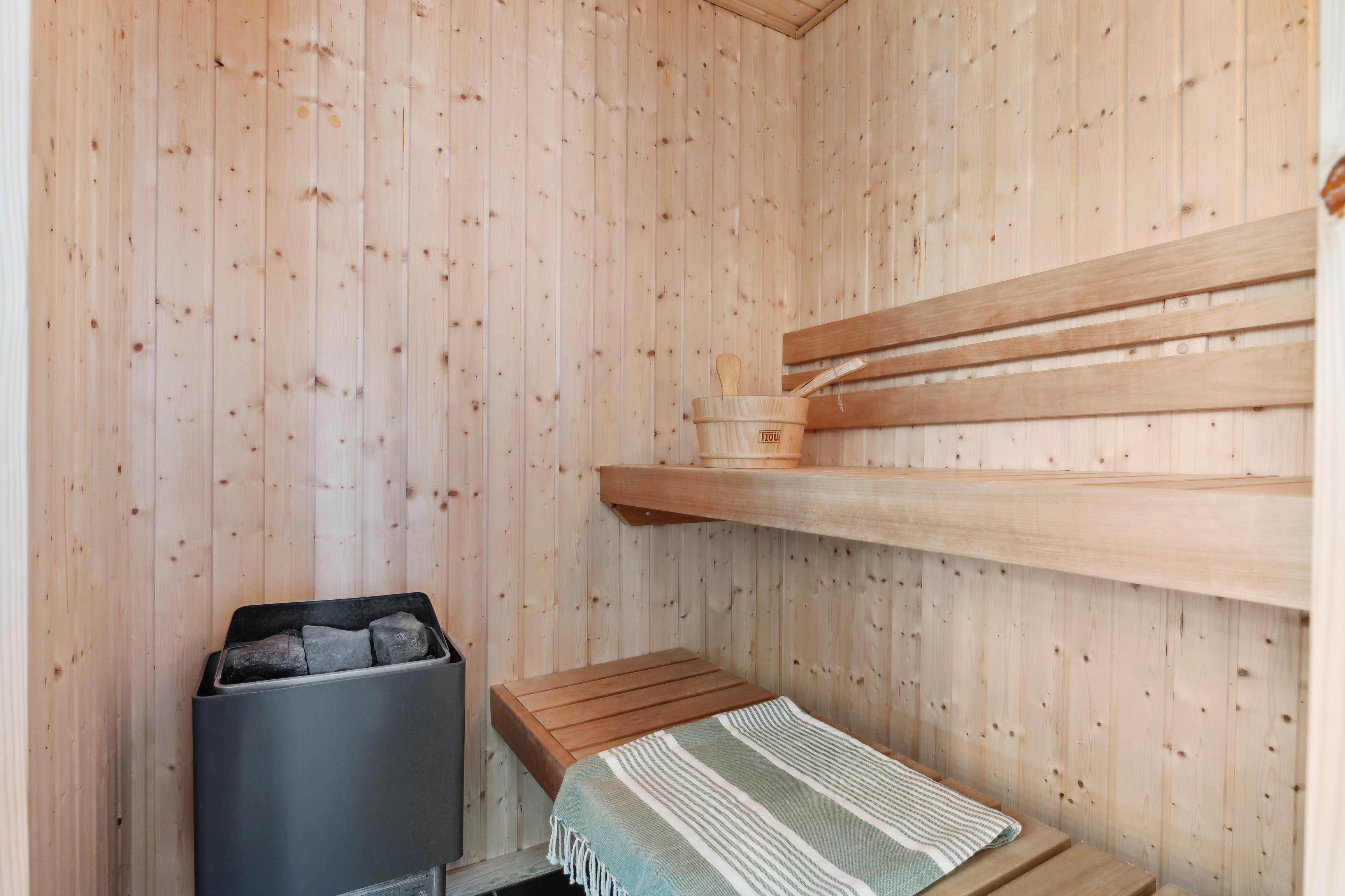 The open-plan kitchen is integrated with the living and dining area, allowing you to prepare delicious meals without missing out on quality time together. Enjoy a good book, play board games, or simply relax by the flickering flames of the stove. The bathroom is equipped with both a spa and a sauna, perfect for indulging in a relaxing wellness evening. Additionally, the house has a guest toilet for extra convenience.