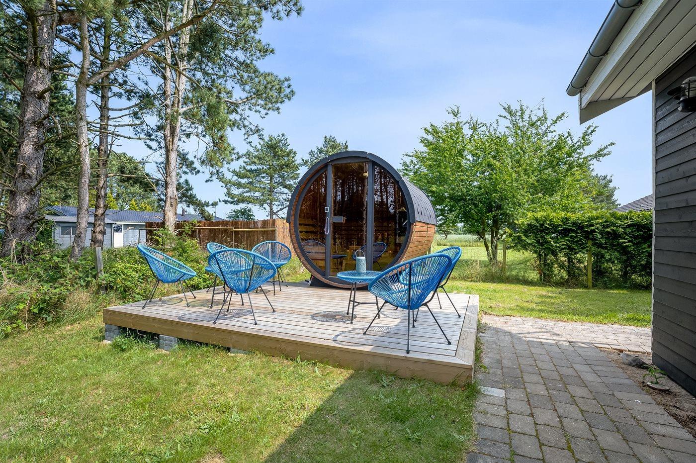 De vakantiewoning is gelegen op een 1000 m² groot aangelegde tuin. De grond is omheind. Afstand tot de zee 800 m. Dichtstbijzijnde winkel 5000 m. Er is een golfbaan op een afstand van 15000 m. Bij de vakantiewoning hoort terras. Daarnaast is er een overdekt terras. Zandbak. Afstand tot speelplaats 6000 m. Buitensauna. Buitendouche. Barbecue. Parkeerplaats bij het huis.