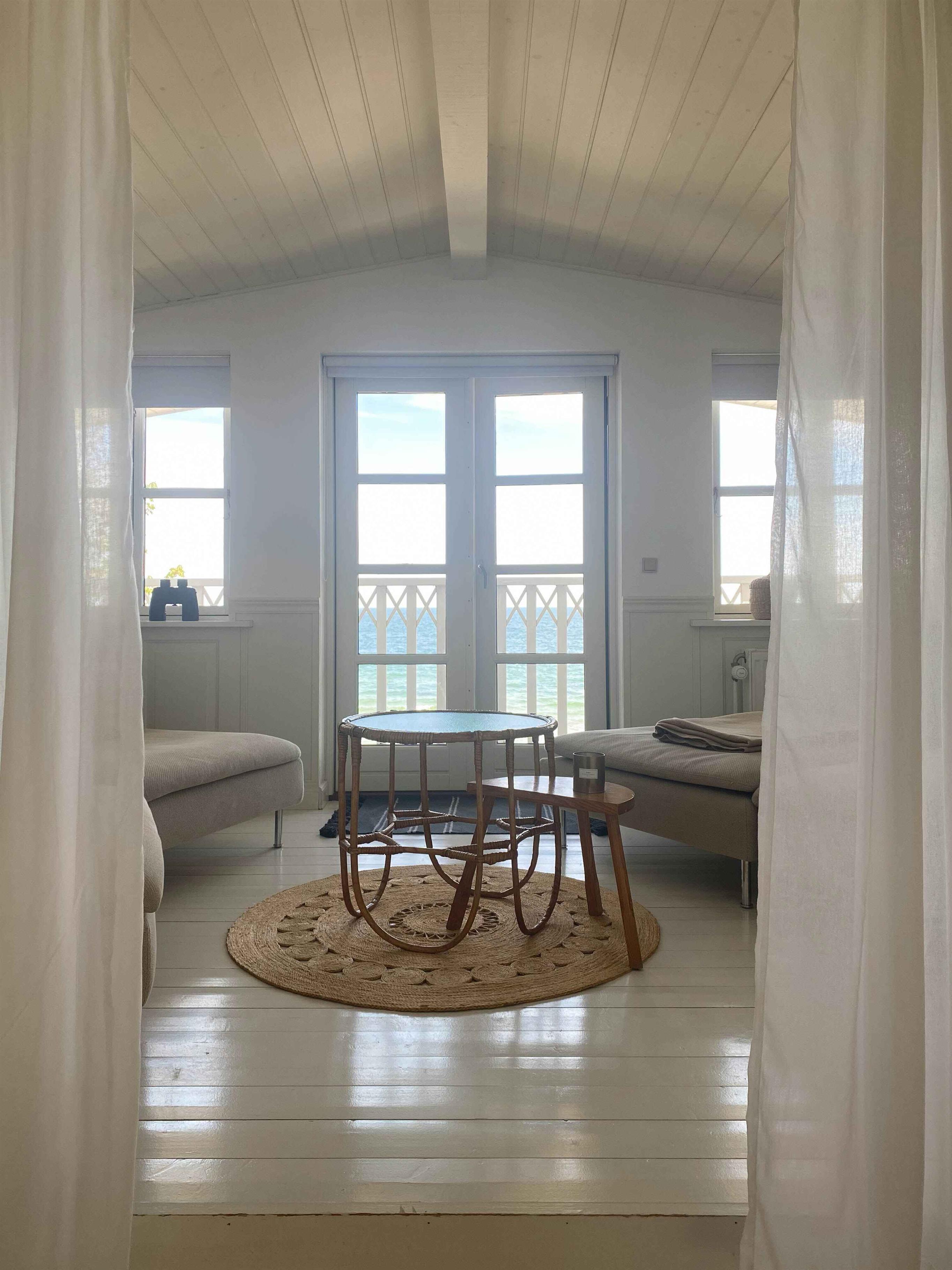 Aan de prachtige Ulslev Strand ligt dit unieke vakantiehuis, dat op het eerste gezicht doet denken aan de klassieke Deense badhotels en van binnen is ingericht met inspiratie van oude Franse landhuizen. Het zomerhuis is gecreëerd met oog voor detail en een doordacht interieur. De hoge panelen en fijne ouderwetse vondsten staan in prachtig contrast met de ruwe, industriële keuken. De grote bank in de woonkamer biedt de perfecte setting om in elkaars gezelschap te ontspannen voor de oude porseleinen kachel of met een rustig uitzicht op de Oostzee. De "bibliotheek" op de eerste verdieping met een spectaculair uitzicht over de zee nodigt ook uit om urenlang te ontspannen. Vanaf hier heb je een spectaculair uitzicht over de Oostzee - met de blik op de horizon, vind je hier snel een bijzondere rust in lichaam en geest. Op de eerste verdieping is er ook een balkon met rotan stoelen, waar je kunt genieten van de zonsopgang, zeilboten en de zee. Er is uitzicht op zee vanuit de keuken, de "bibliotheek", de woonkamer en vanuit twee slaapkamers. Door de hoge ligging van het huis roept het uitzicht associaties op met Zuid-Europa. Het is niet alleen binnen dat je de sfeer van Deense badhotels kunt voelen. Als je slechts 20 stappen naar beneden neemt vanaf het terras, sta je met je voeten in het zachte zand van Ulslev Strand. Het strand staat bekend om zijn zwemwater en zachte zand - dus je kunt vele uren van spel en ontspanning genieten zowel in de zomer als in de winter. Zelfs op het strand is het uitzicht speciaal - het Corselitze-bos smelt samen met het strand verderop in een bijna schilderachtig landschap.
