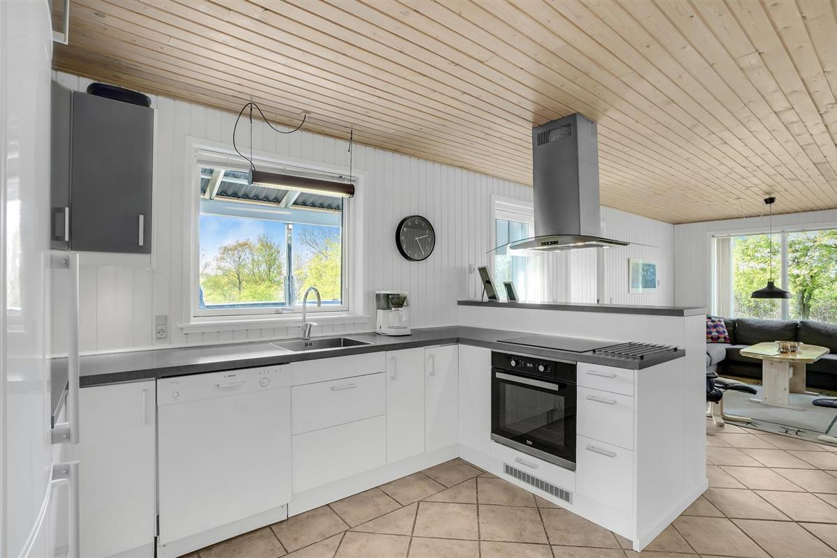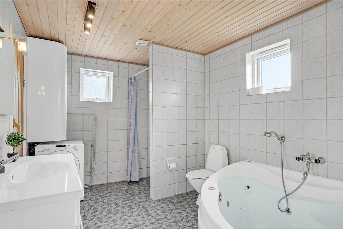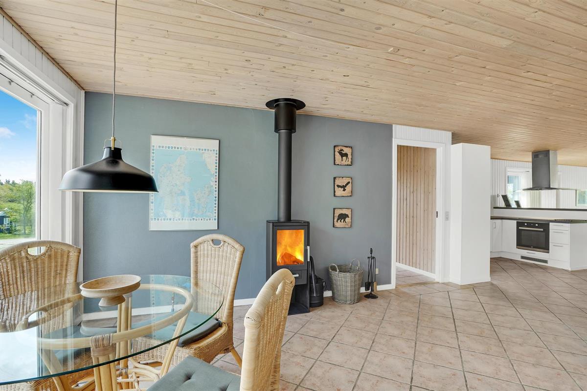 De lichte woonkamer met geloogde plafonds en muren is ingericht met gezellige grenen meubels en heeft toegang tot het gedeeltelijk overdekte terras. Tegelvloer in de woonkamer en keuken, tapijt in de kamers. In de sfeervolle badkamer met vloerverwarming kunt u na een wandeling in de omgeving genieten van een ontspannend massagebad in de whirlpool. Ook buiten kunt u heerlijk ontspannen in het Finse houten bad.