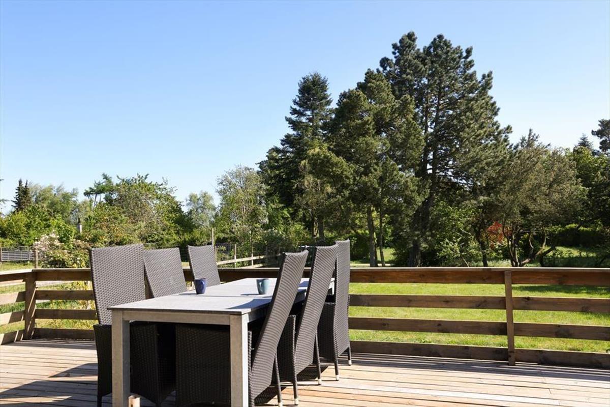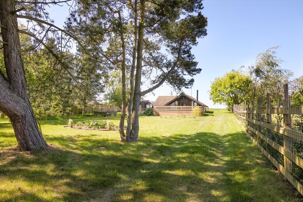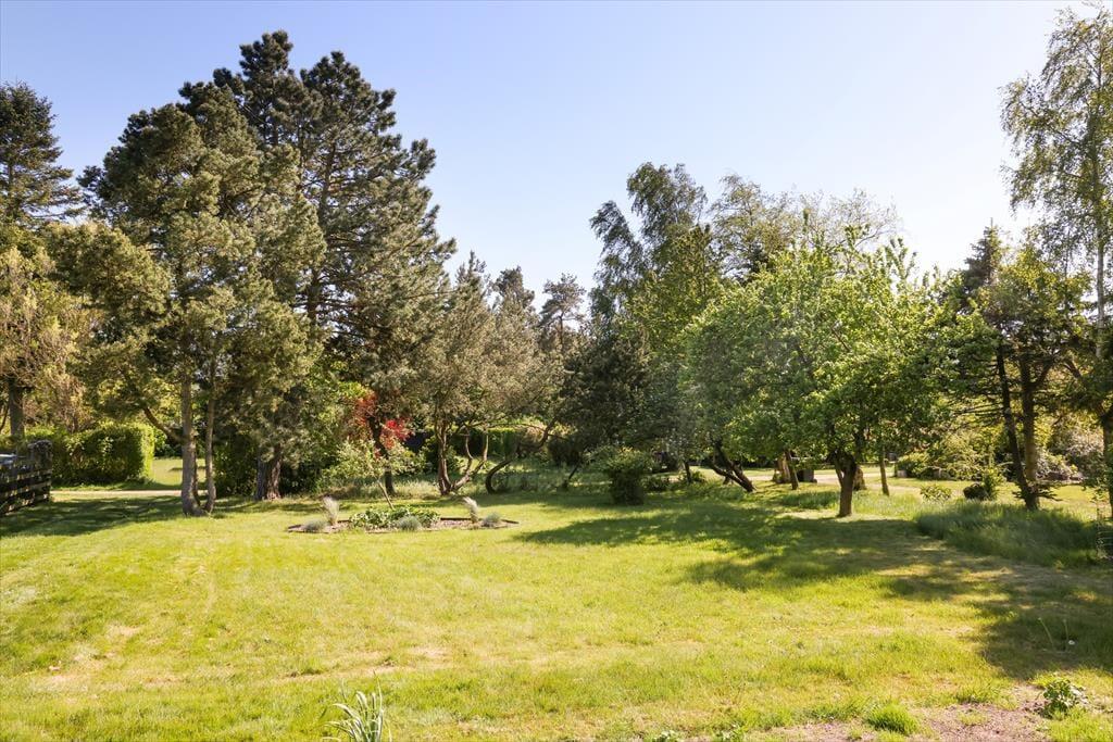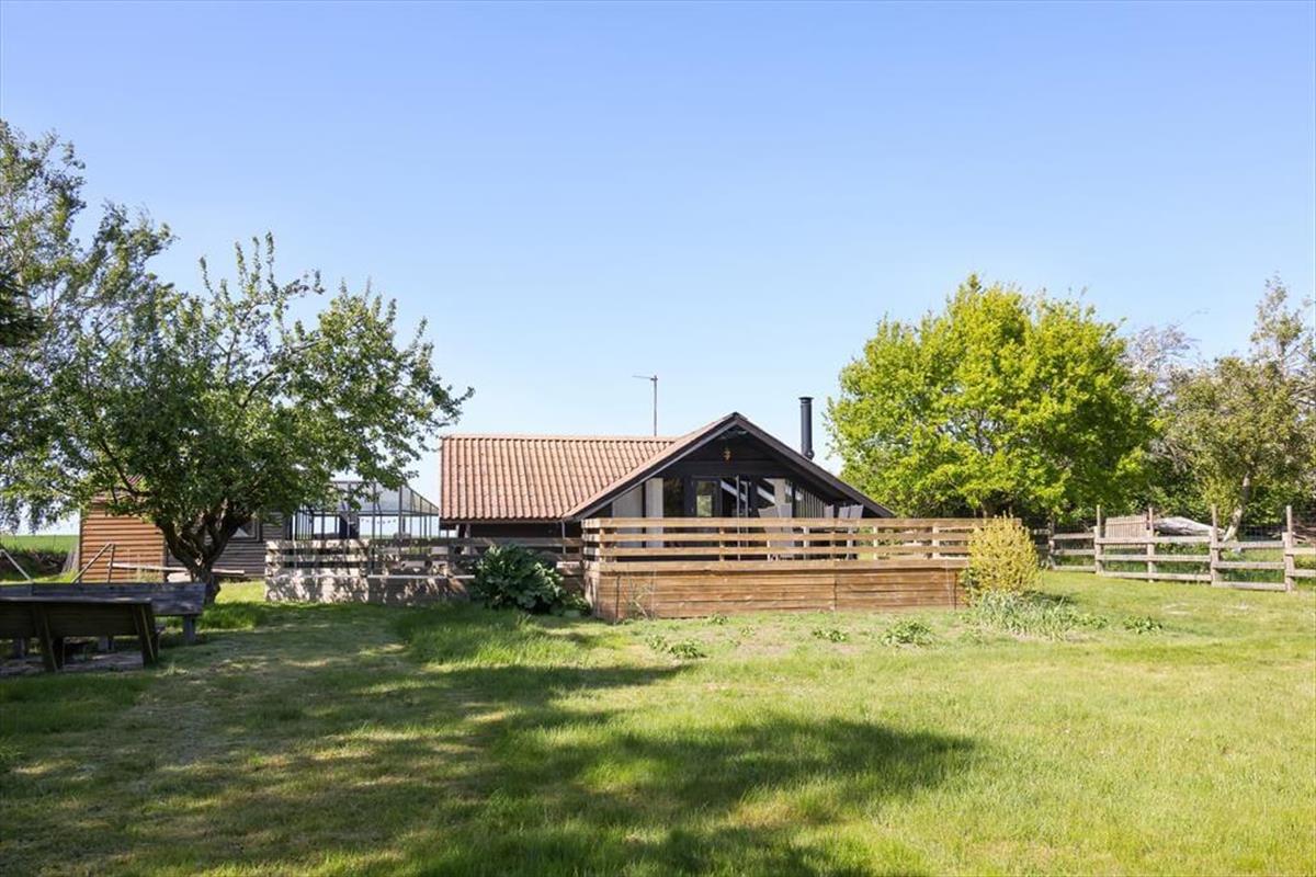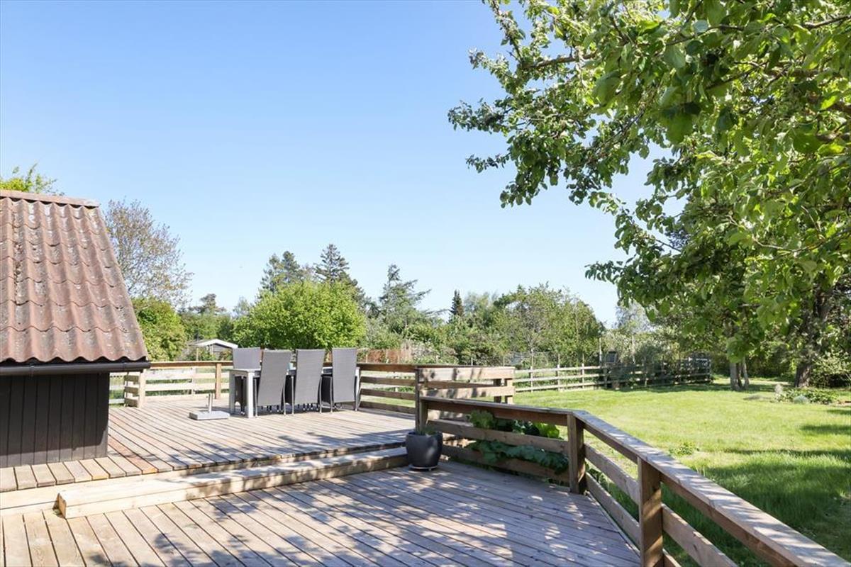 Sommerhuset er beliggende på en smuk grund med høje træer og buske. Der er masser af plads at boltre sig på, der kan både findes skygge og sol, og der kan konkurreres i haven med medbragte havespil. Udendørs kan en god frokost nydes med den skønneste udsigt over åbne marker og til skov. De tidlige og måske kølige morgenstunder kan nydes i orangeriet, ligeså kan sommeraftenerne når duggen falder på. Der er gode terrassearealer rundt om huset, så det er altid muligt at finde sol, skygge eller en lille lækrog.