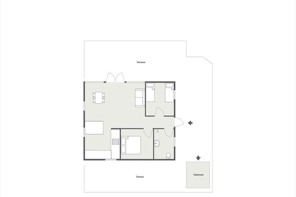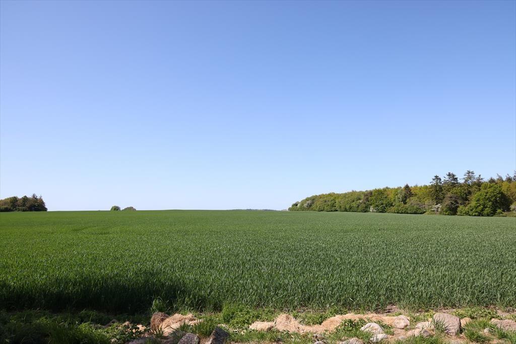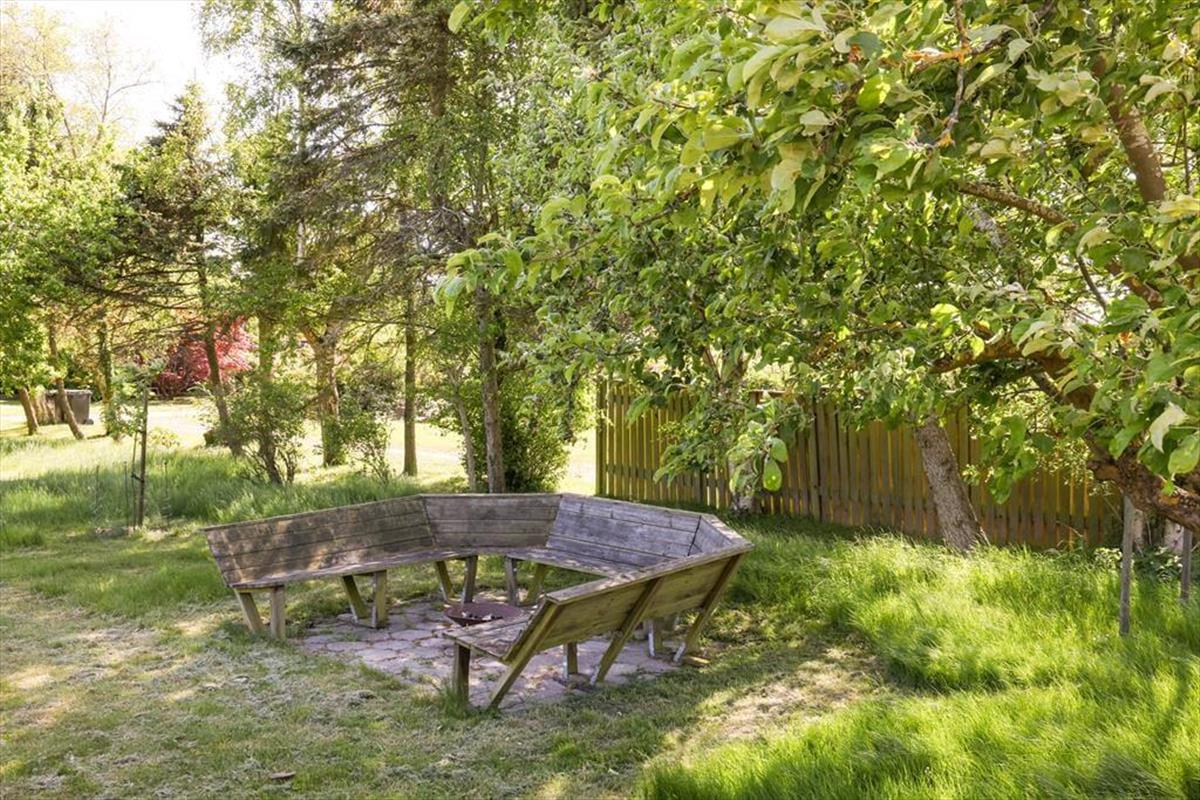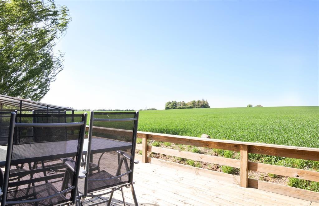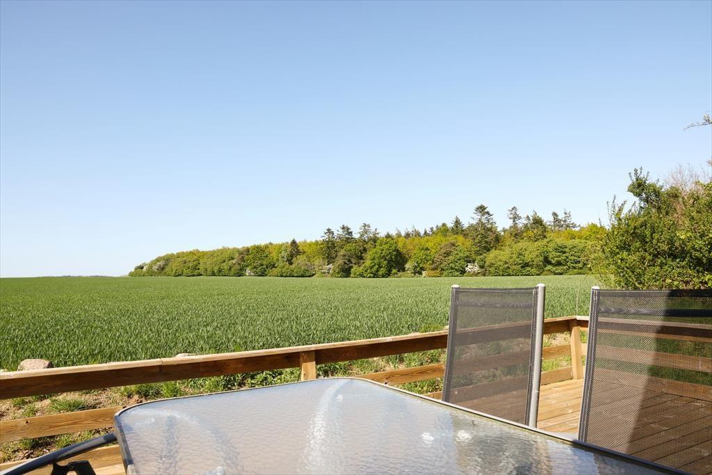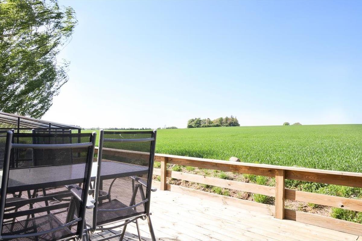 Sommerhuset er beliggende på en smuk grund med høje træer og buske. Der er masser af plads at boltre sig på, der kan både findes skygge og sol, og der kan konkurreres i haven med medbragte havespil. Udendørs kan en god frokost nydes med den skønneste udsigt over åbne marker og til skov. De tidlige og måske kølige morgenstunder kan nydes i orangeriet, ligeså kan sommeraftenerne når duggen falder på. Der er gode terrassearealer rundt om huset, så det er altid muligt at finde sol, skygge eller en lille lækrog.