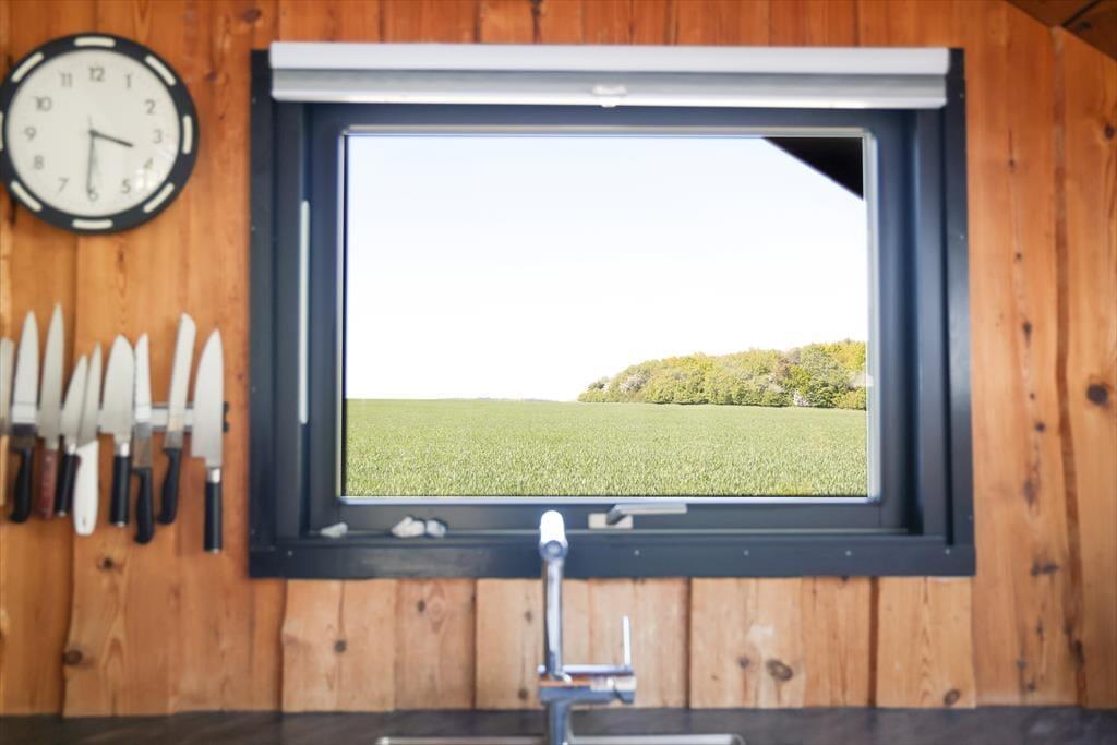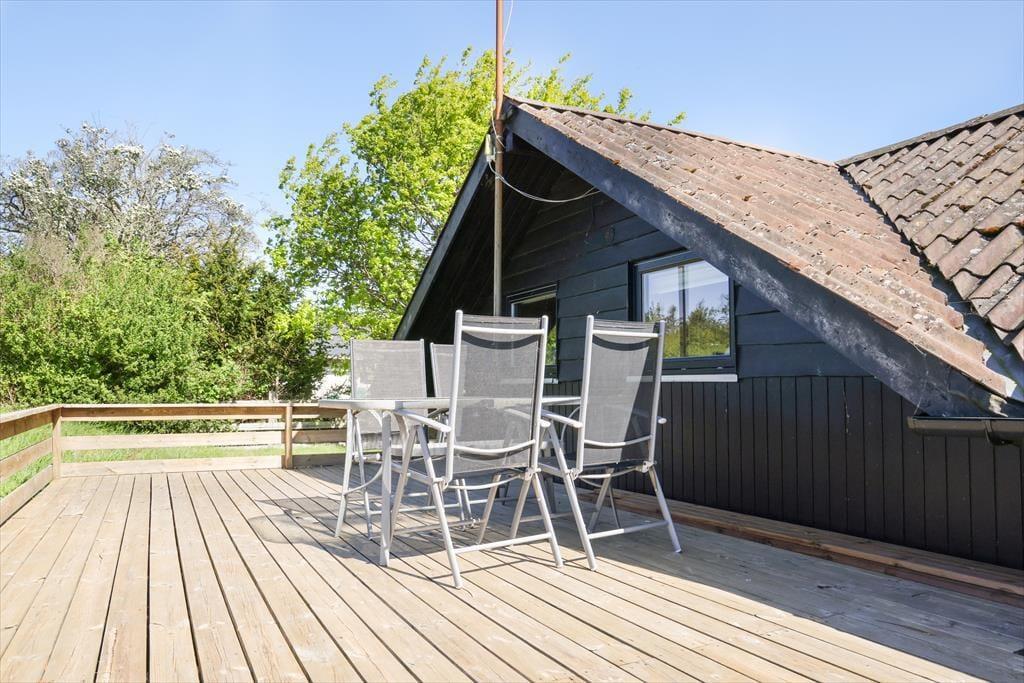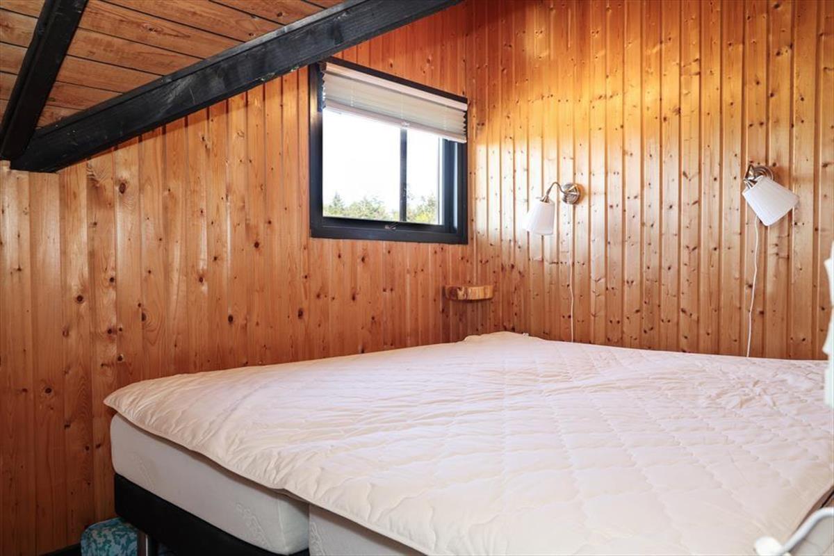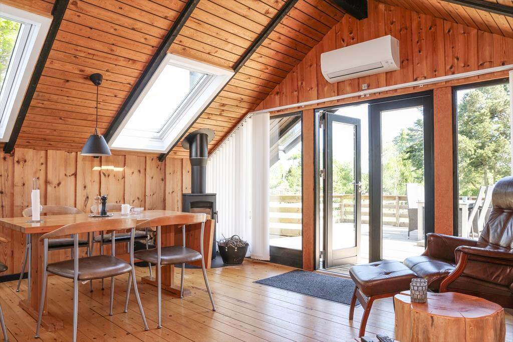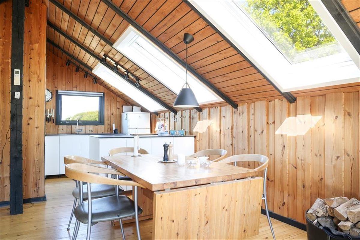 Indendørs mødes du af en hyggelig sommerhusatmosfære med brede plankegulve og trælofter. Sommerhuset er ikke stort men har en rigtig god stemning, en stemning af ferie og afslapning. Stuen som er samlingspunktet i sommerhuset, hvor dagens oplevelser kan drøftes om bordet, har udsigt til den haven via det store vinduesparti. Der er i dette sommerhus ikke opvaskemaskine, men til gengæld er du alligevel den heldige hvis du har vundet opvasken, fra køkkenvinduet kan du nemlig stå at nyde den fantastiske udsigt over marker og til skoven, så det er herfra du kan spotte både rådyr, harer og skovens andre dyr.