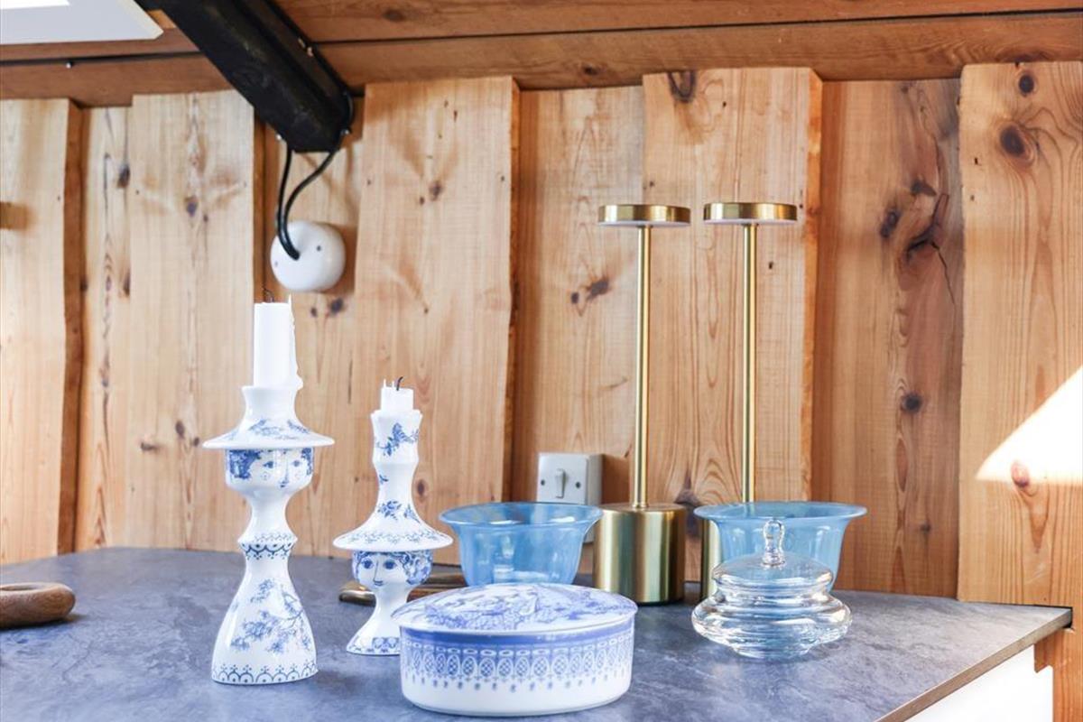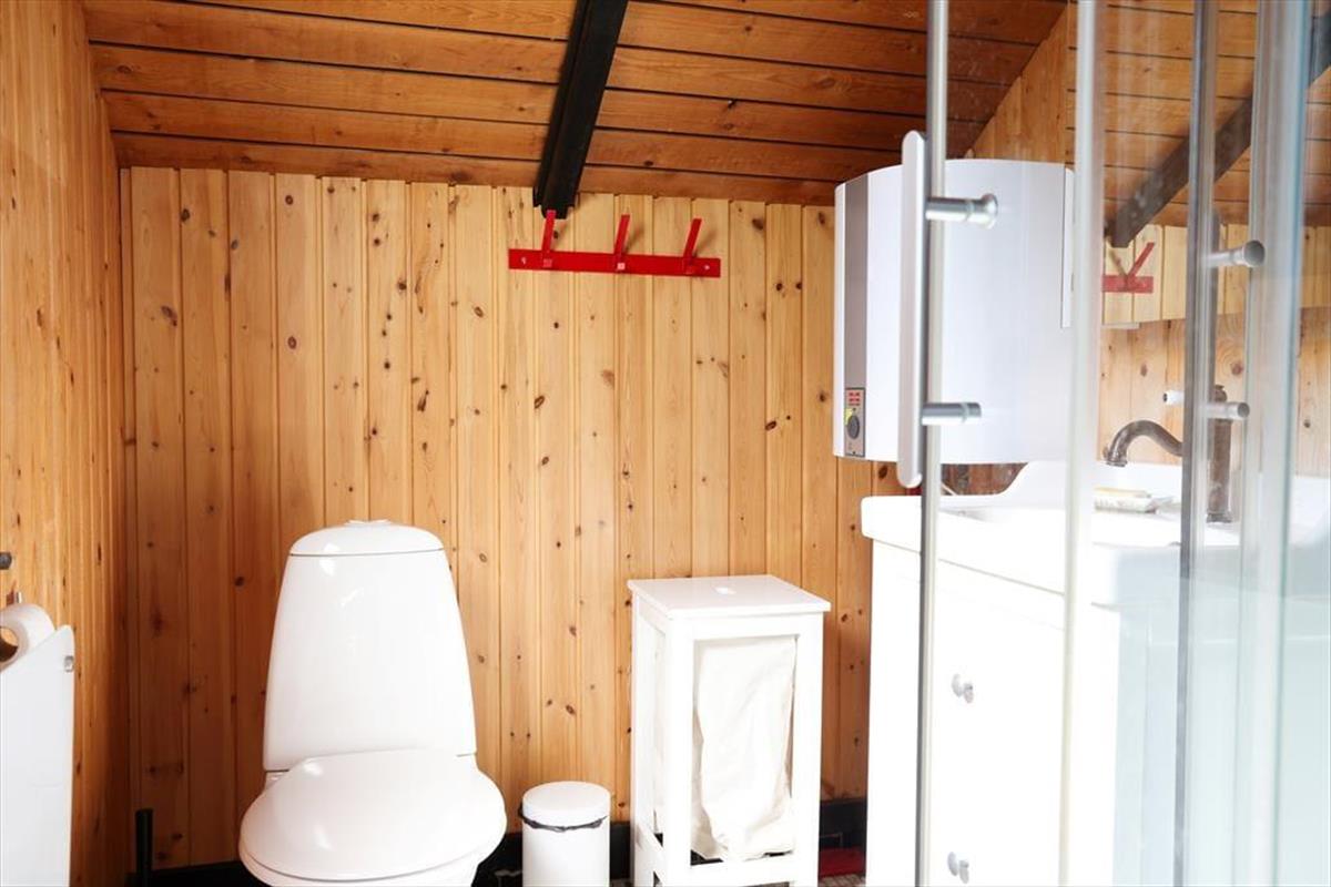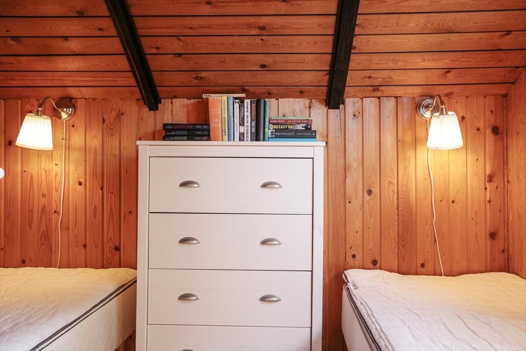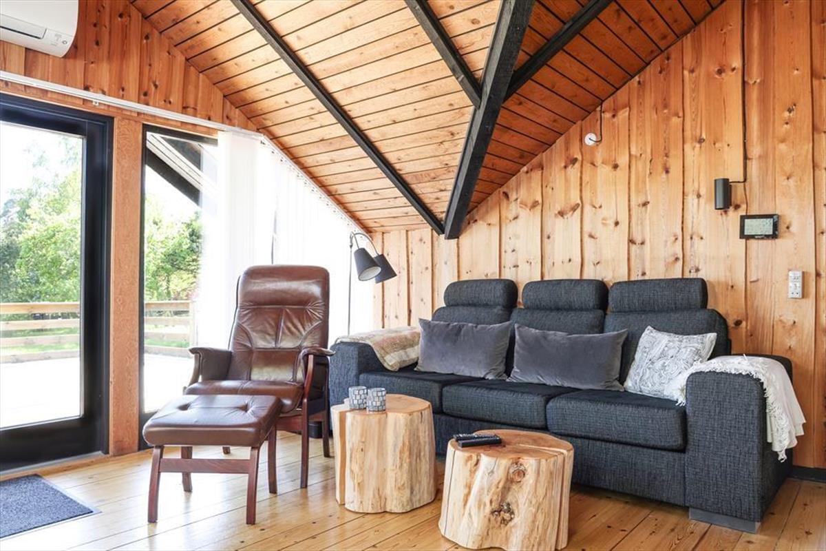 Indendørs mødes du af en hyggelig sommerhusatmosfære med brede plankegulve og trælofter. Sommerhuset er ikke stort men har en rigtig god stemning, en stemning af ferie og afslapning. Stuen som er samlingspunktet i sommerhuset, hvor dagens oplevelser kan drøftes om bordet, har udsigt til den haven via det store vinduesparti. Der er i dette sommerhus ikke opvaskemaskine, men til gengæld er du alligevel den heldige hvis du har vundet opvasken, fra køkkenvinduet kan du nemlig stå at nyde den fantastiske udsigt over marker og til skoven, så det er herfra du kan spotte både rådyr, harer og skovens andre dyr.