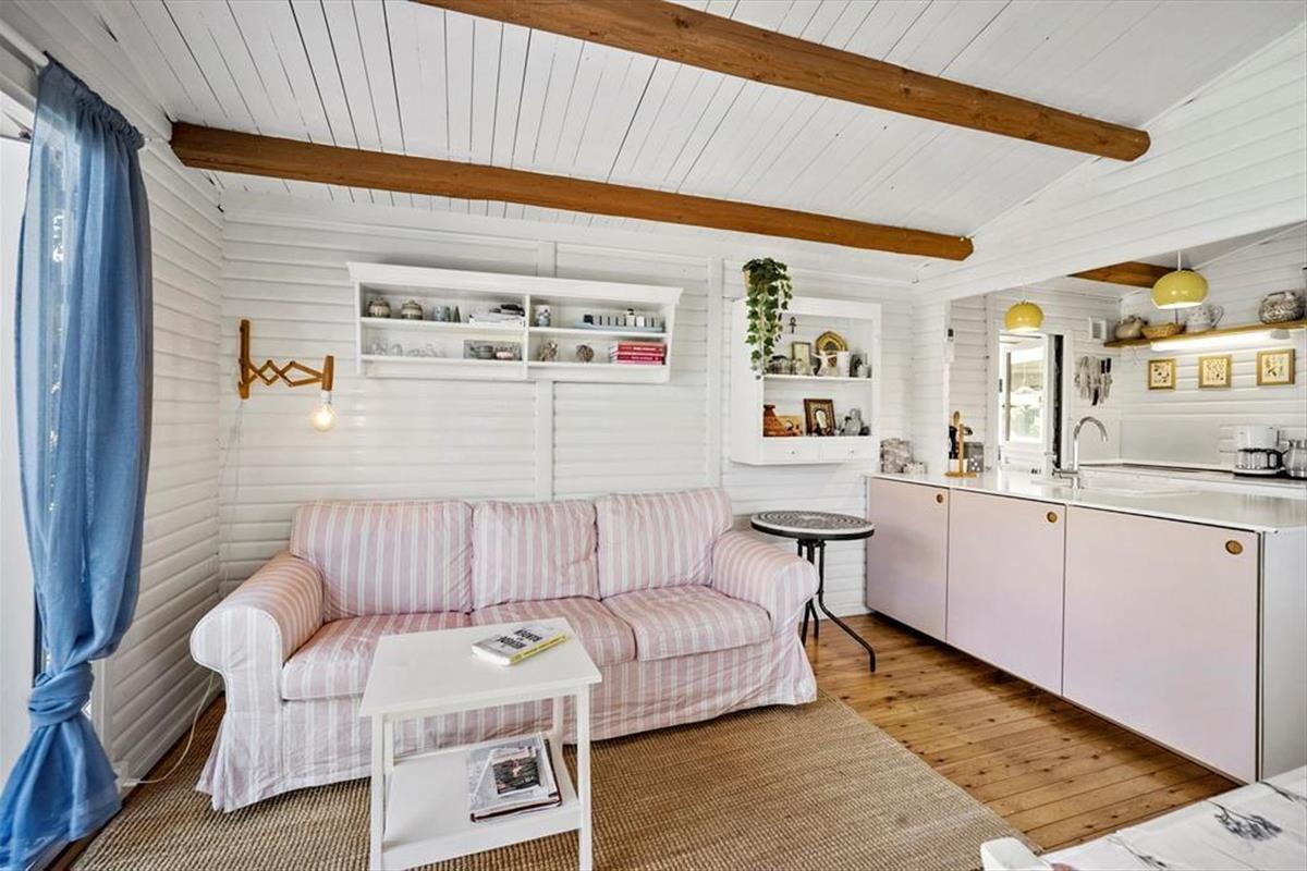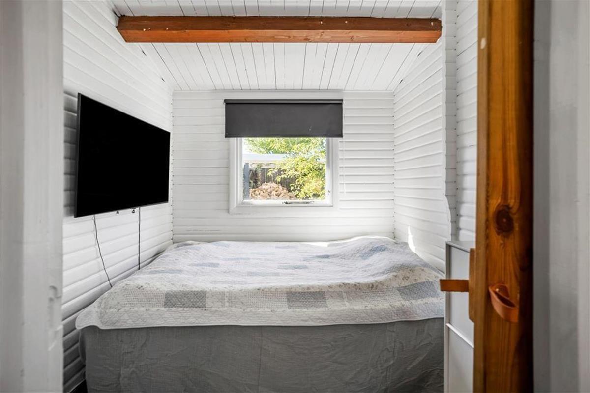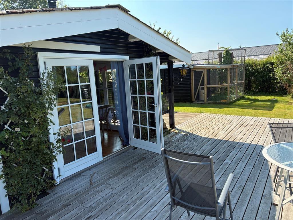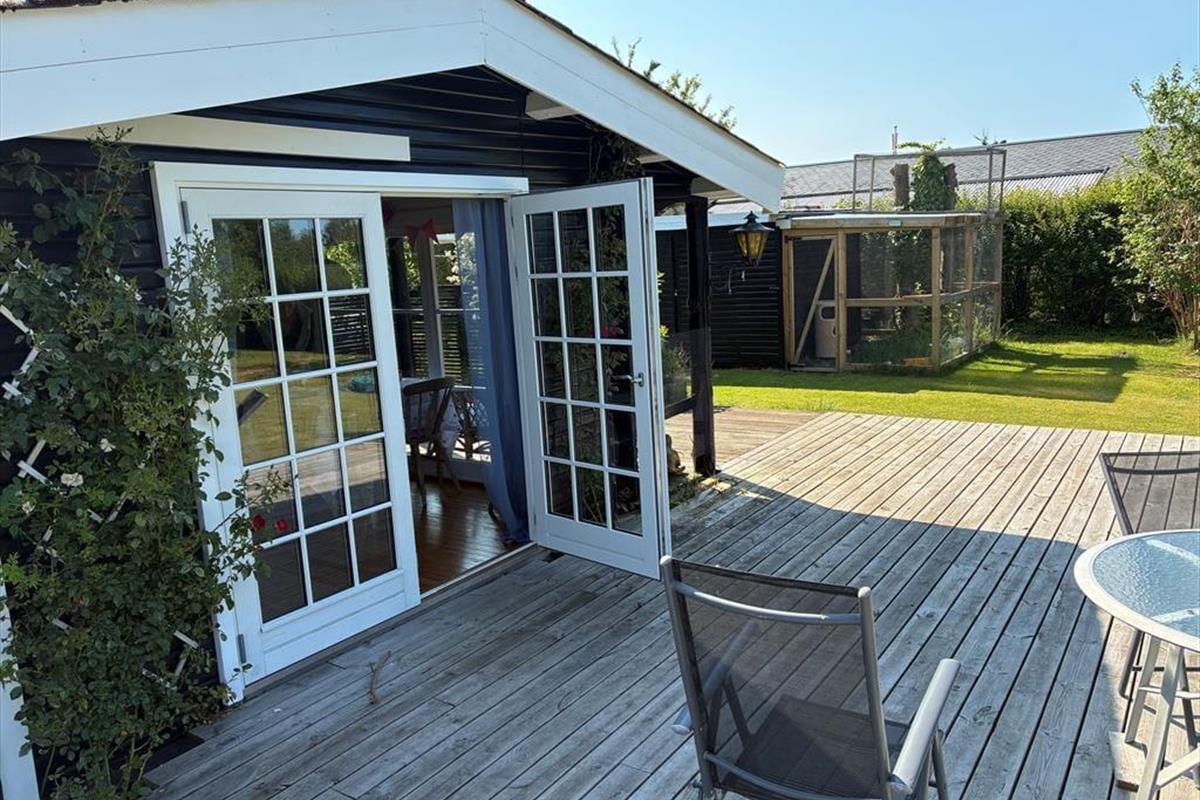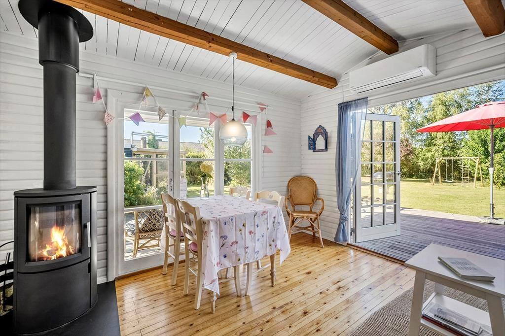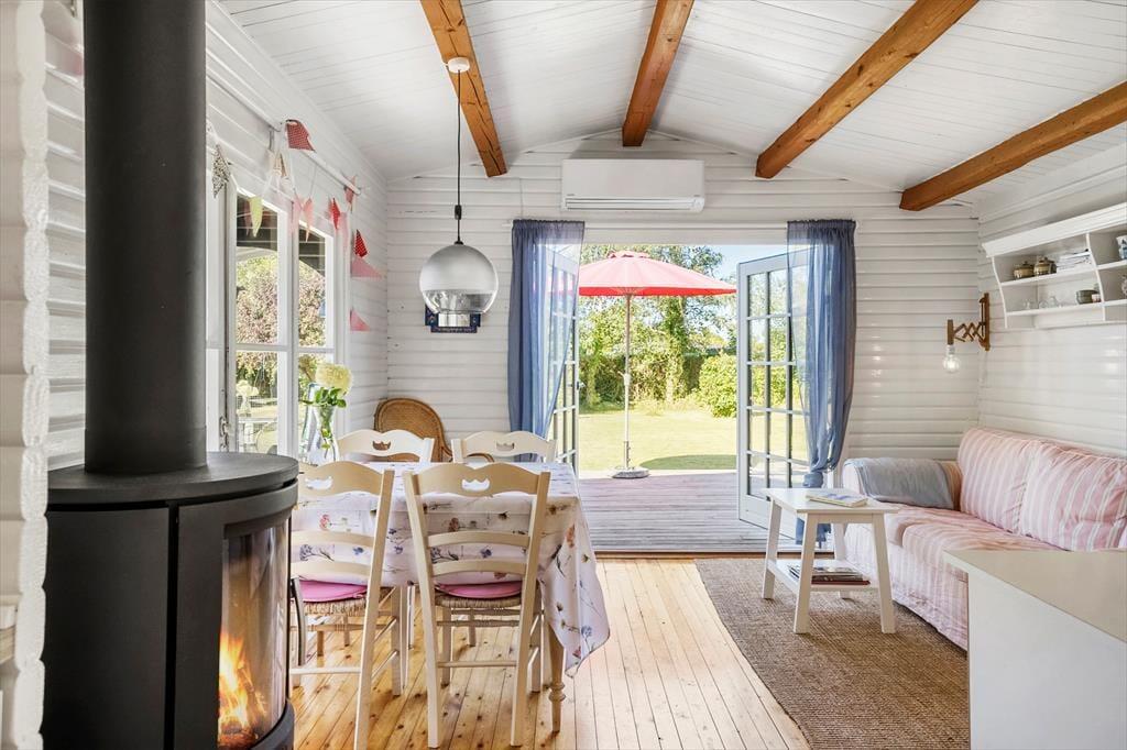 -in diesem schönen Ferienhaus. Das Haus hat eine Küche-Esszimmer alles in einem mit einem Holzofen, um eine gemütliche Wärme und Atmosphäre an einem kühlen Tag zu bieten. Das Haus hat 2 Schlafzimmer und einen Schlafbereich für den Wintergarten. In dem gut ausgestatteten Raum sind Sie nah beieinander, sowohl bei den Mahlzeiten als auch wenn Sie es sich in den weichen Möbeln gemütlich machen und Karten spielen wollen. Beachten Sie, dass sich der Fernseher im Schlafzimmer befindet.