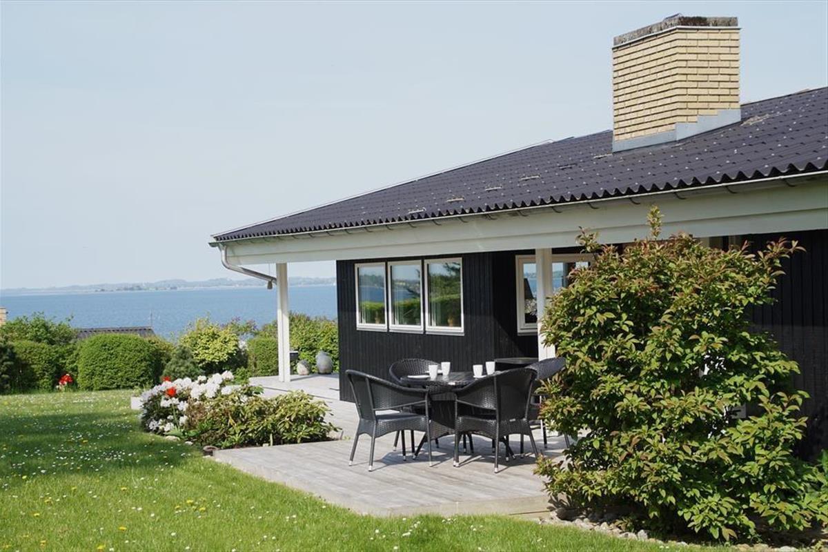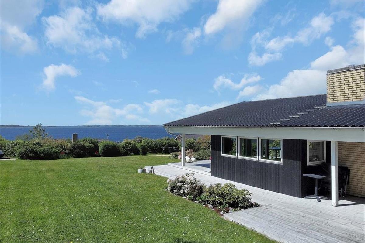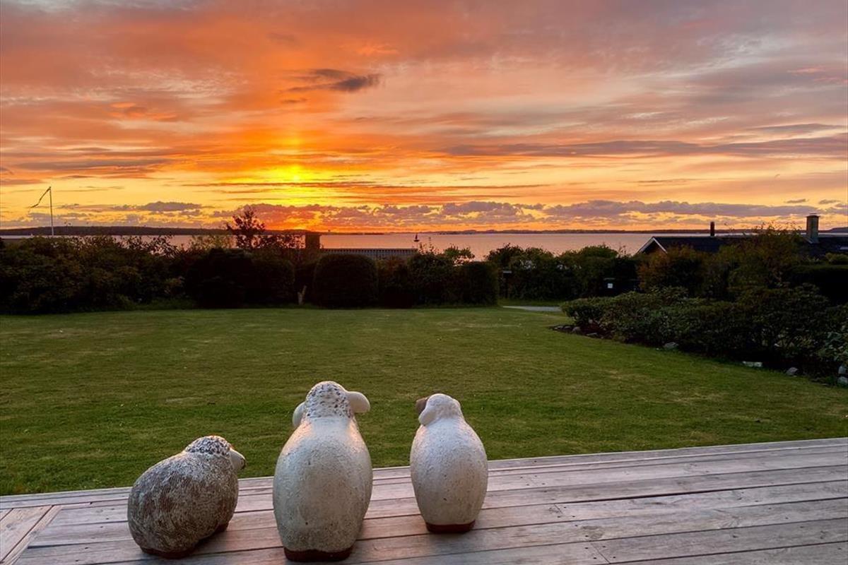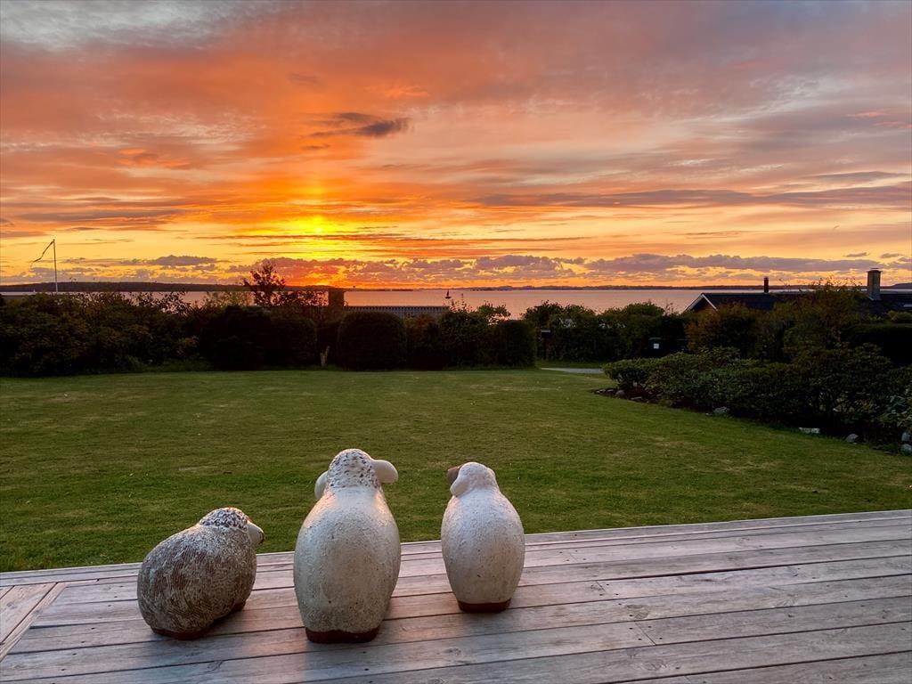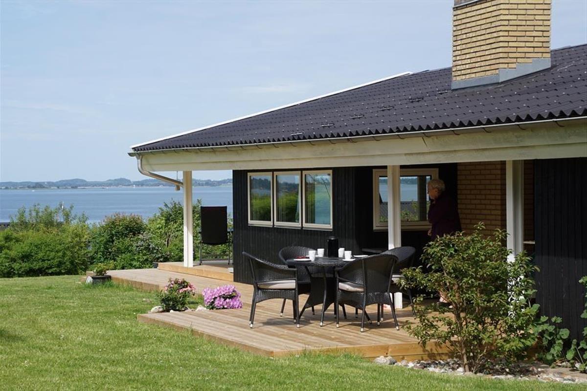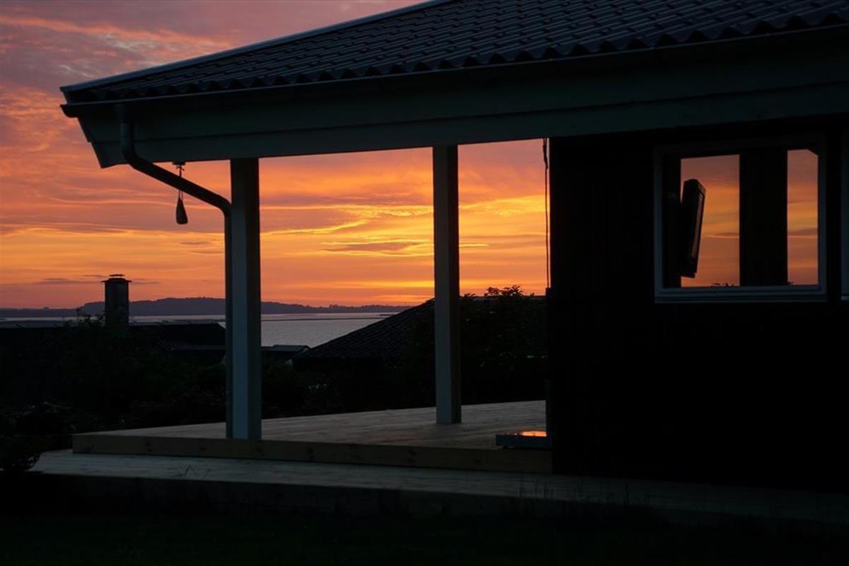 Auf der großen Terrasse direkt vor dem Wohnzimmer können Sie die Sommerabende genießen, während sich der Duft des Grills mit dem wechselnden Ausdruck des Fjords vermischt - und der Aussicht auf Holbæk, Orø und Odsherred.