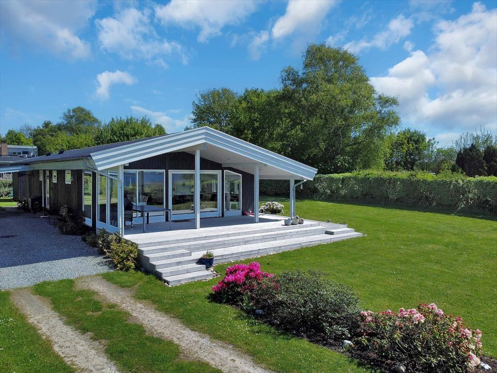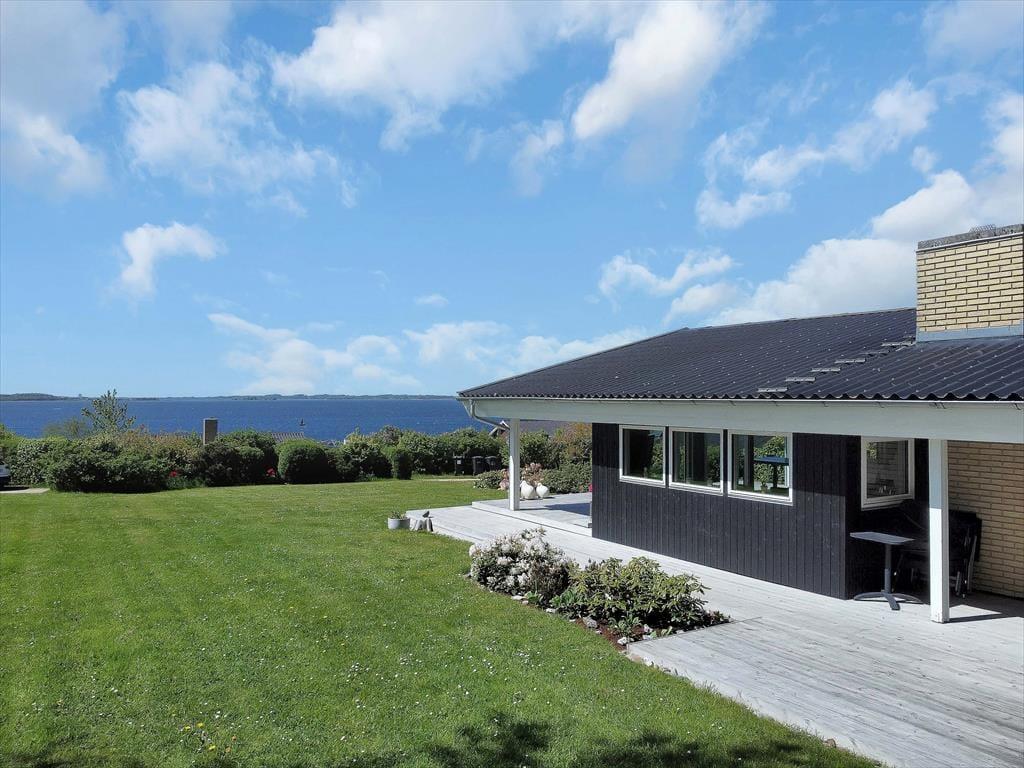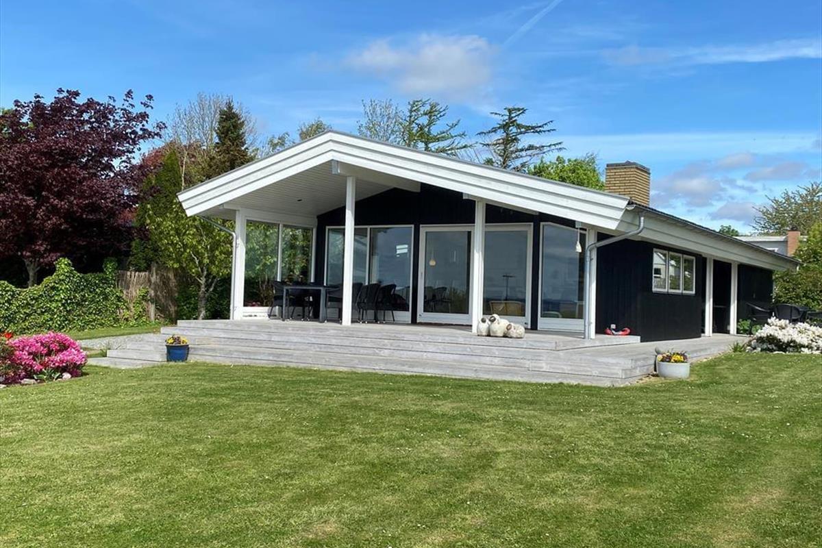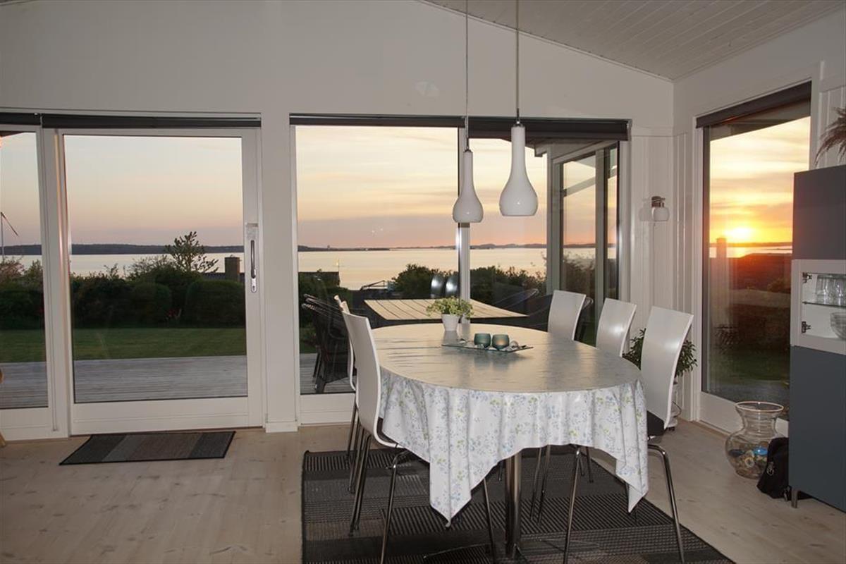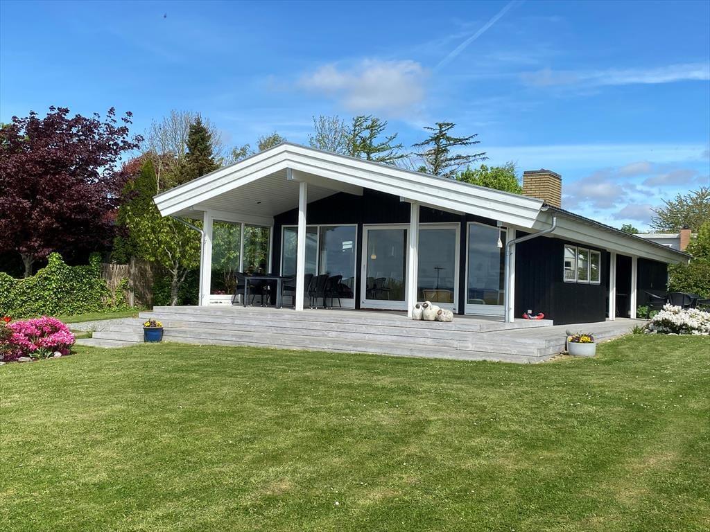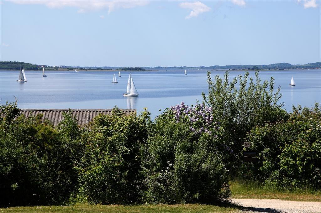 Auf der großen Terrasse direkt vor dem Wohnzimmer können Sie die Sommerabende genießen, während sich der Duft des Grills mit dem wechselnden Ausdruck des Fjords vermischt - und der Aussicht auf Holbæk, Orø und Odsherred.
