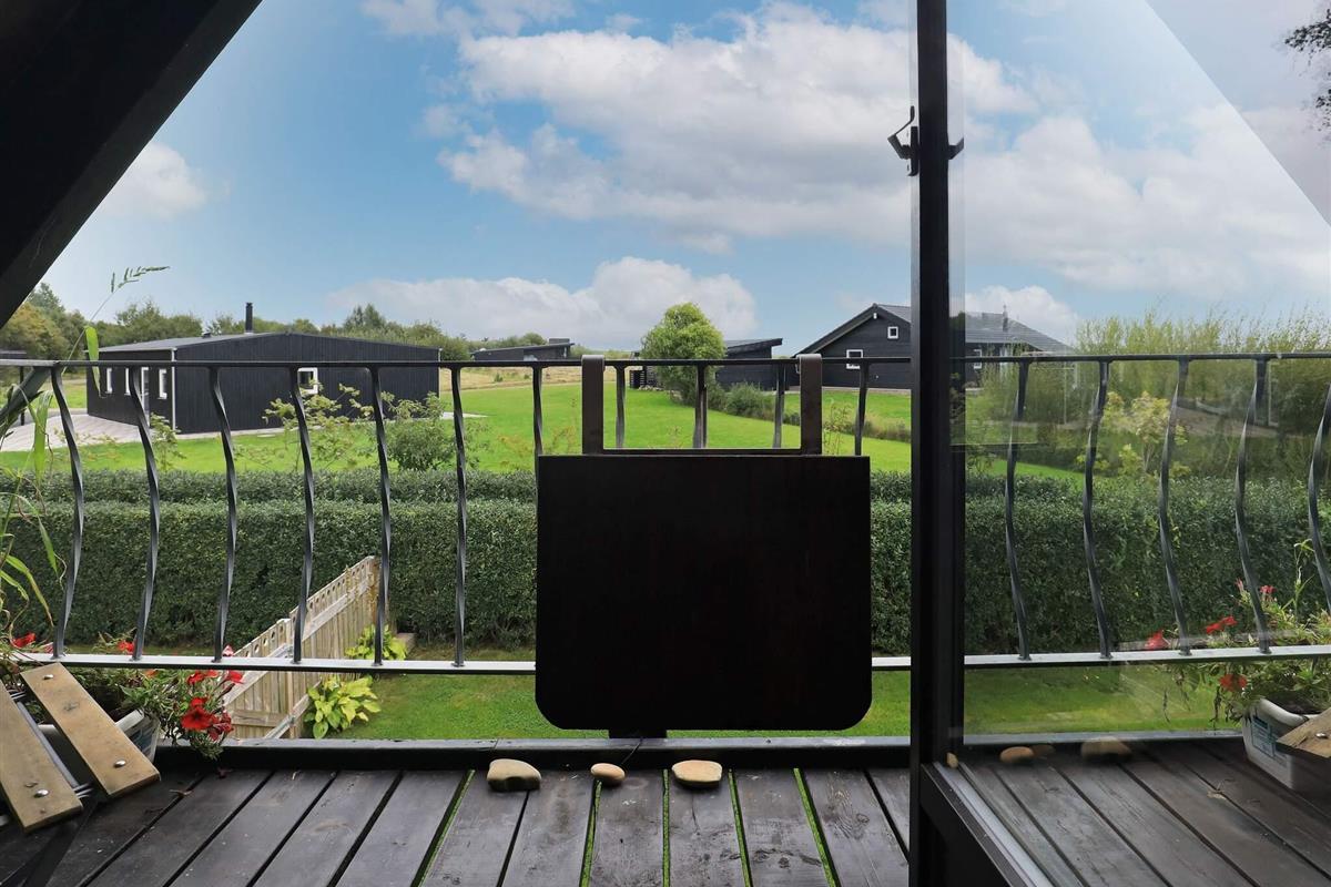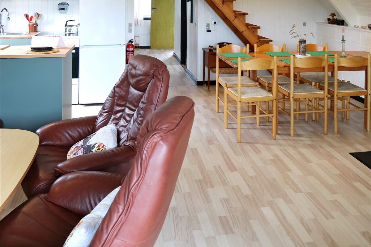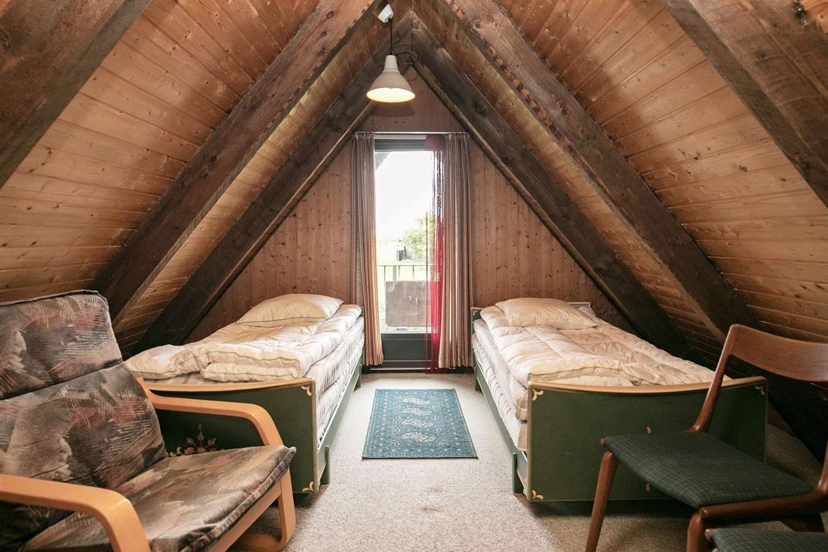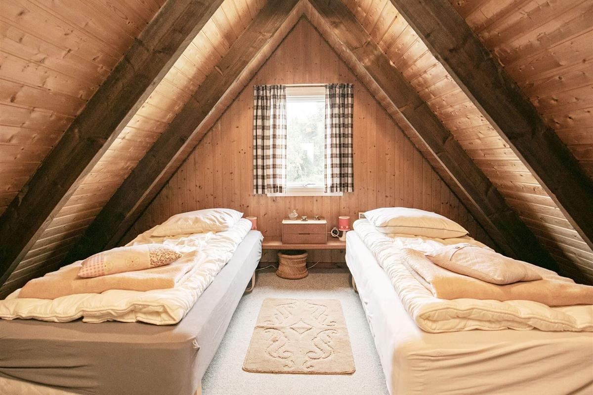 Das Ferienhaus aus dem Jahre 1978 hat zwei Ebenen und vom kleinen Balkon im ersten Stock hat man über die Dächern hinweg Fjordblick. Oben im Dachgeschoss liegen auch ein kleiner Flur und zwei Schlafzimmer, beide mit jeweils zwei Einzelbetten ausgestattet.