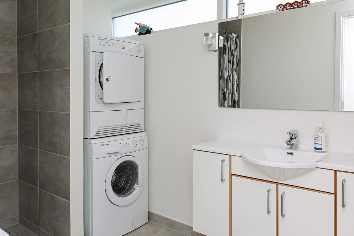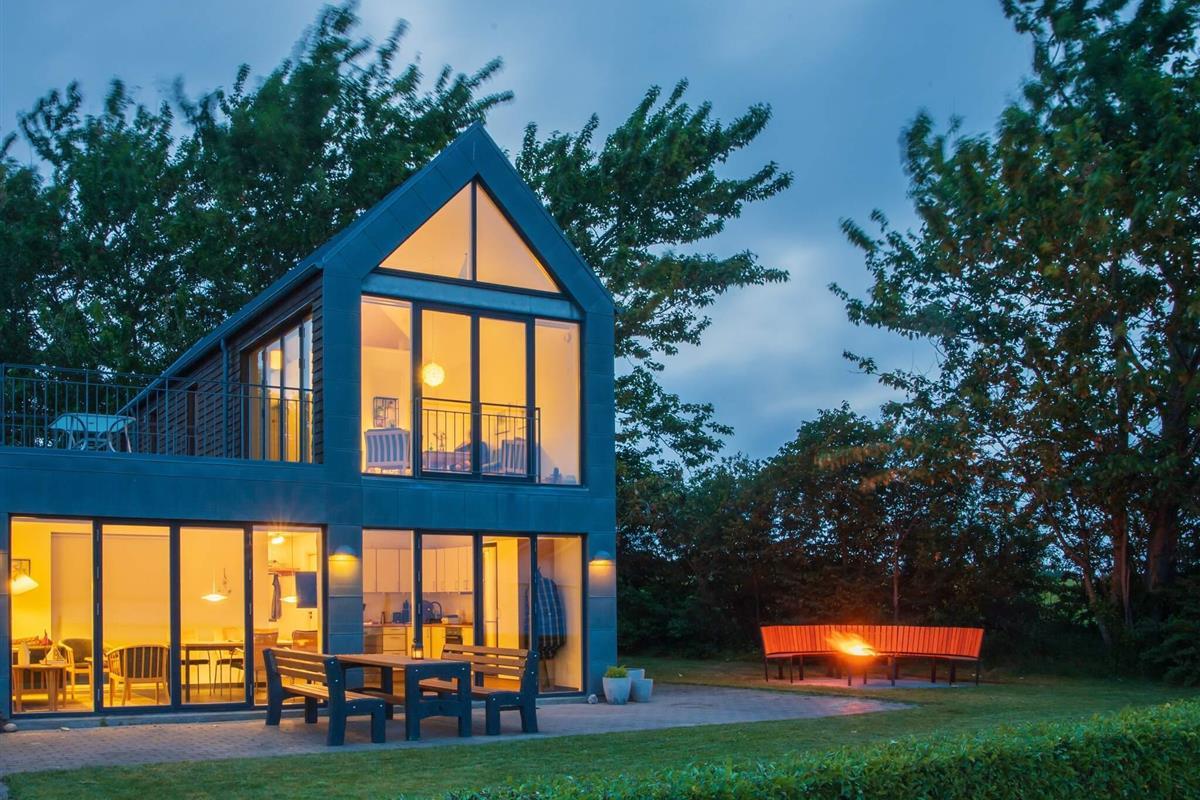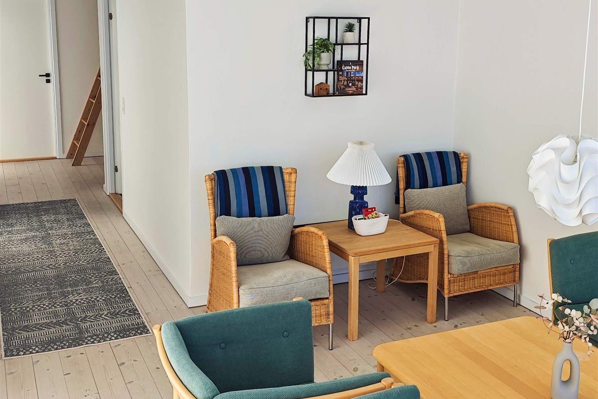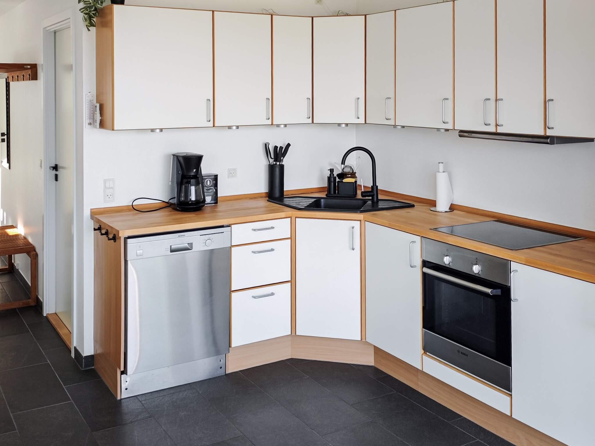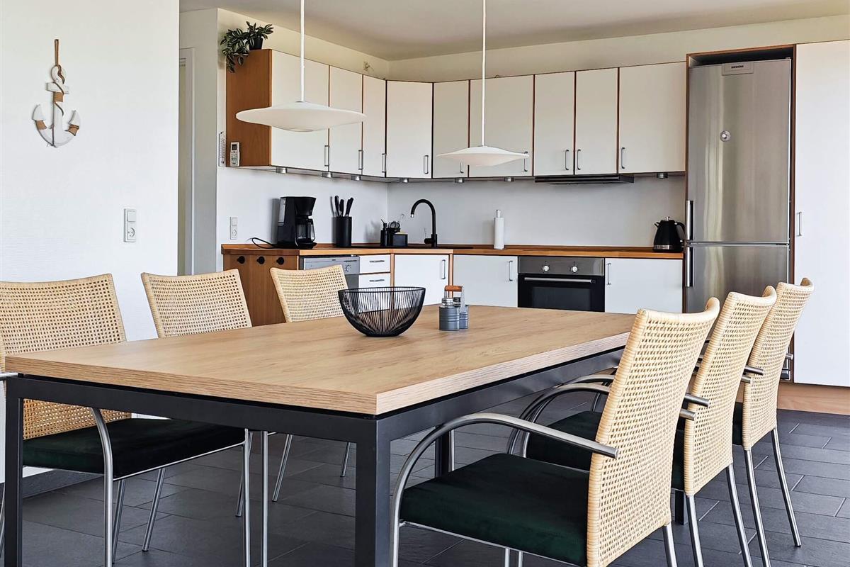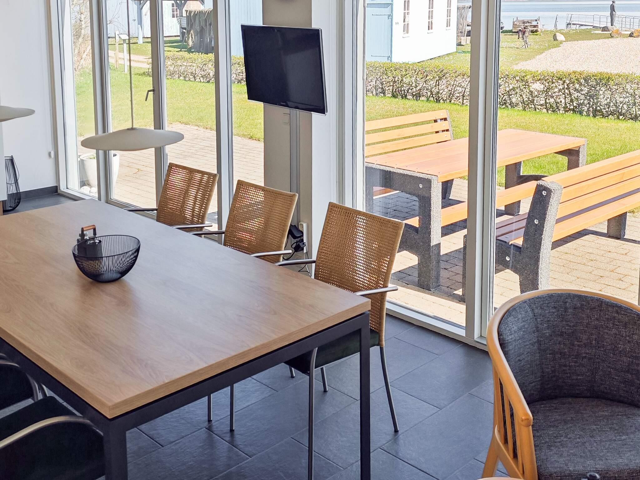 Im Erdgeschoss befinden sich Eingangsbereich und Flur in offener Verbindung mit Küche und Esszimmer. Von Küche und Essbereich aus hat man einen herrlichen Blick aufs Wasser und direkten Zugang zur Südostterrasse. Zur Ausstattung gehören ein Sofa und ein Fernseher mit dänischen und deutschen Sendern.