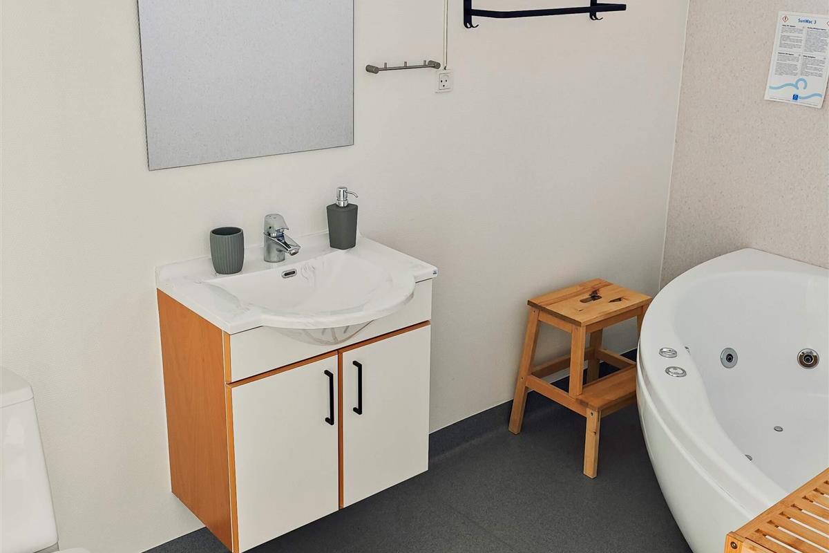 Im Erdgeschoss befinden sich außerdem ein Badezimmer mit Whirlpool und eines der großen Schlafzimmer mit einem Doppelausziehbett. Die großen Fenster sorgen für viel Licht.