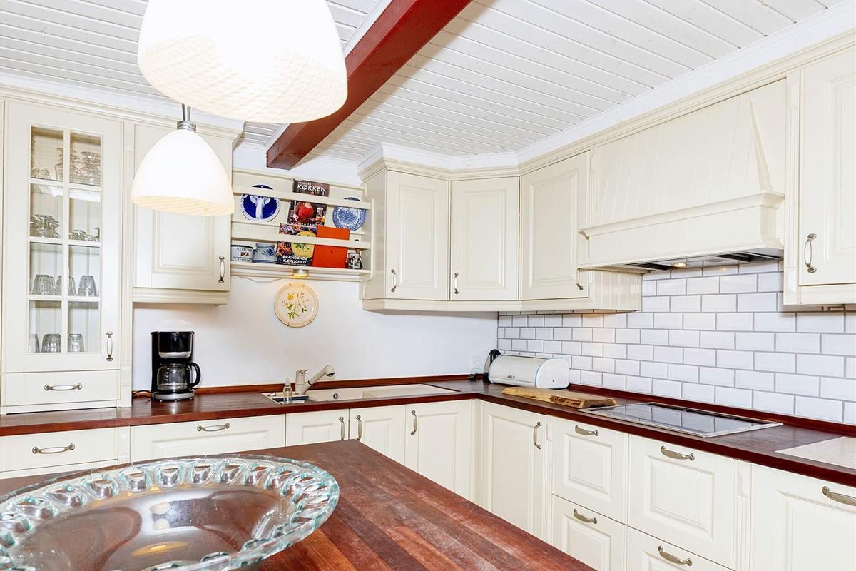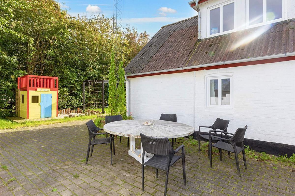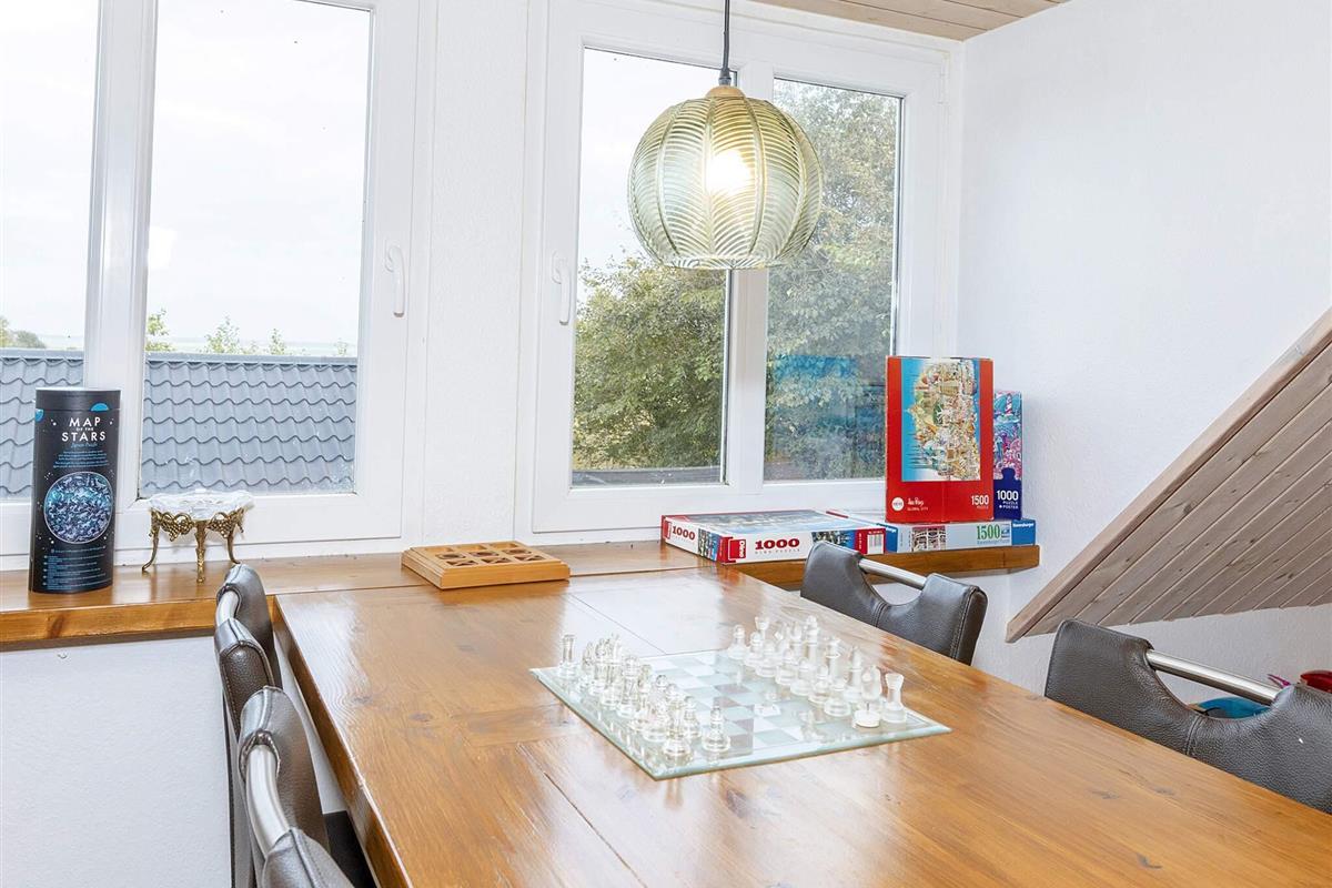 Zwischen den beiden Teilen befindet sich eine schöne, sonnige Terrasse mit viel Schatten. Hier können Sie Ihr Abendessen vom Grill genießen. Für die jüngsten Gäste gibt es ein Trampolin, ein Spielhaus, ein Klettergerüst, Schaukeln, einen Sandkasten, ein Fußballtor, Hängematten und eine große Auswahl an Spielzeug und Spielen für drinnen und draußen. Hinter dem Anbau befindet sich eine gemütliche Feuerstelle mit Aussicht. Das Haus wirkt hell und einladend und ist komfortabel möbliert