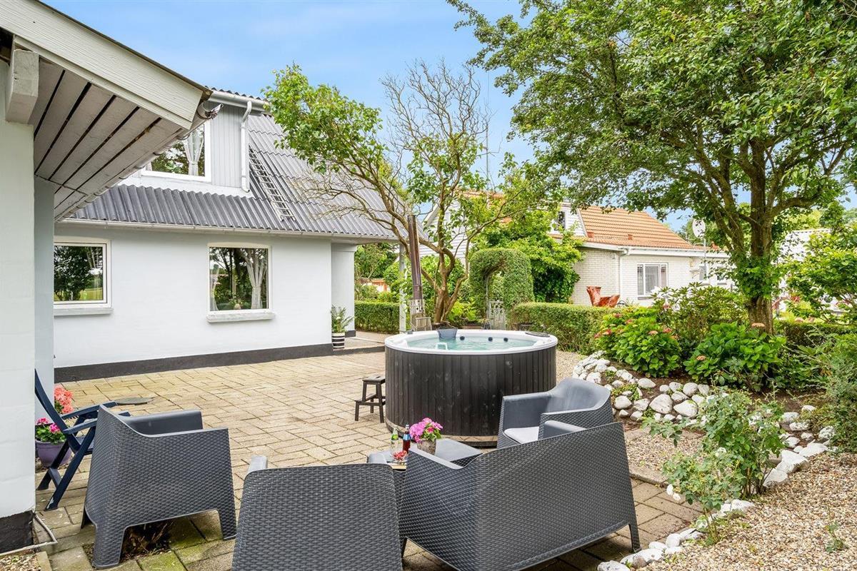 Ruim, gerenoveerd vakantiehuis op Jegindø met sauna, hot tub en speelvoorzieningen dicht bij zee.