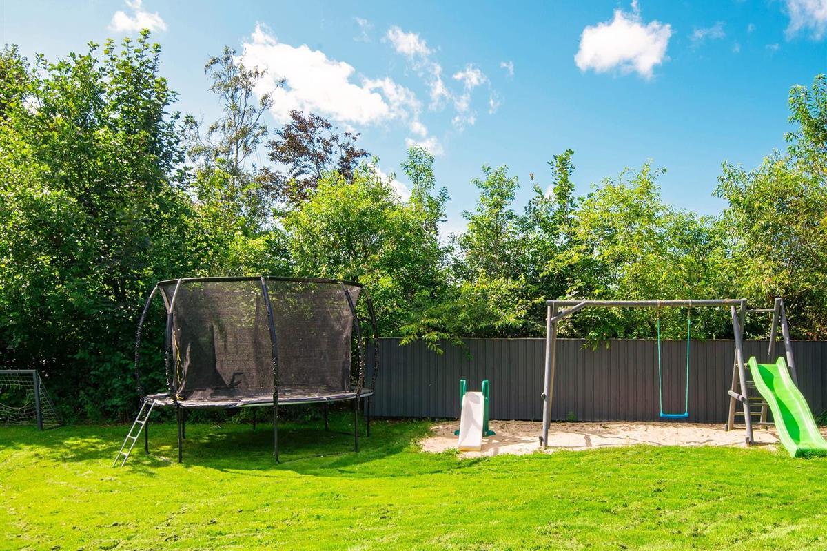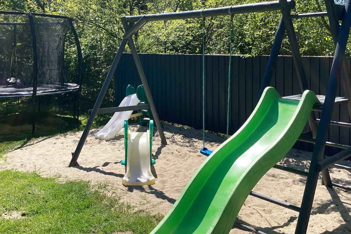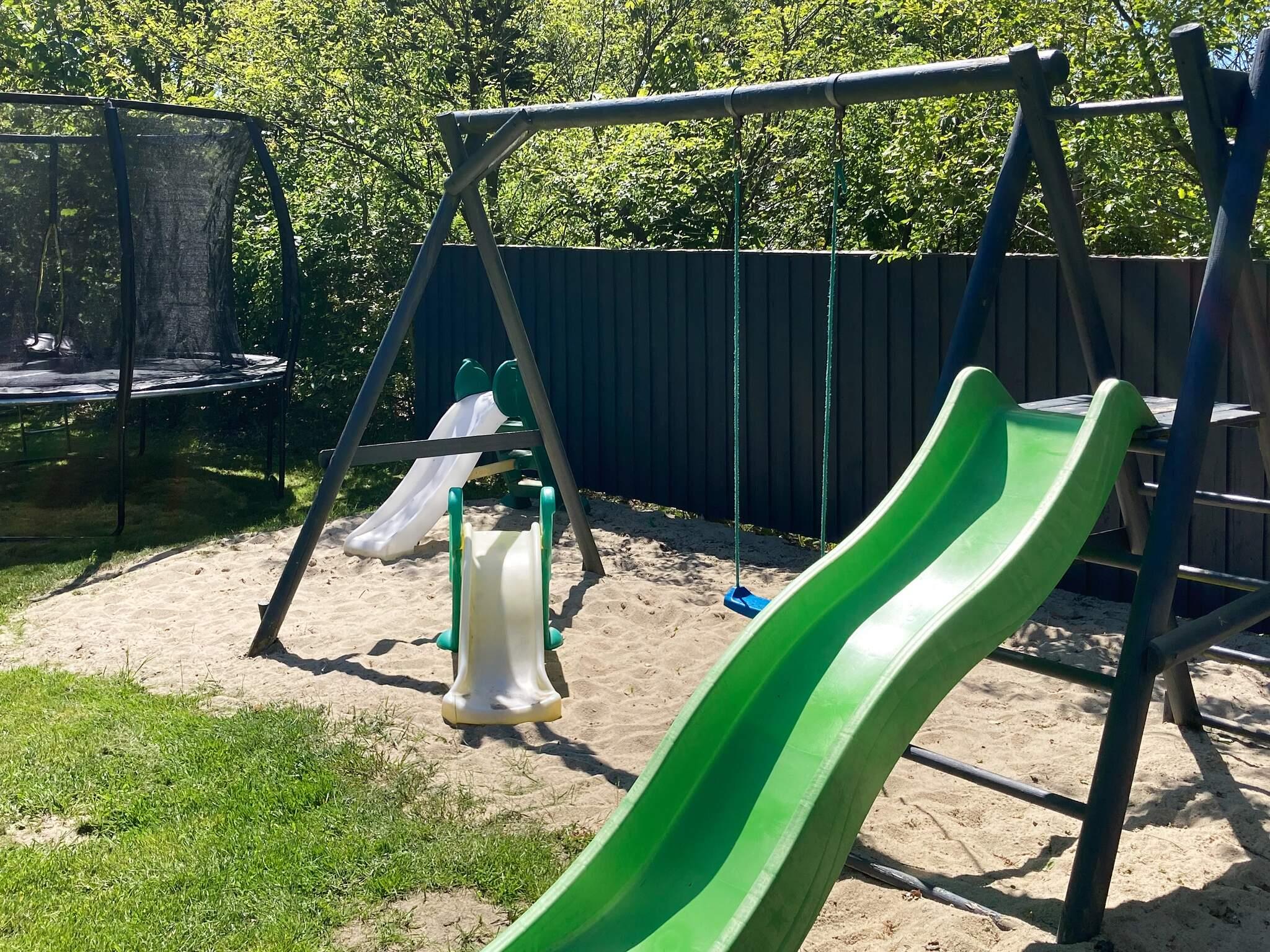 Draußen freuen sich Kinder über Schaukeln und einen Sandkasten und können Fußball spielen, während die Eltern sich auf der geschützten und nach Süden ausgerichteten Terrasse entspannen können.
