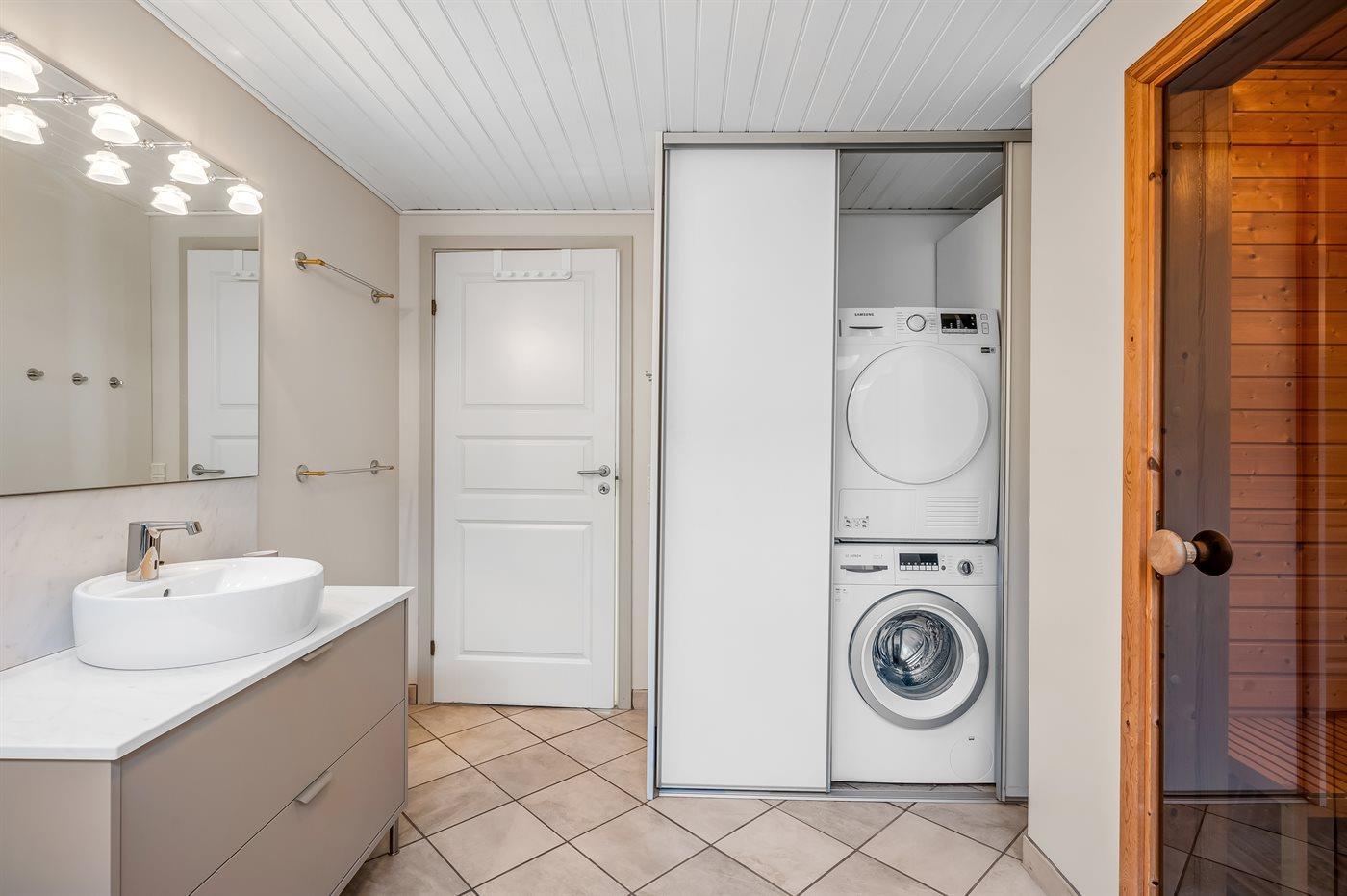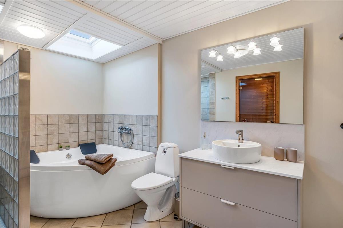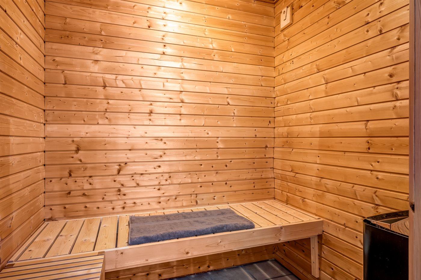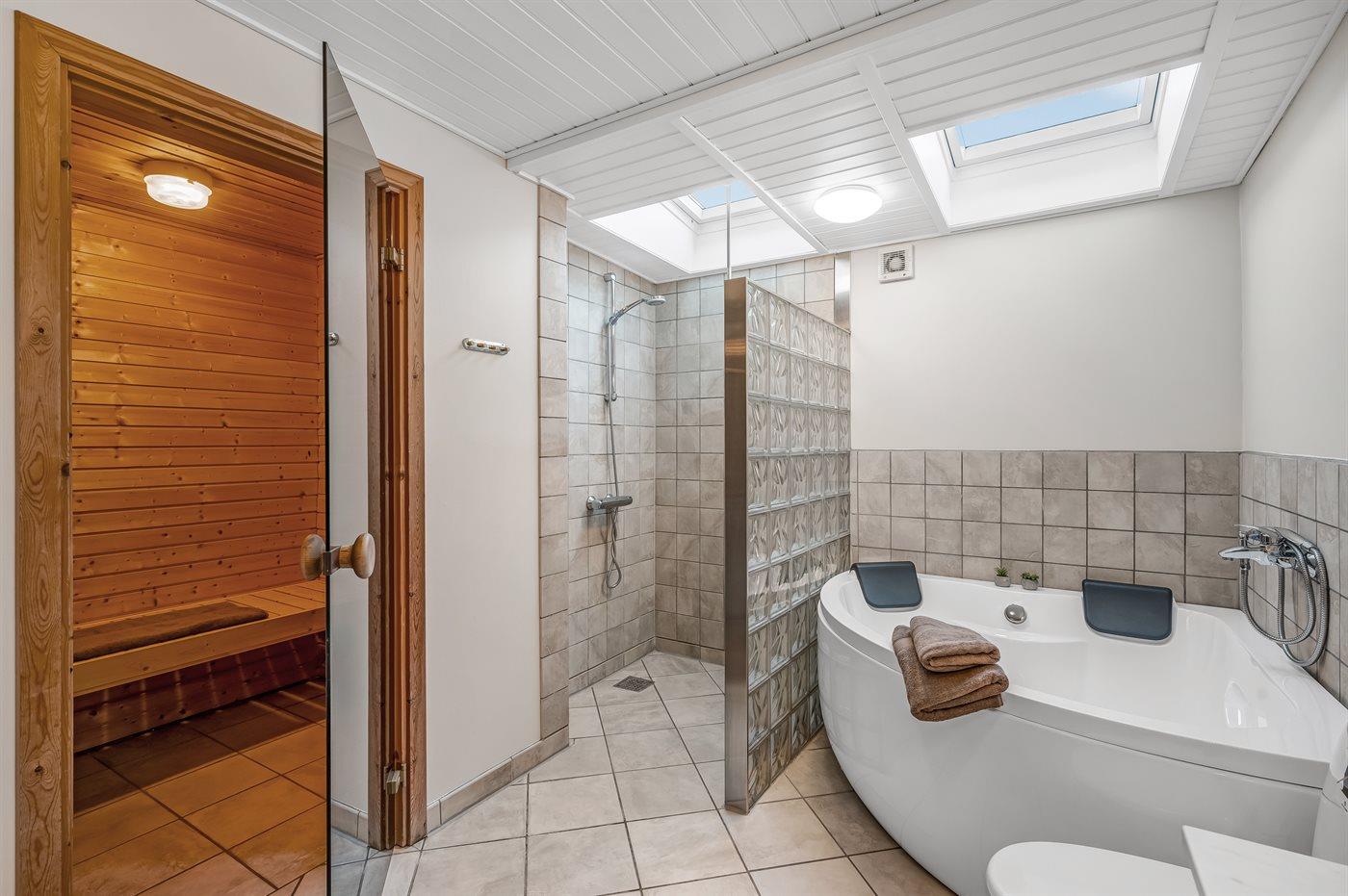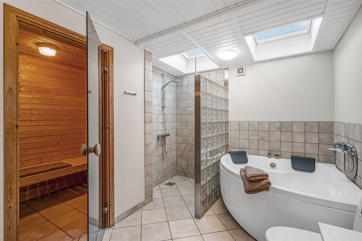 Er is 2 badkamers met douchehok en 2 toiletten. Er is vloerverwarming in 2 van de badkamers.. Badkuip. De sauna biedt de gelegenheid tot ontspanning.