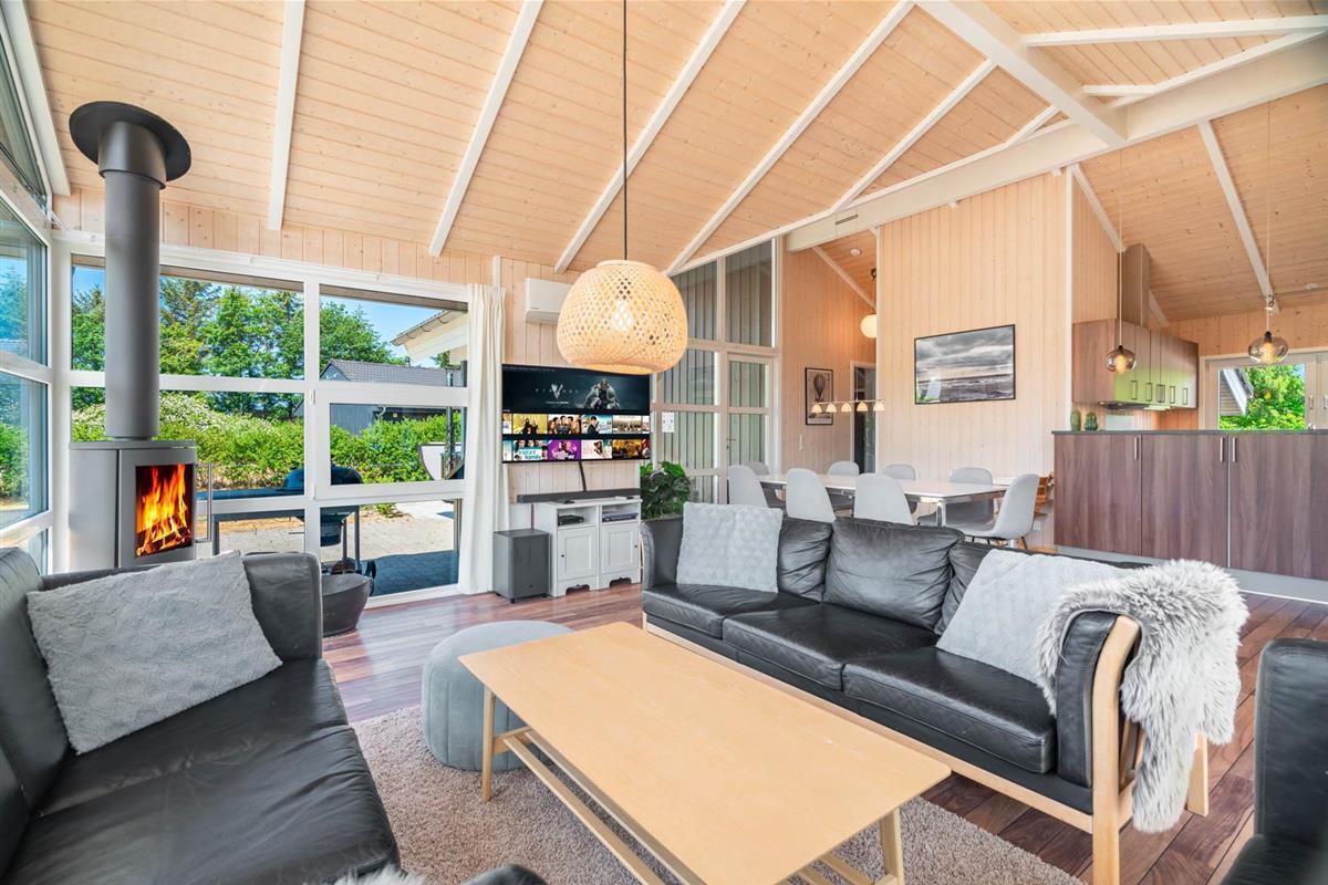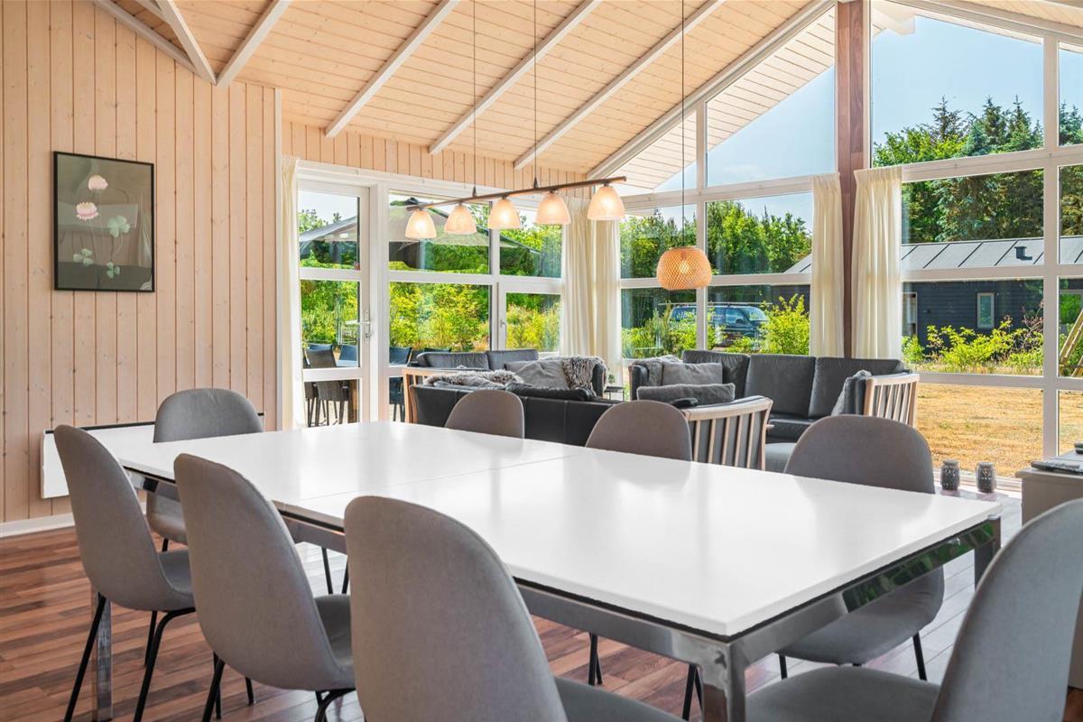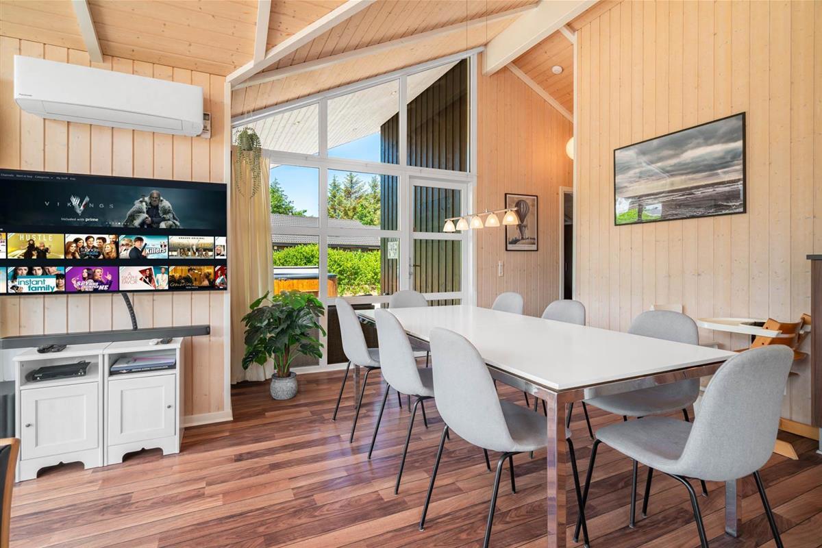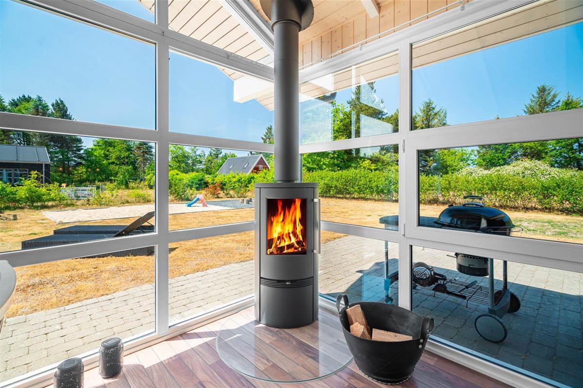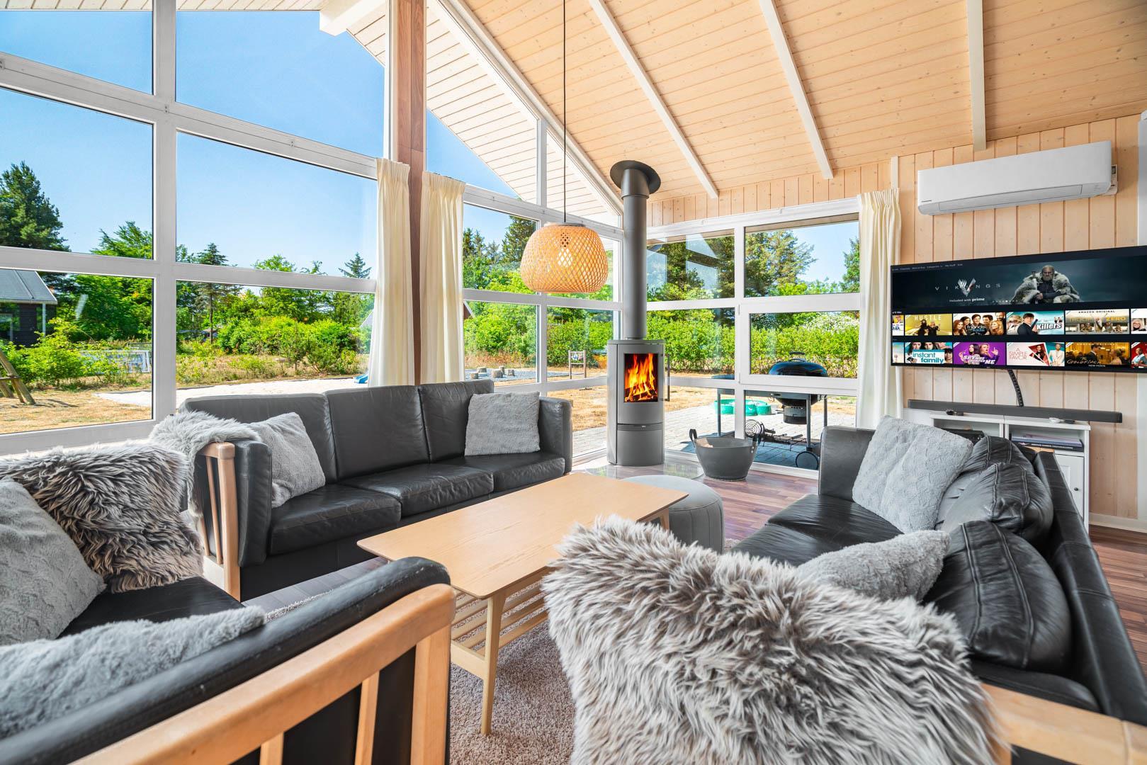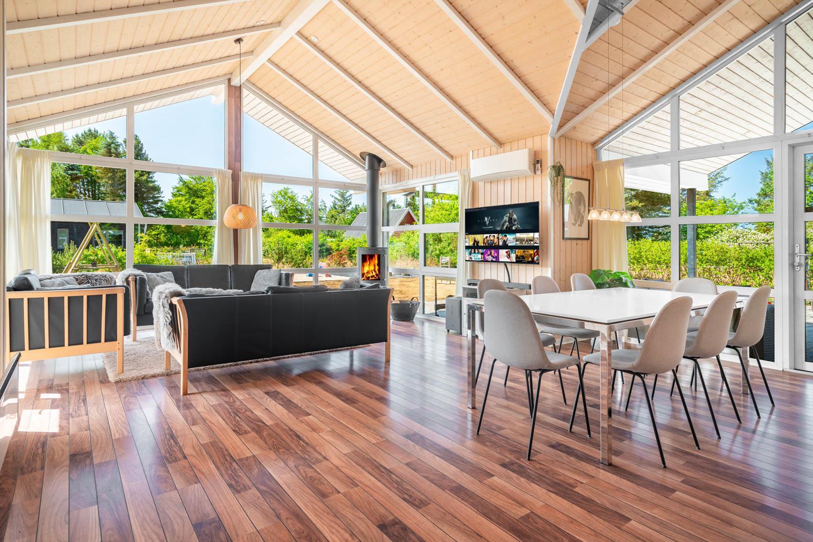 Der offene Wohn- und Essbereich ist das Herzstück des Ferienhauses. Hier kannst du gemeinsam mit der Familie essen, spielen oder entspannte Abende vor dem Kamin verbringen. Große Fenster sorgen für viel Tageslicht und schaffen eine angenehme Verbindung zwischen Innen- und Außenbereich.