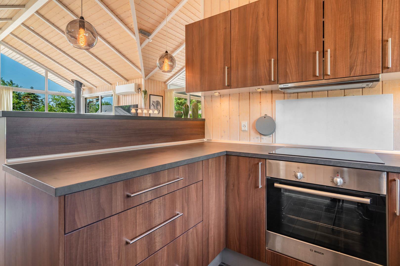 Die offene Küche ist modern ausgestattet und bietet alles, was du im Urlaub benötigst. Spülmaschine, ausreichend Arbeitsfläche und Fußbodenheizung machen das Kochen besonders angenehm.