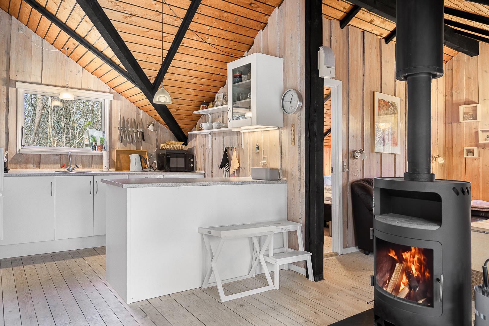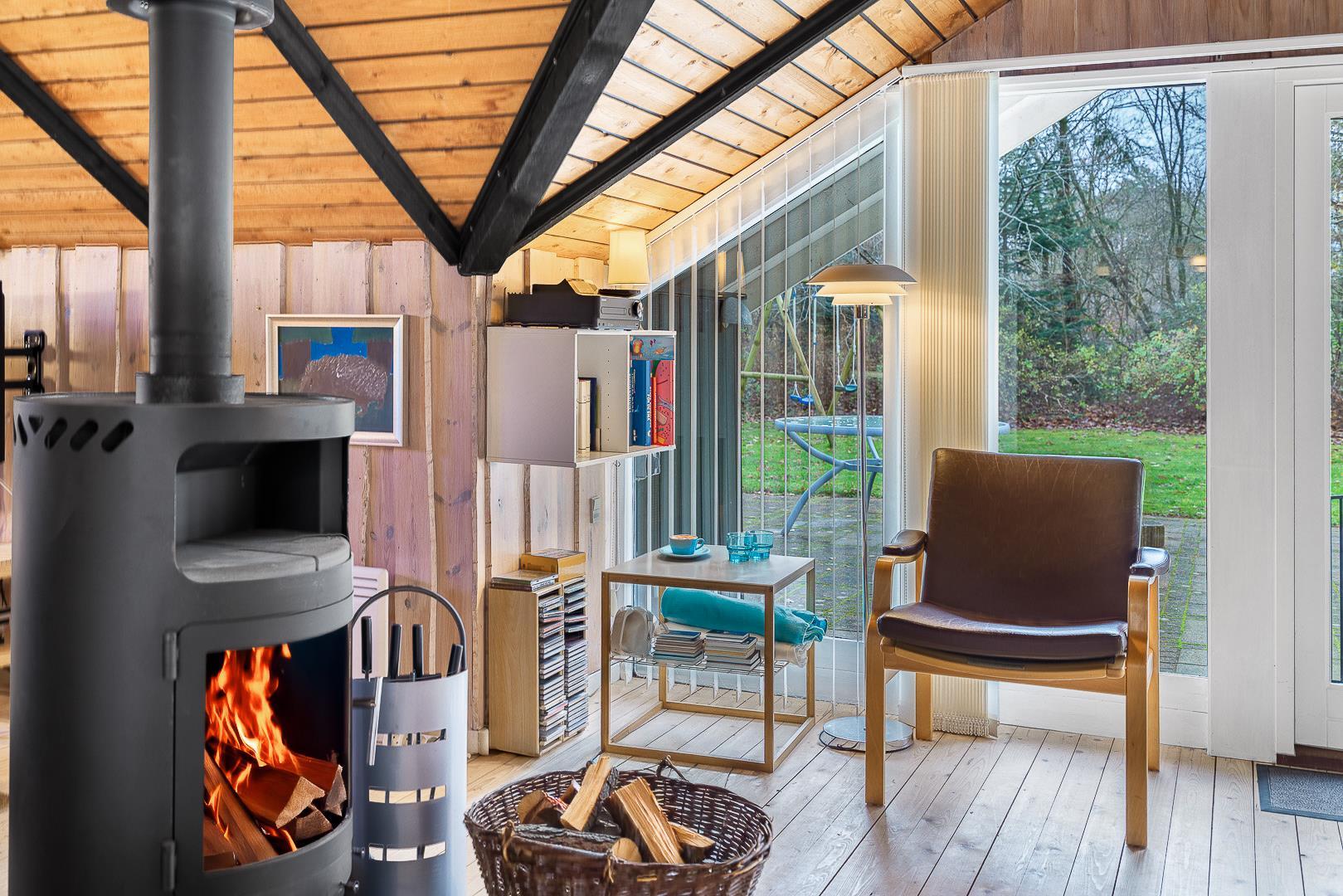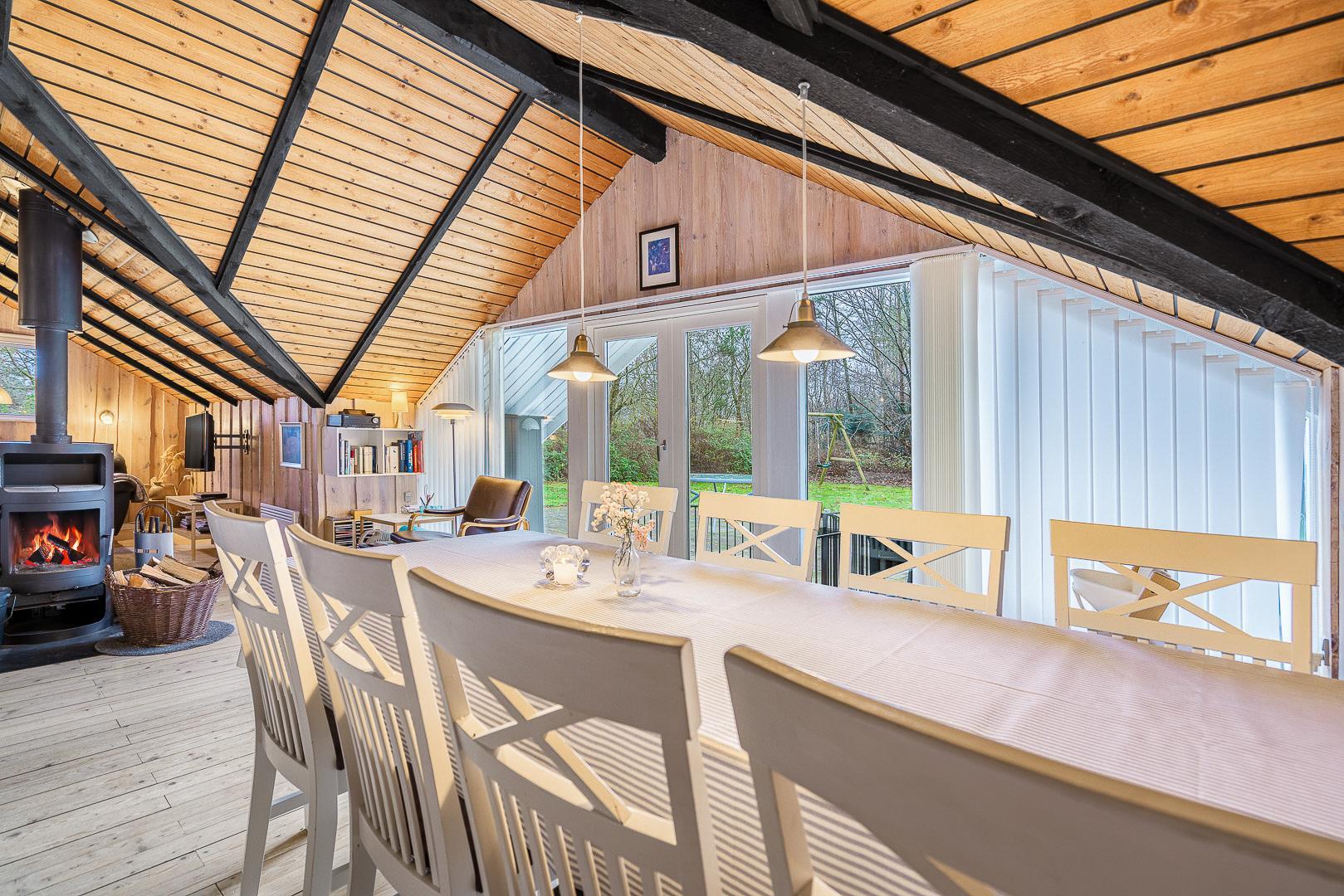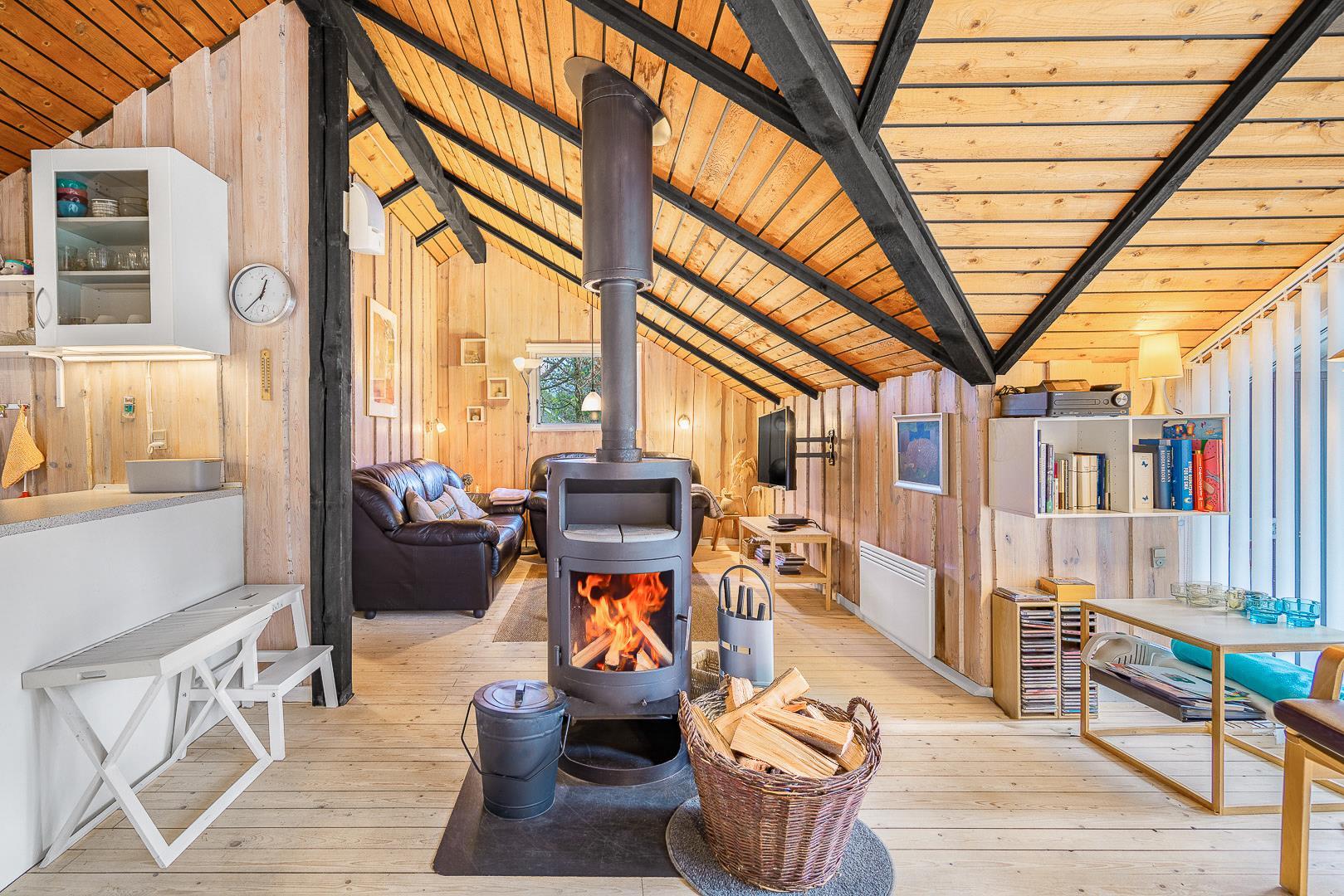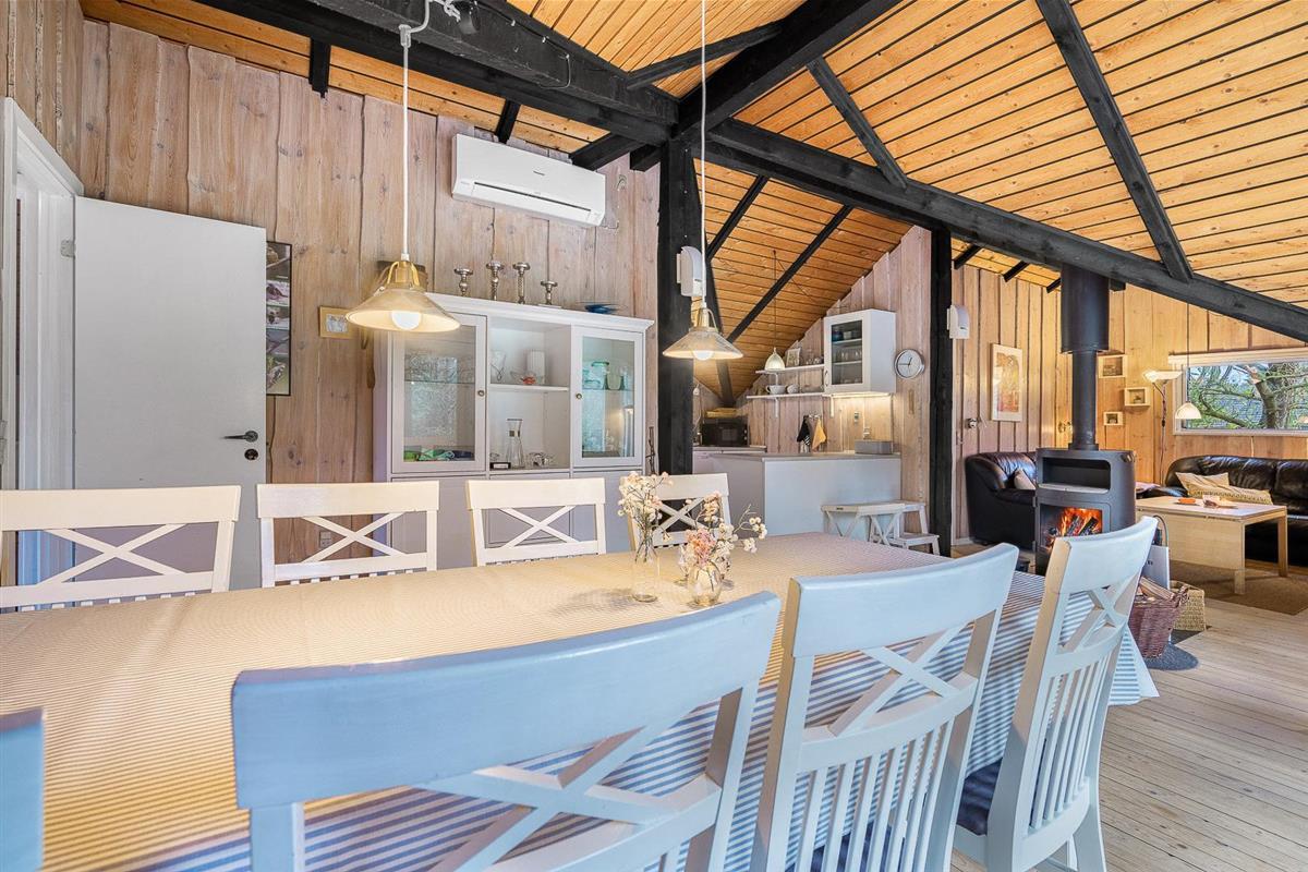 Der helle Wohnbereich mit Kamin ist der gemütliche Mittelpunkt des Ferienhauses. Durch die offene Raumgestaltung wirkt alles freundlich, verbunden und ideal für gemeinsame Stunden. Die moderne Wärmepumpe sorgt dafür, dass es im Sommer angenehm kühl und im Winter wohlig warm bleibt – perfekte Bedingungen für euren Urlaub in Dänemark zu jeder Jahreszeit.