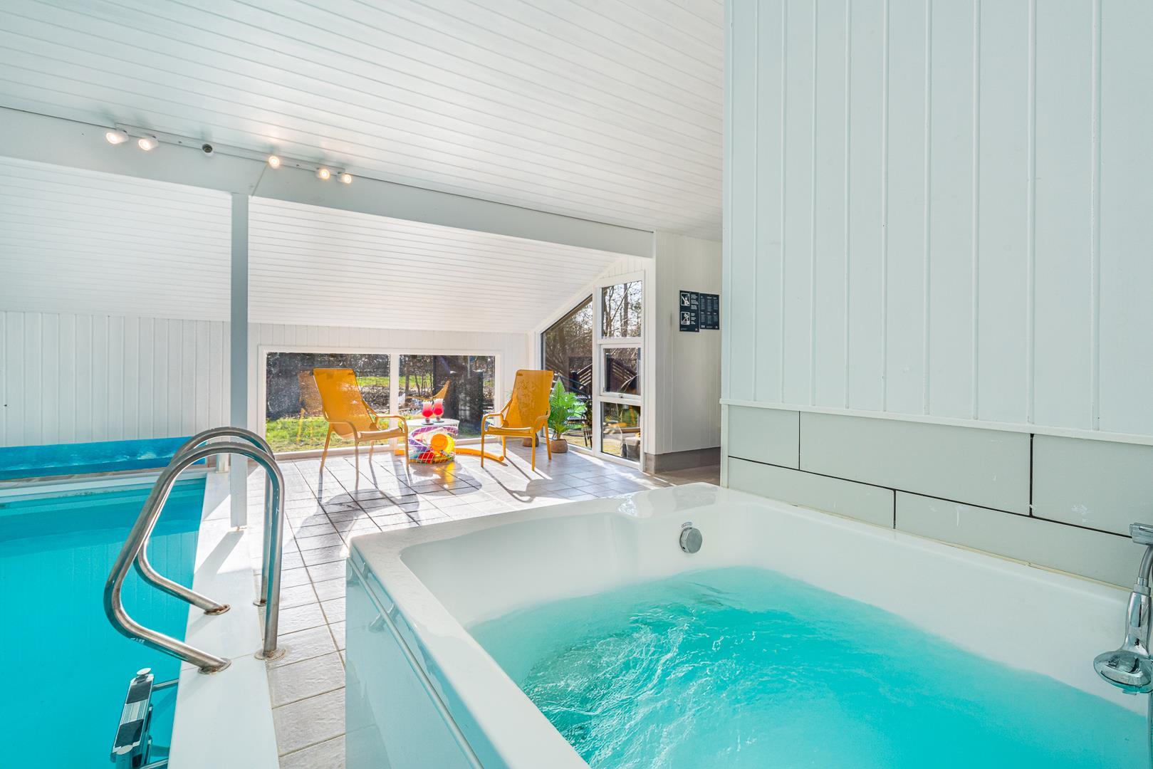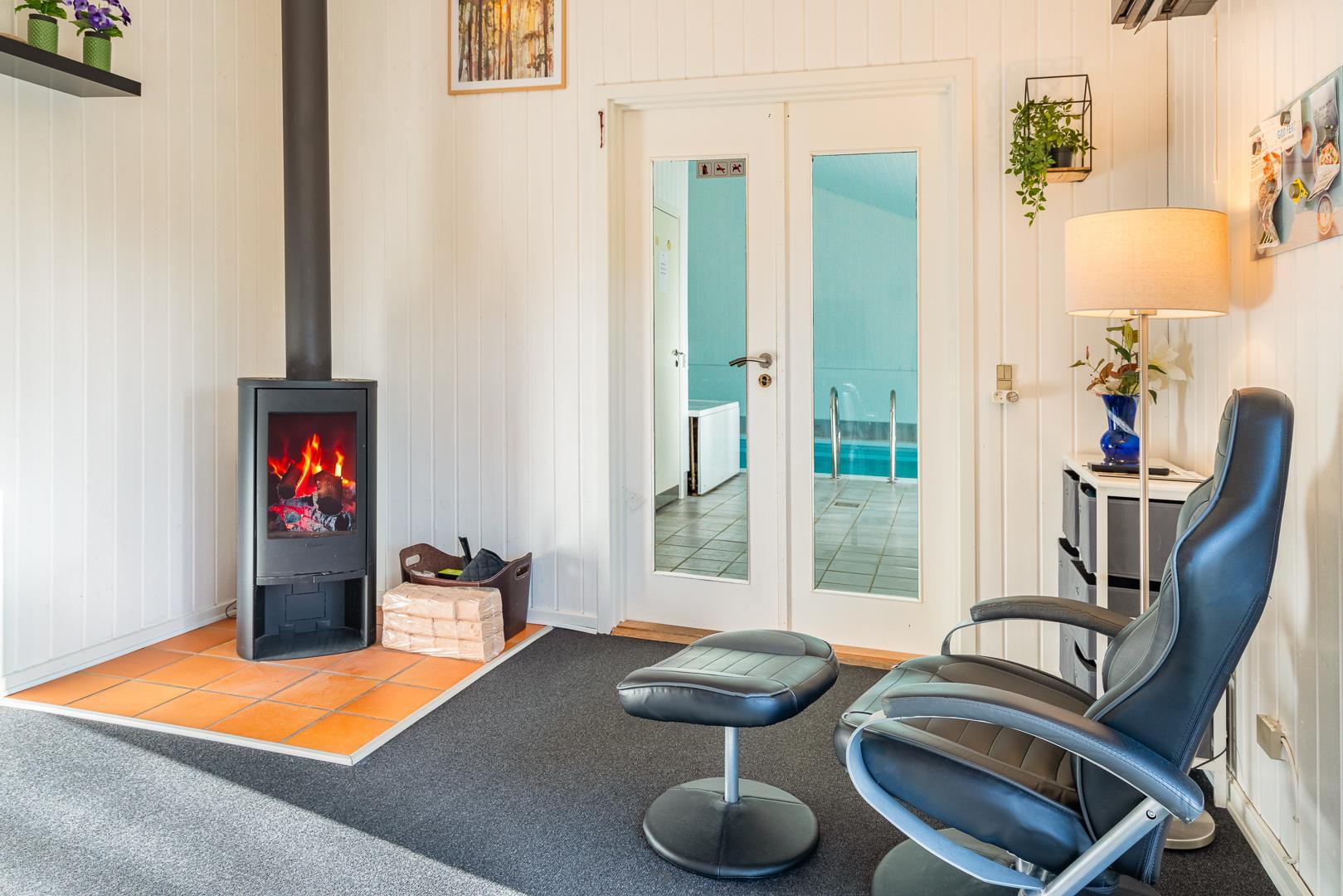 Moderner Innenbereich mit Pool, Sauna, Kamin und Chromecast