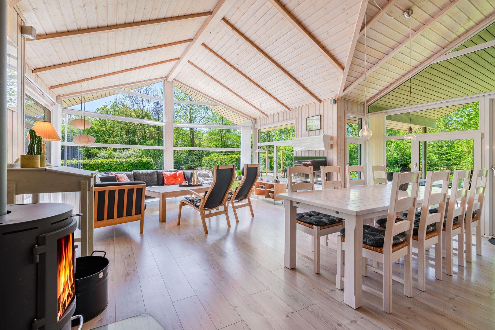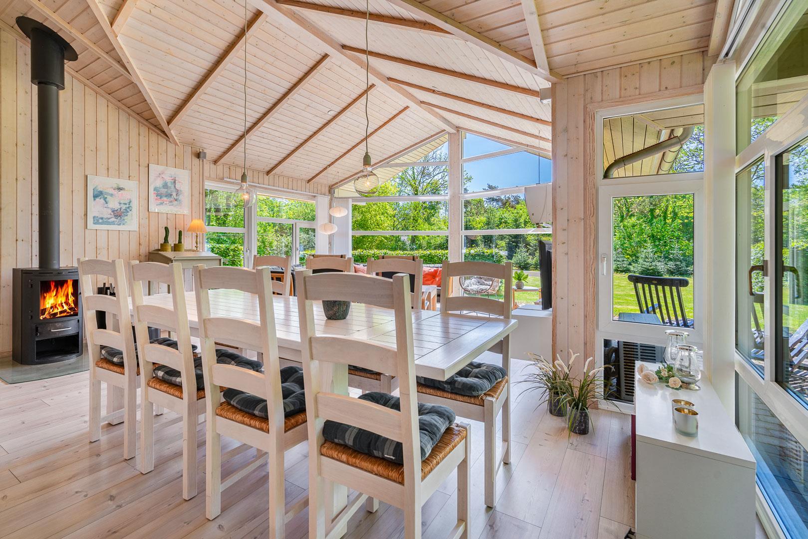 Im hellen Wohnzimmer sorgt ein Kamin für wohlige Wärme und eine entspannte Atmosphäre nach einem Tag an der frischen Nordseeluft. Dank Fußbodenheizung und Wärmepumpe genießt du auch in der kühleren Jahreszeit angenehme Temperaturen. Große Fenster lassen viel Licht herein und bieten dir einen schönen Blick ins Grüne – perfekt für ruhige Abende mit einem guten Buch oder einem Glas Wein.