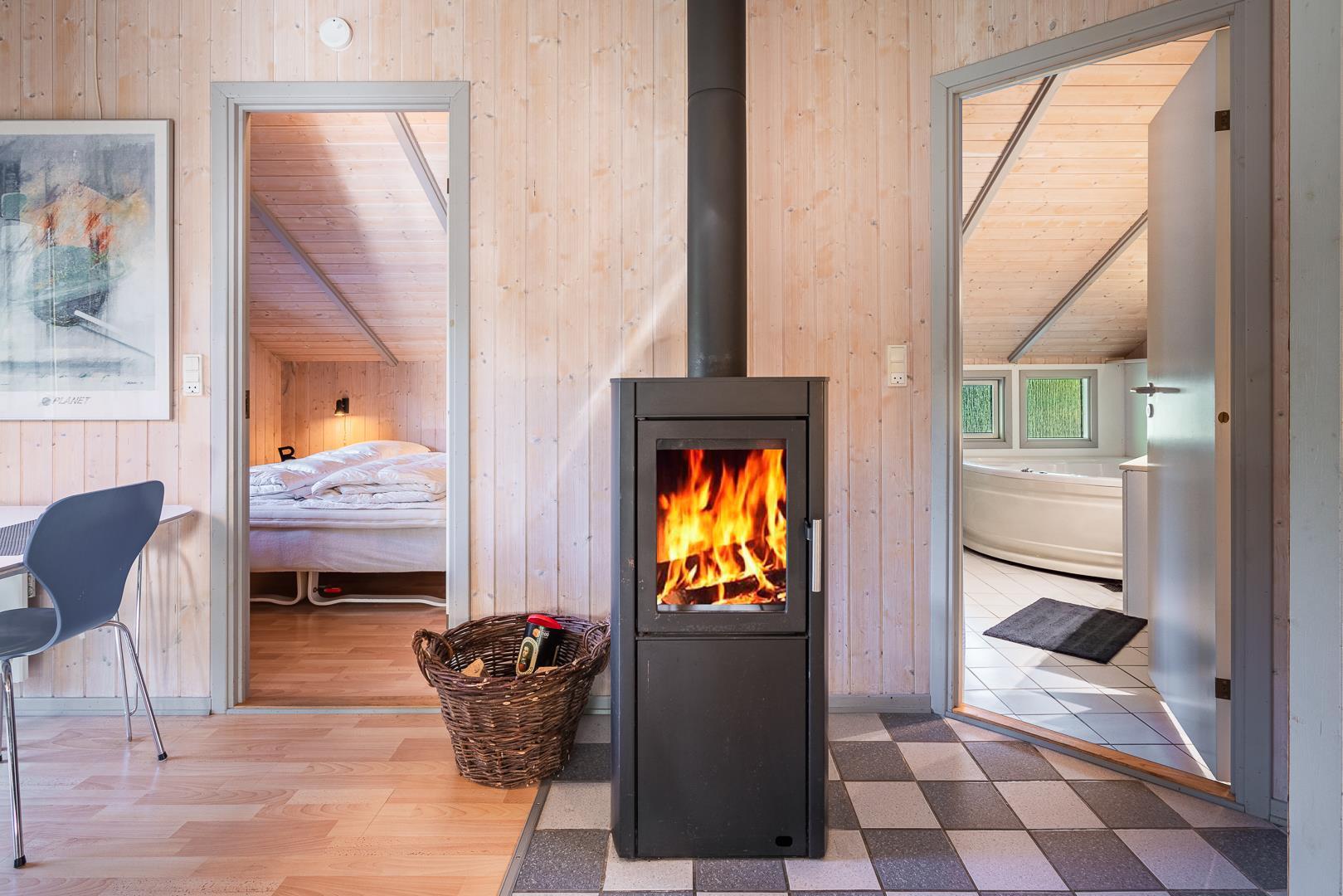 Im Mittelpunkt des Ferienhauses steht der lichtdurchflutete Wohnraum mit gemütlicher Sitzecke und Kamin. Hier könnt ihr nach einem erlebnisreichen Tag am Meer die Wärme genießen und zur Ruhe kommen. Dank Wärmepumpe bleibt das Klima im Ferienhaus angenehm – energieeffizient und komfortabel.
