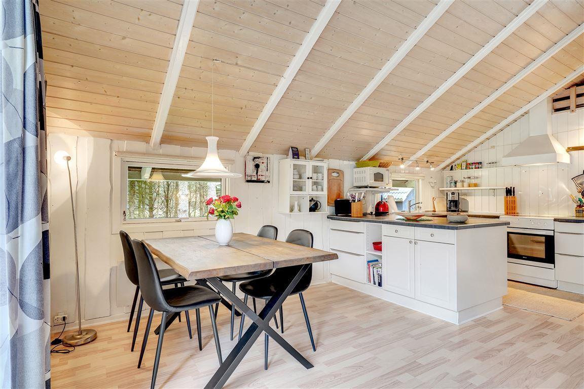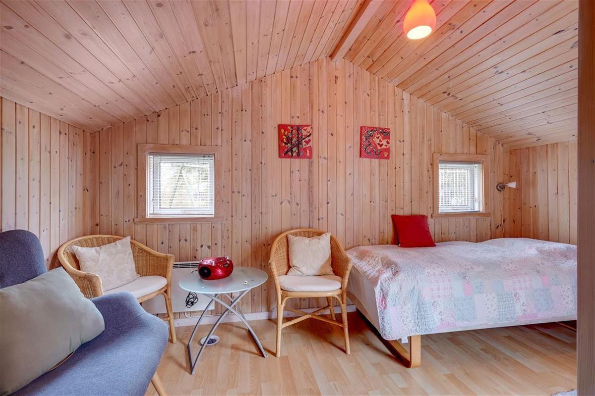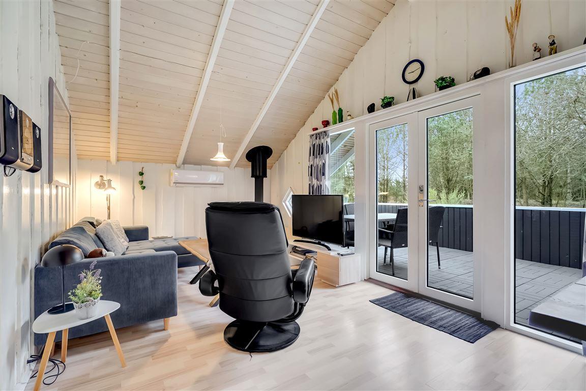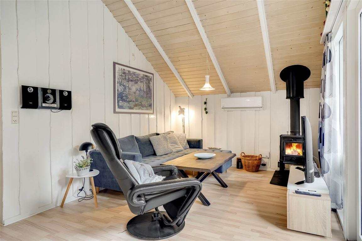 Hier auf Blomstervangen 93 erwartet Dich ein gemütliches, helles Ferienhaus mit 62m², das Platz für die ganze Familie und bis zu 3 Hunde bietet. Das Wohnzimmer ist das Herzstück des Ferienhauses – mit einer bequemen Sofaecke, Kamin und direktem Zugang zur Terrasse. Die großen Fenster lassen viel Licht herein und schaffen eine warme, einladende Atmosphäre, in der man sich sofort wohlfühlt.