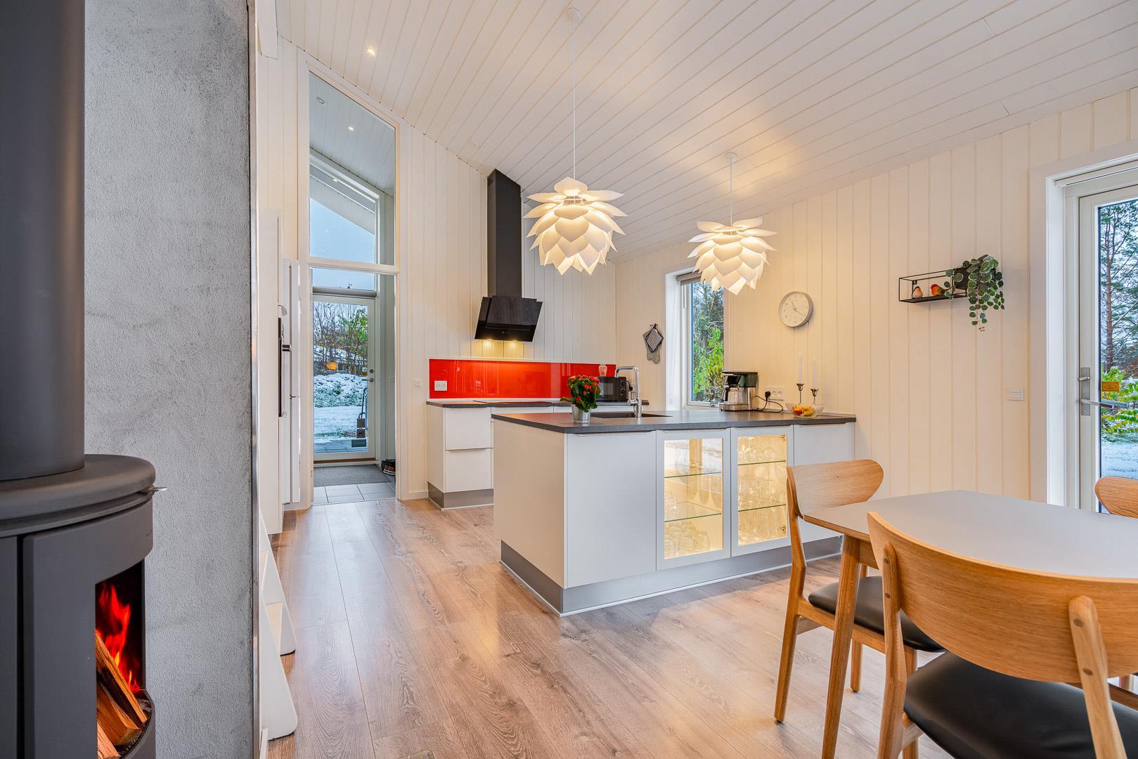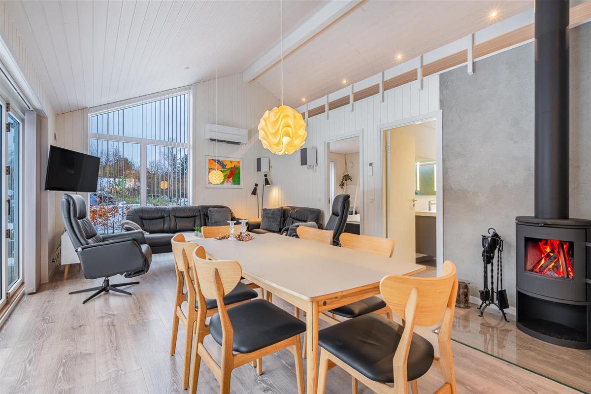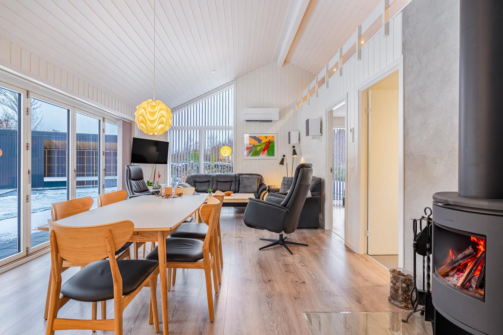 Im offenen Wohnbereich sorgt ein Kamin für behagliche Stunden, besonders an kühlen Tagen oder abends nach einem langen Spaziergang am Meer. Eine moderne Wärmepumpe hält das Raumklima angenehm – energiesparend und komfortabel. Große Fenster erschaffen hier eine helle, freundliche Atmosphäre und verbinden Wohnraum und Natur auf harmonische Weise.