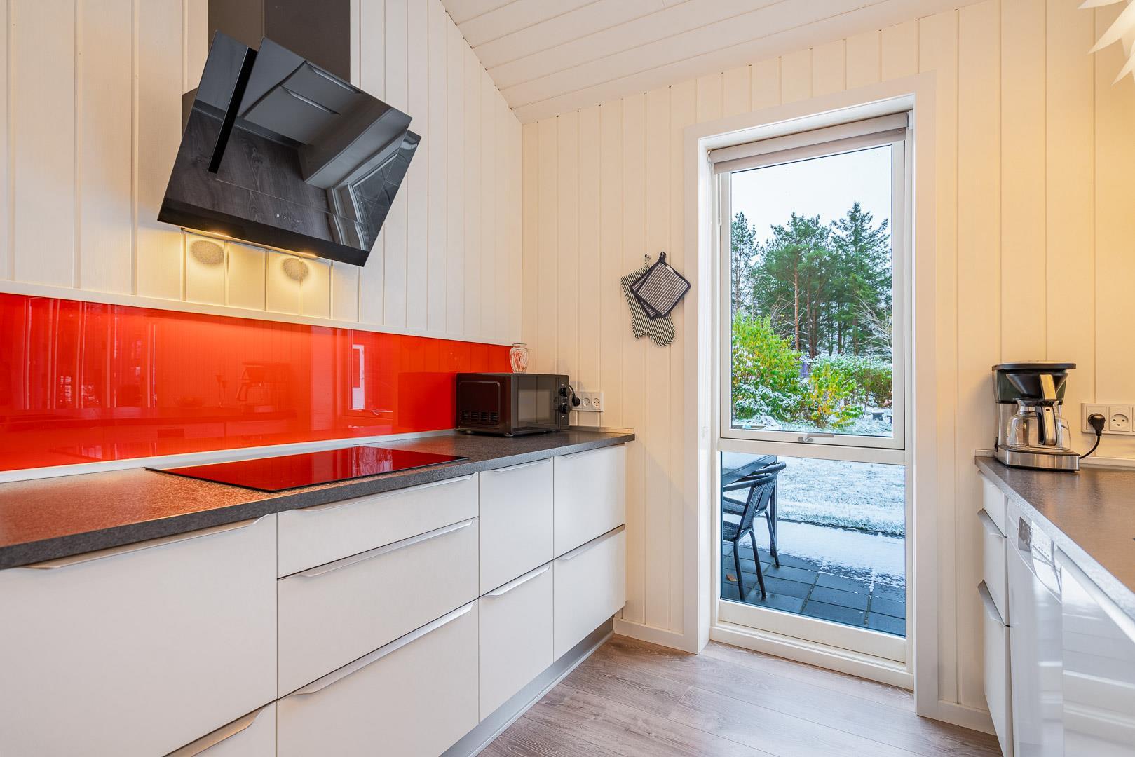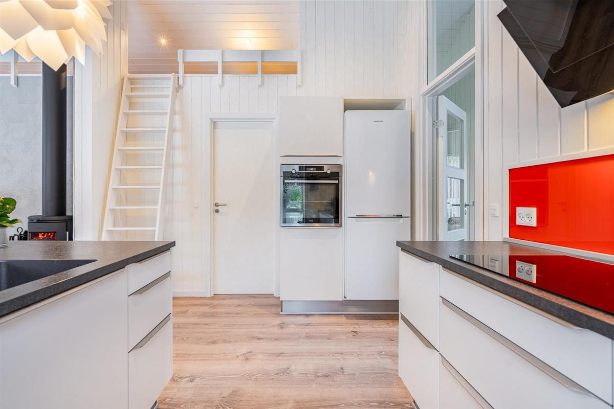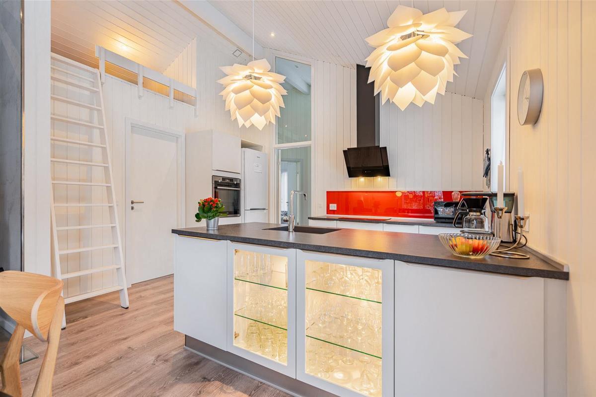 Die offene Küche ist modern ausgestattet – unter anderem auch mit einer Spülmaschine. Hier kocht ihr entspannt, während im Hintergrund das Feuer knistert oder die Kinder sich auf dem Hems eine kleine Auszeit gönnen.