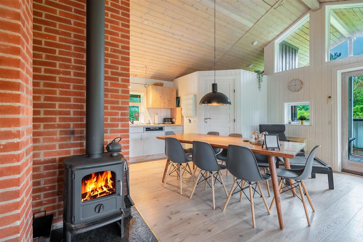 Der offene Wohnbereich im Blomstervangen 158 ist hell und einladend – mit Kamin für gemütliche Abende und einer Wärmepumpe, die zu jeder Jahreszeit ein angenehmes Raumklima schafft.