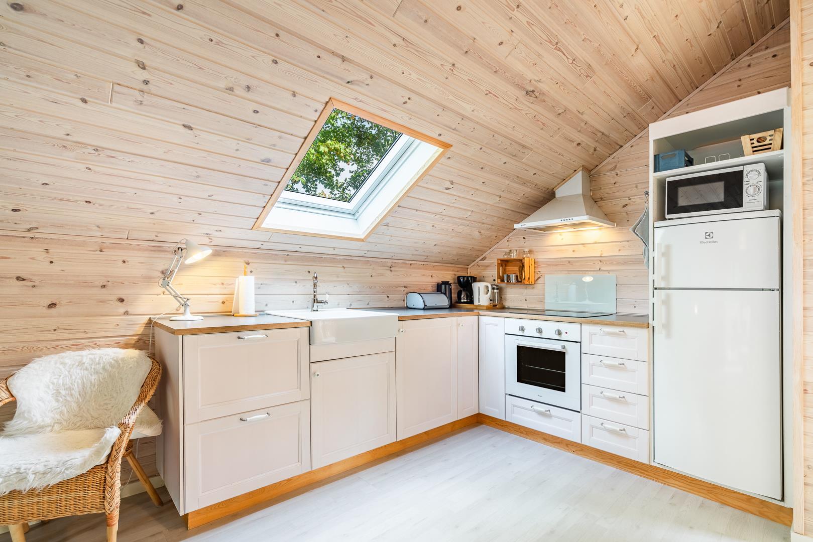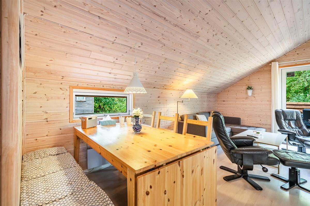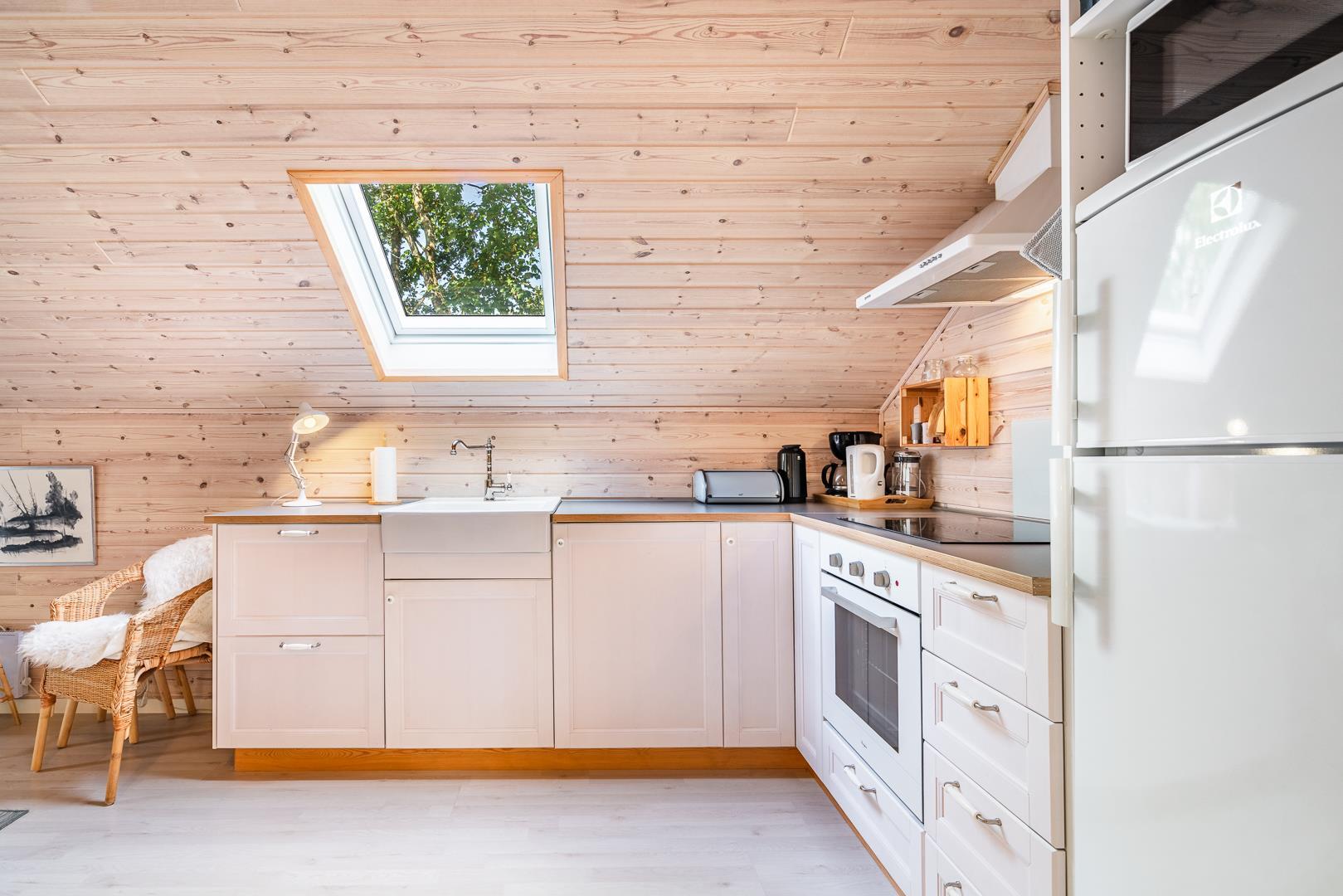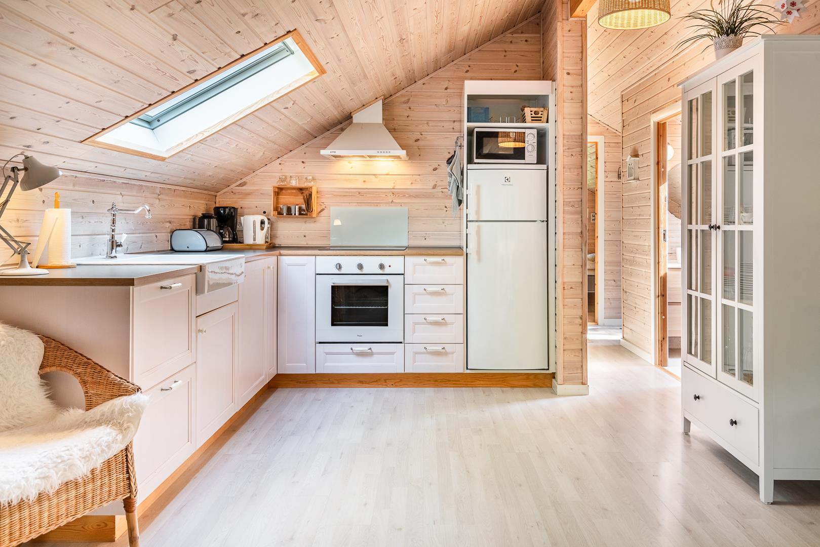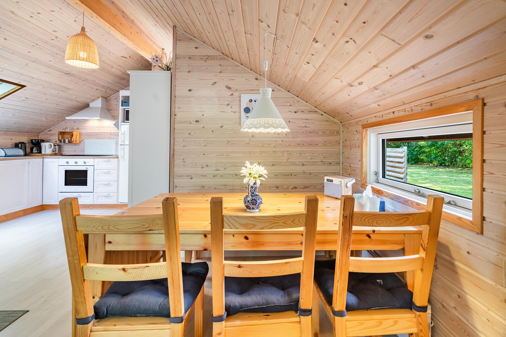 Die offene Küche ist praktisch und modern ausgestattet und verfügt über eine Spülmaschine, sodass im Urlaub mehr Zeit für Erholung bleibt. Durch die offene Gestaltung bist du auch beim Kochen immer mitten im Geschehen. Der angrenzende Essbereich lädt zu gemeinsamen Mahlzeiten und gemütlichen Ferienhausmomenten ein.