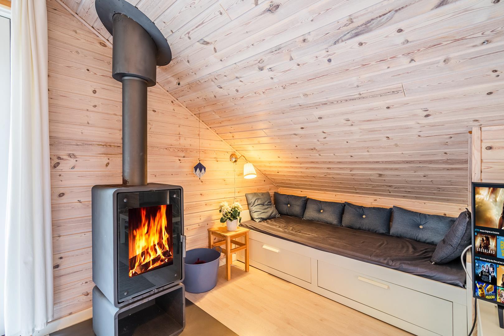 Das gemütliche Wohnzimmer mit Kamin bildet das Herzstück des Ferienhauses. Hier kannst du nach einem Tag an der Nordsee entspannen, ein Buch lesen oder gemeinsame Abende mit der Familie verbringen. Der Kamin sorgt für echtes Hygge-Gefühl, während die energiesparende Wärmepumpe ganzjährig für ein angenehmes Raumklima sorgt.